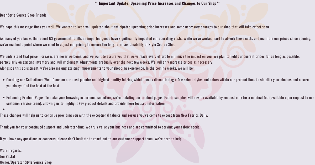 Based in Los Angeles, CA, New Fabrics Daily is owned and operated by two long-time textile industry professionals that have been selling online in various iterations since 2006. We offer quality fabrics at affordable prices. All our fabrics are guaranteed to be brand new, well-cut and will come in secure packaging.