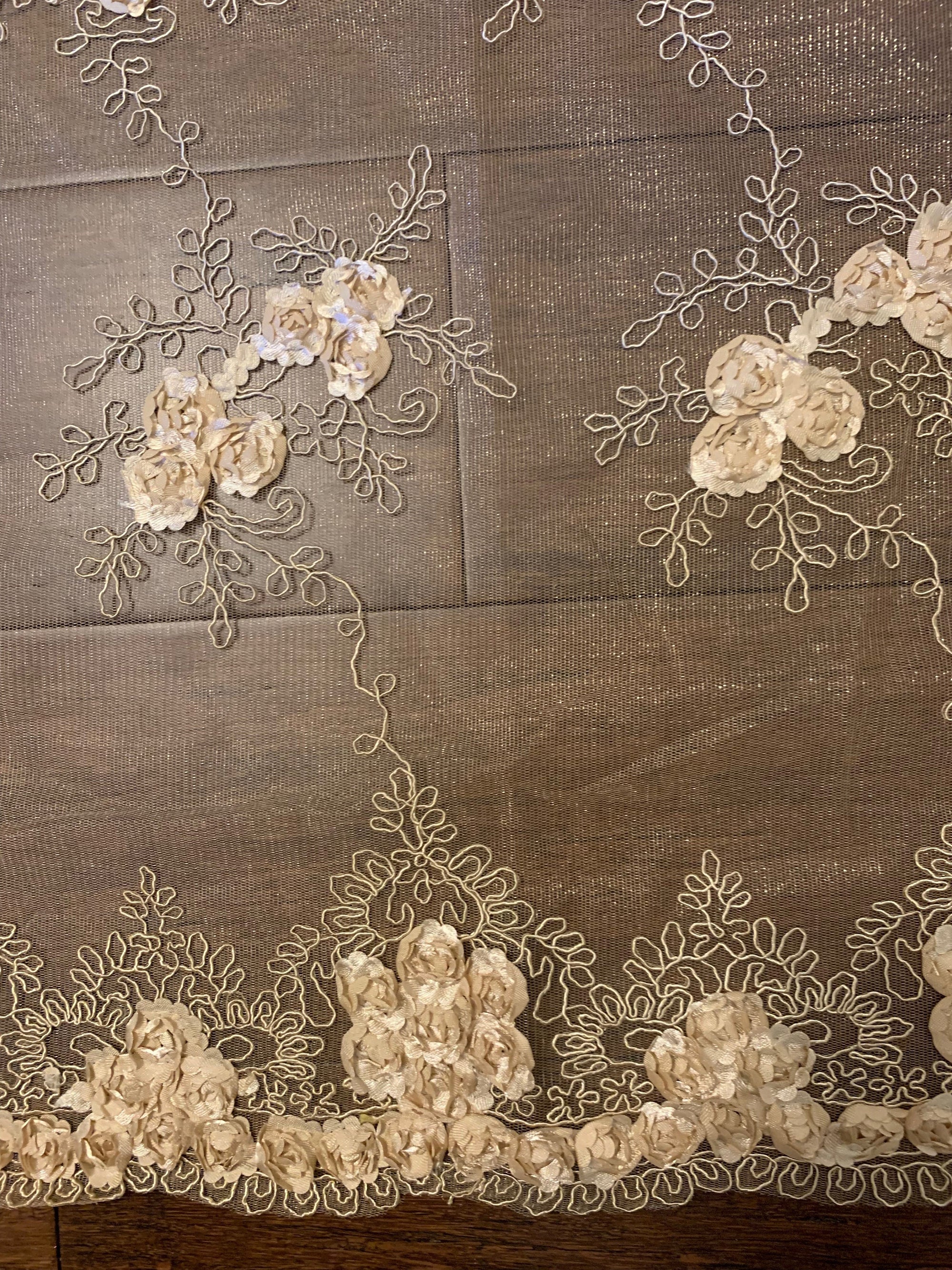 In this design, a luxurious cording winds through clusters of meticulously folded roses on mesh fabric. The sheer lace fabric has a matte finish that makes it the perfect overlay for lustrous satin or organza and a perfect bridal lace fabric that is truly one of a kind.