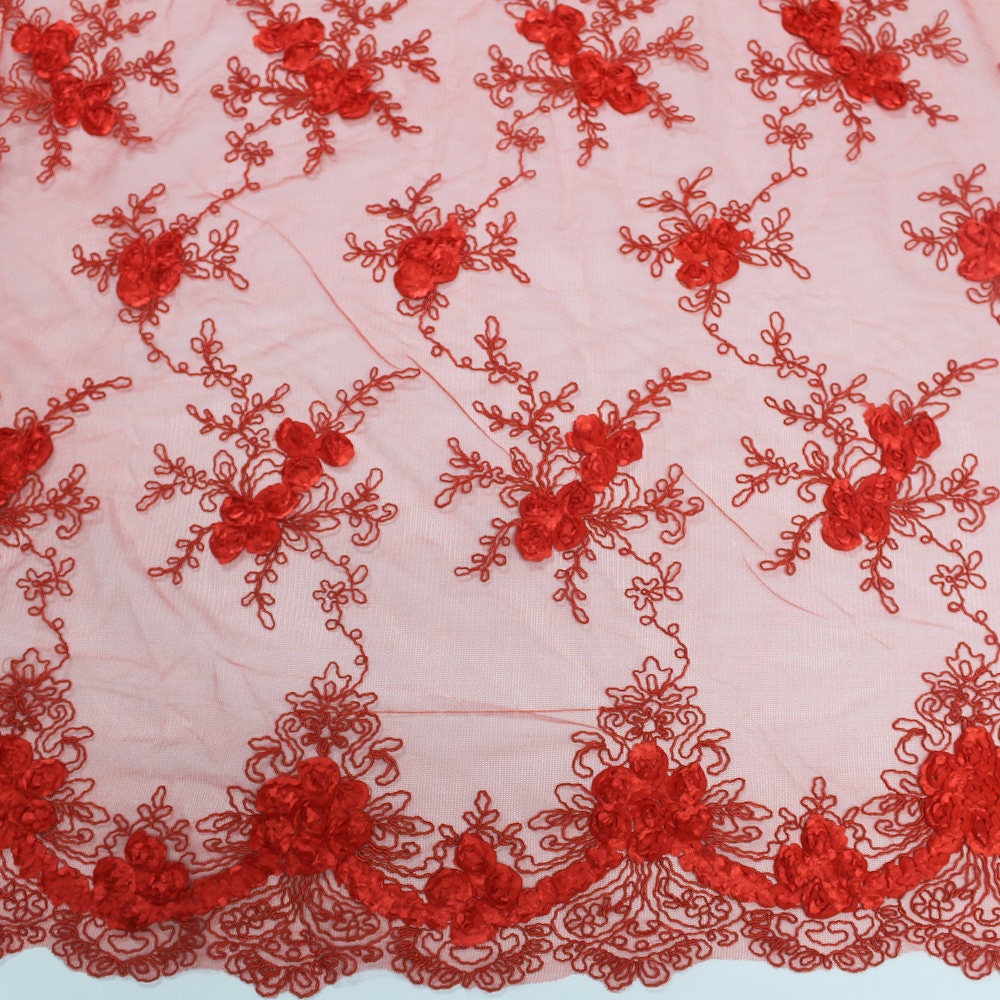 Andrea RED 3-D Floral Matte Corded Embroidery on Mesh Lace Fabric by the Yard - 10016