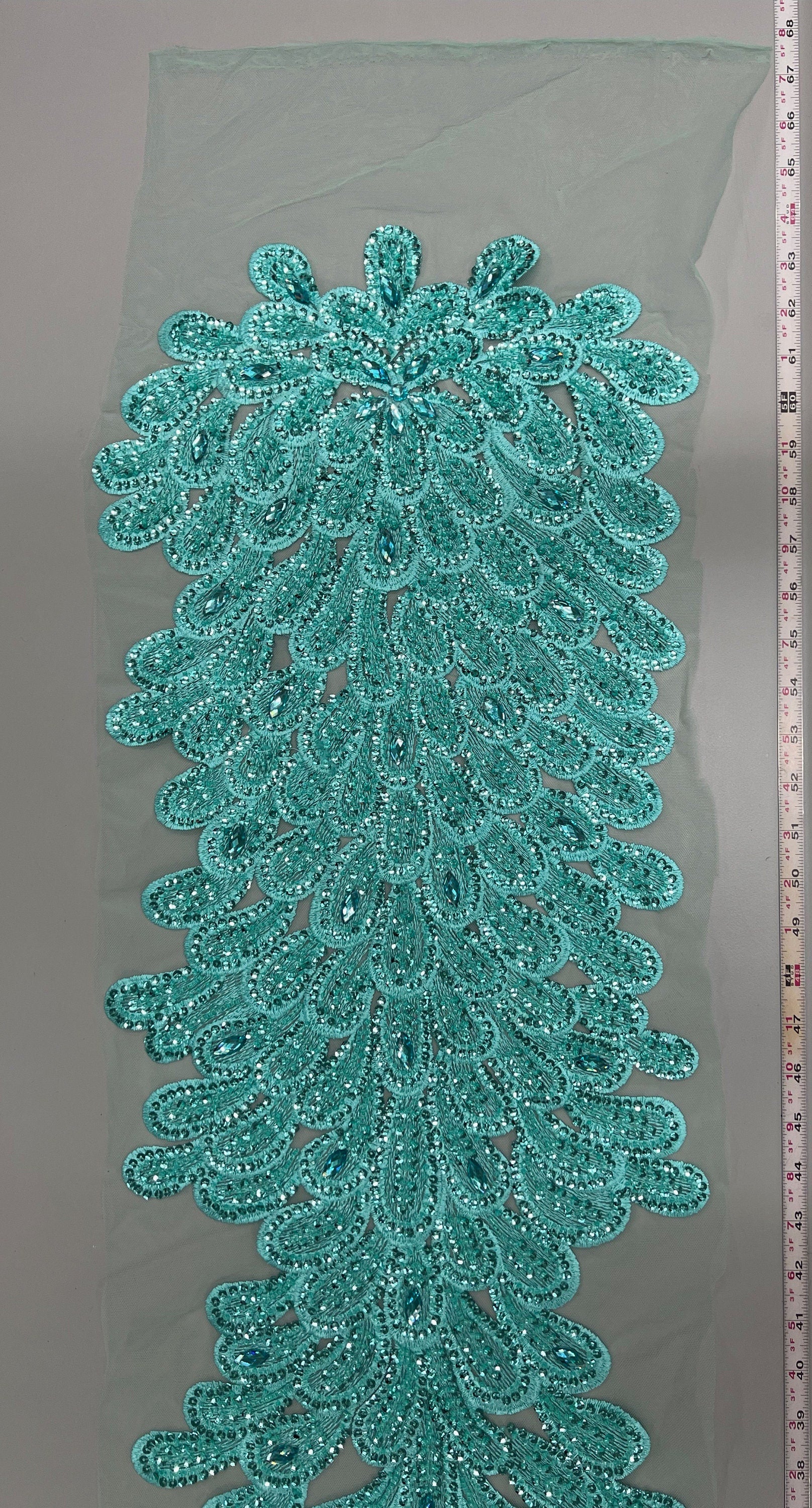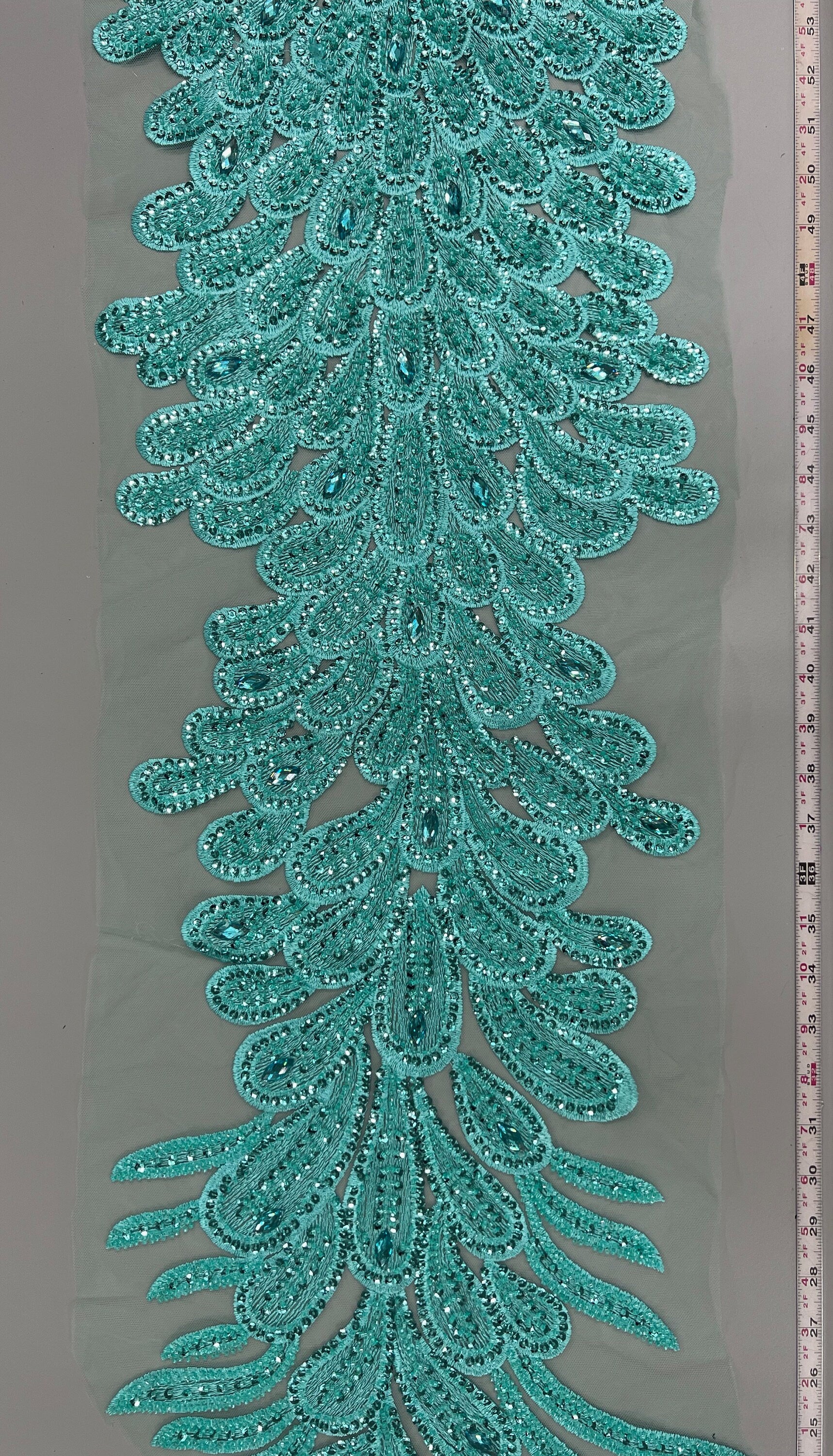 Angela AQUA Vegas Peacock Beaded Sequins Embroidered on Mesh Lace Fabric by Panel - 10227