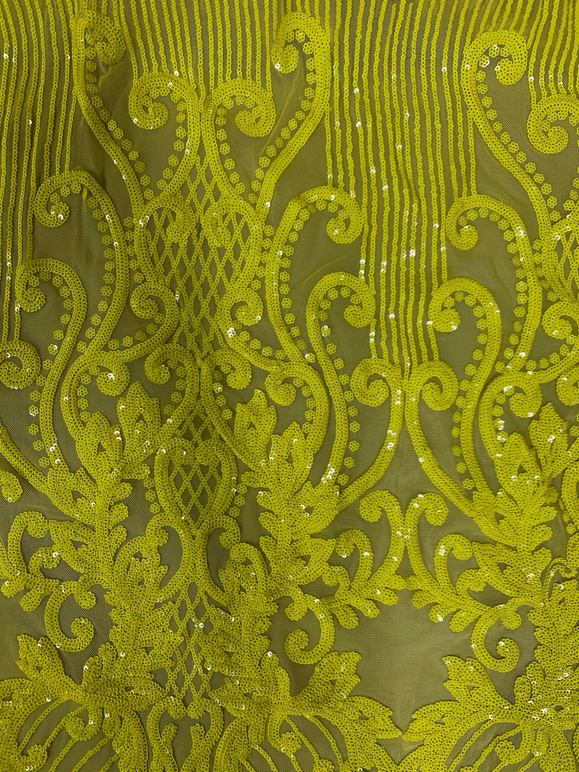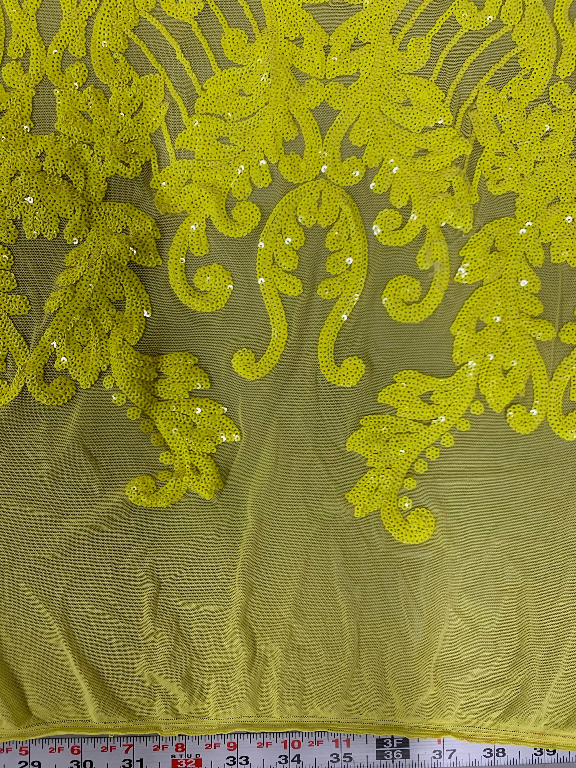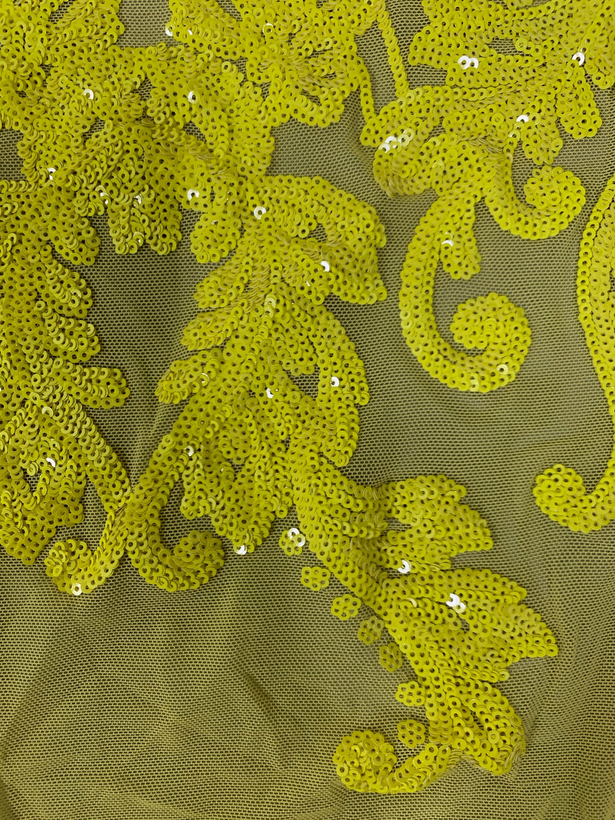 Angelica BRIGHT YELLOW Curlicues and Leaves Sequins on Mesh Lace Fabric by the Yard - 10132