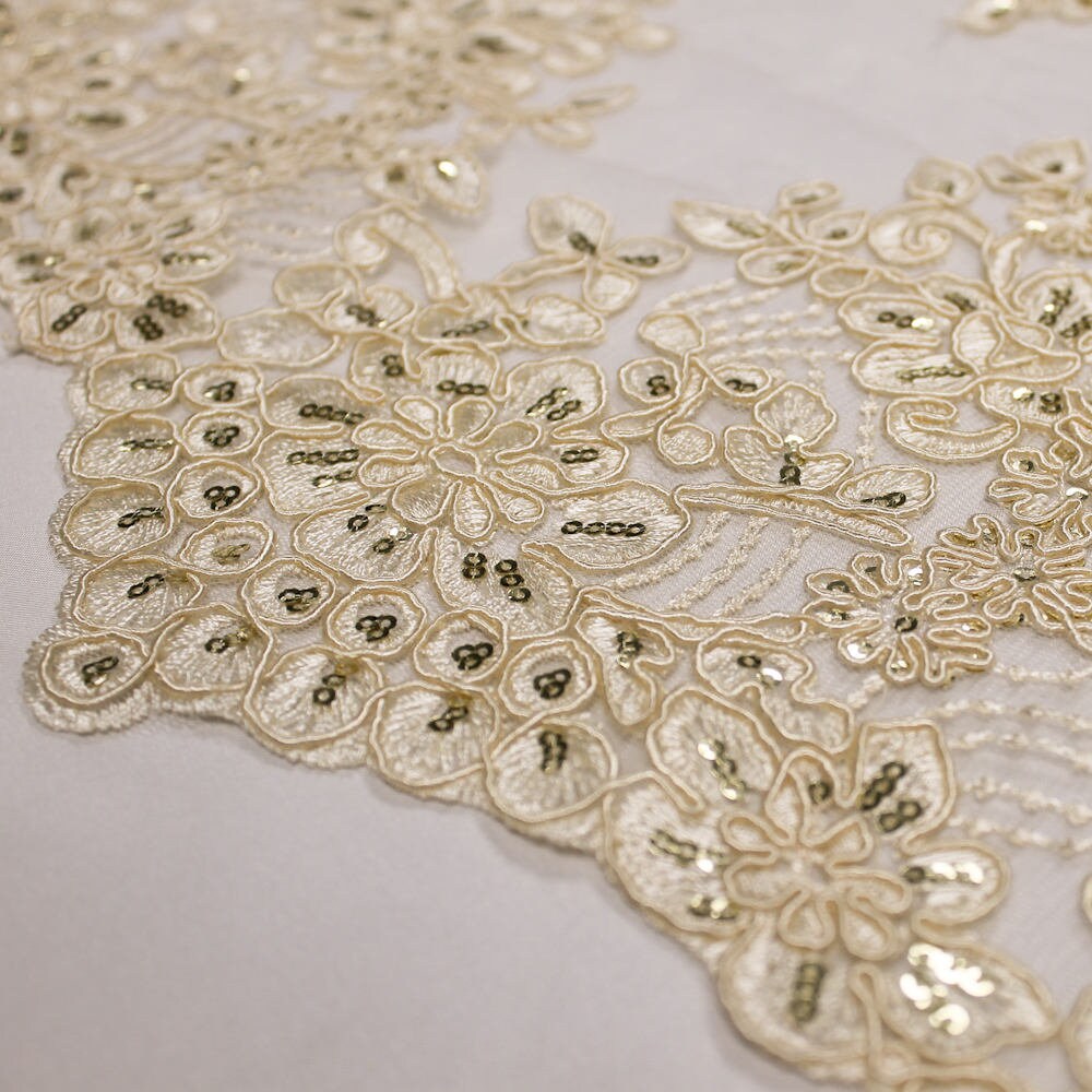 Content: 100% polyester Stretch: Minimal to none Width: 50 to 52 inches Edge: Scalloped on both edges Uses: Wedding dress, evening gown, formal wear, tops, skirts, costumes, crafts, etc.