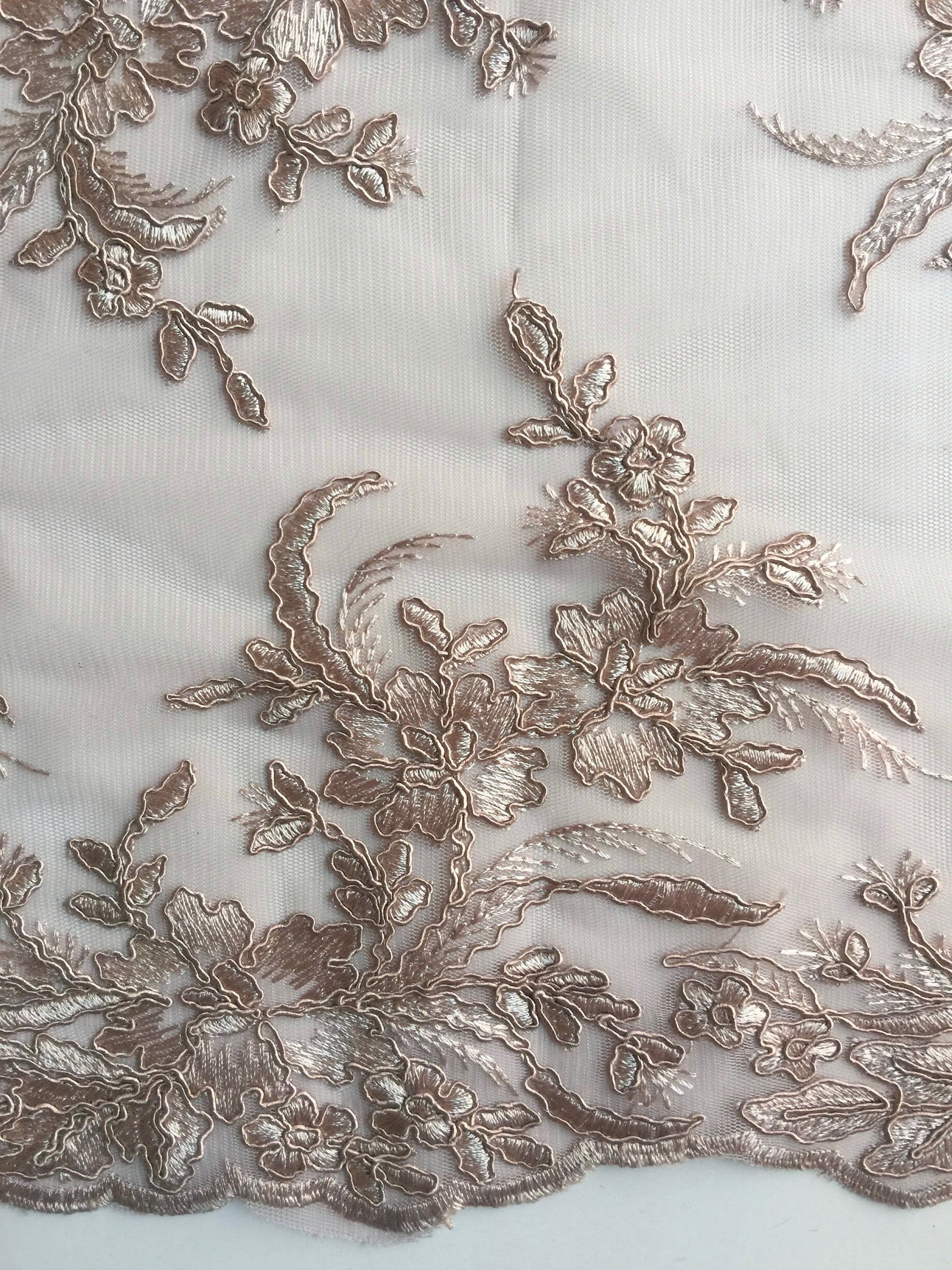 Corded floral lace embroidery on mesh fabric. The corsage pattern adds a touch of sweetness and the scalloped edges give just enough detail to this fabric.