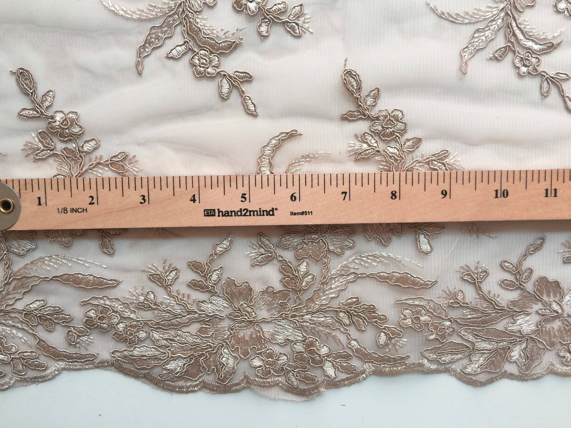 Content: 100% polyester Stretch: Minimal to none Width: 50 to 52 inches Edge: Scalloped on both edges Uses: Wedding dress, evening gown, formal wear, tops, skirts, dresses, costumes, appliqué, crafts, etc.