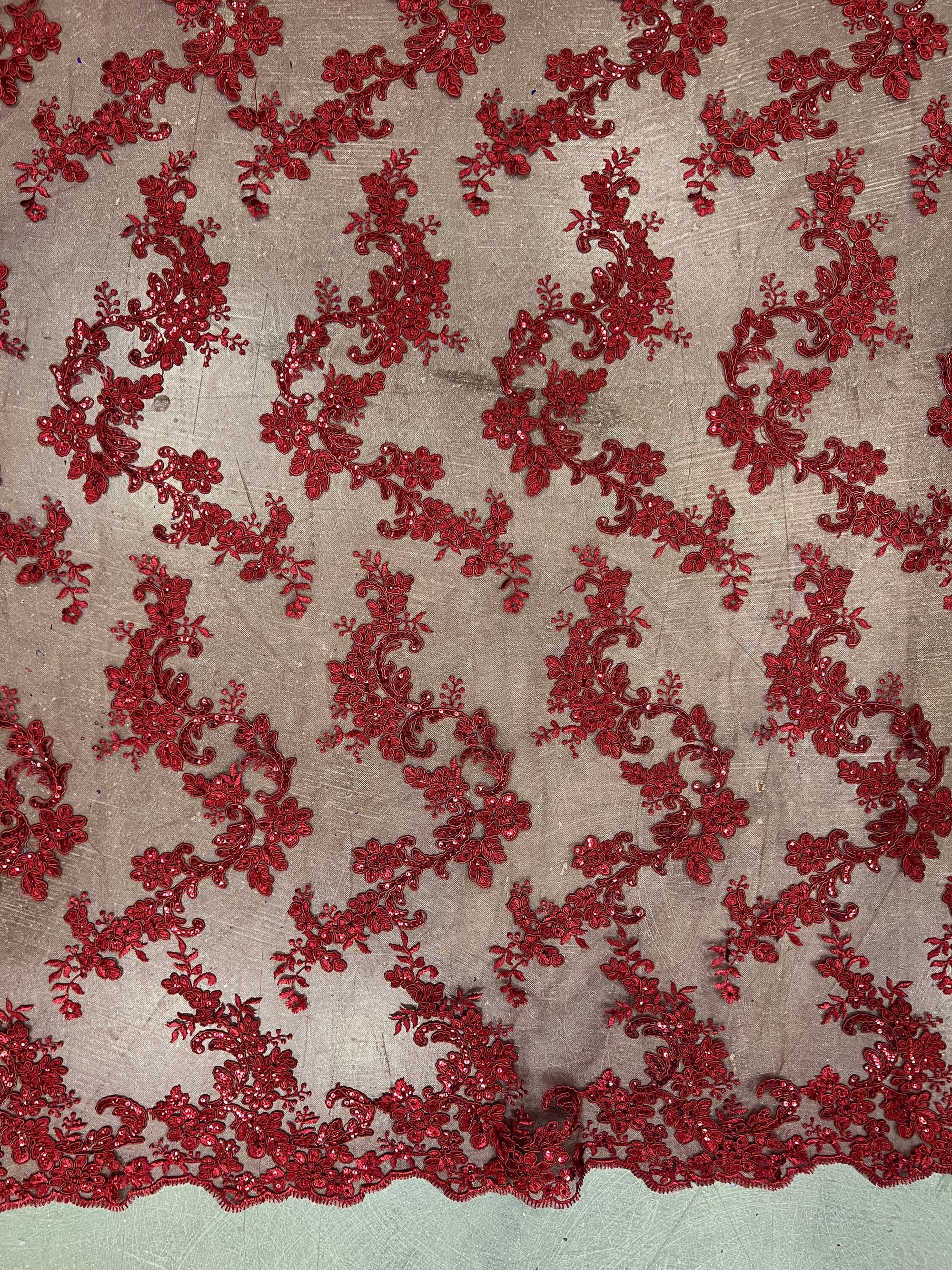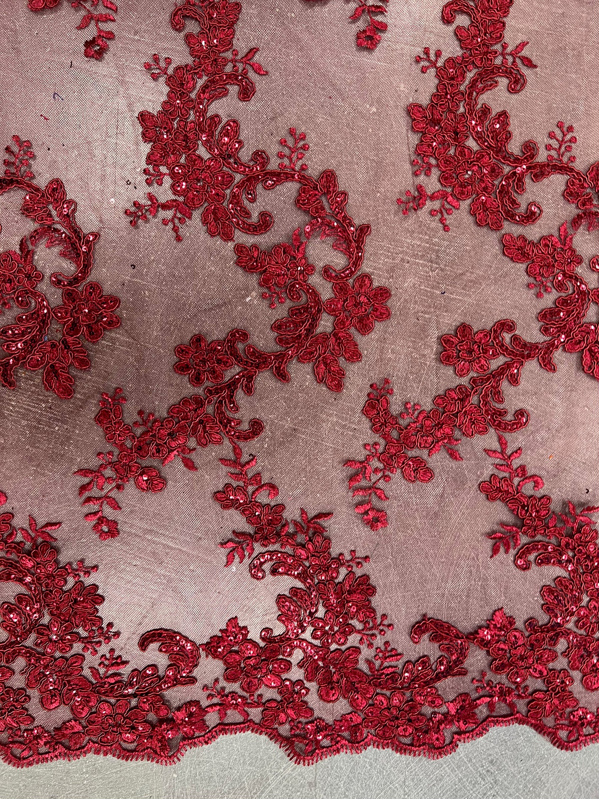 Cristina BURGUNDY Polyester Floral Embroidery with Sequins on Mesh Lace Fabric by the Yard for Gown, Wedding, Bridesmaid, Prom - 10076
