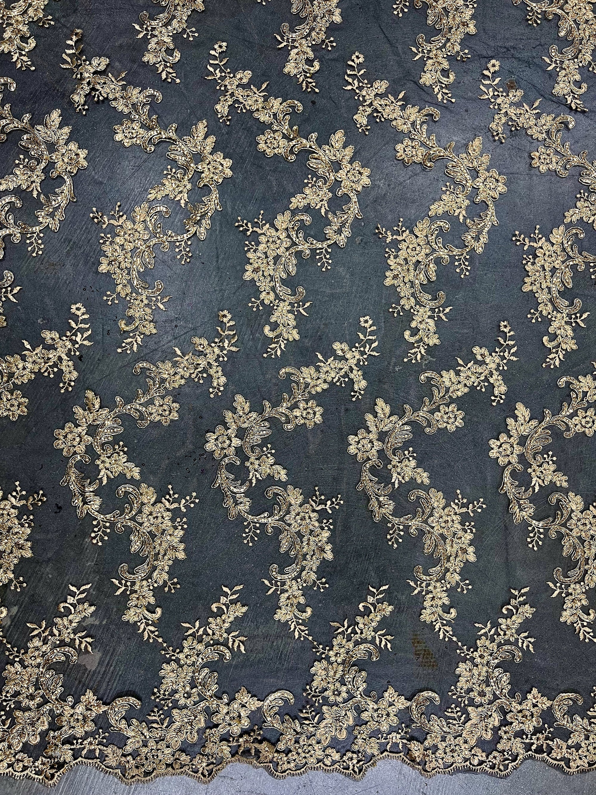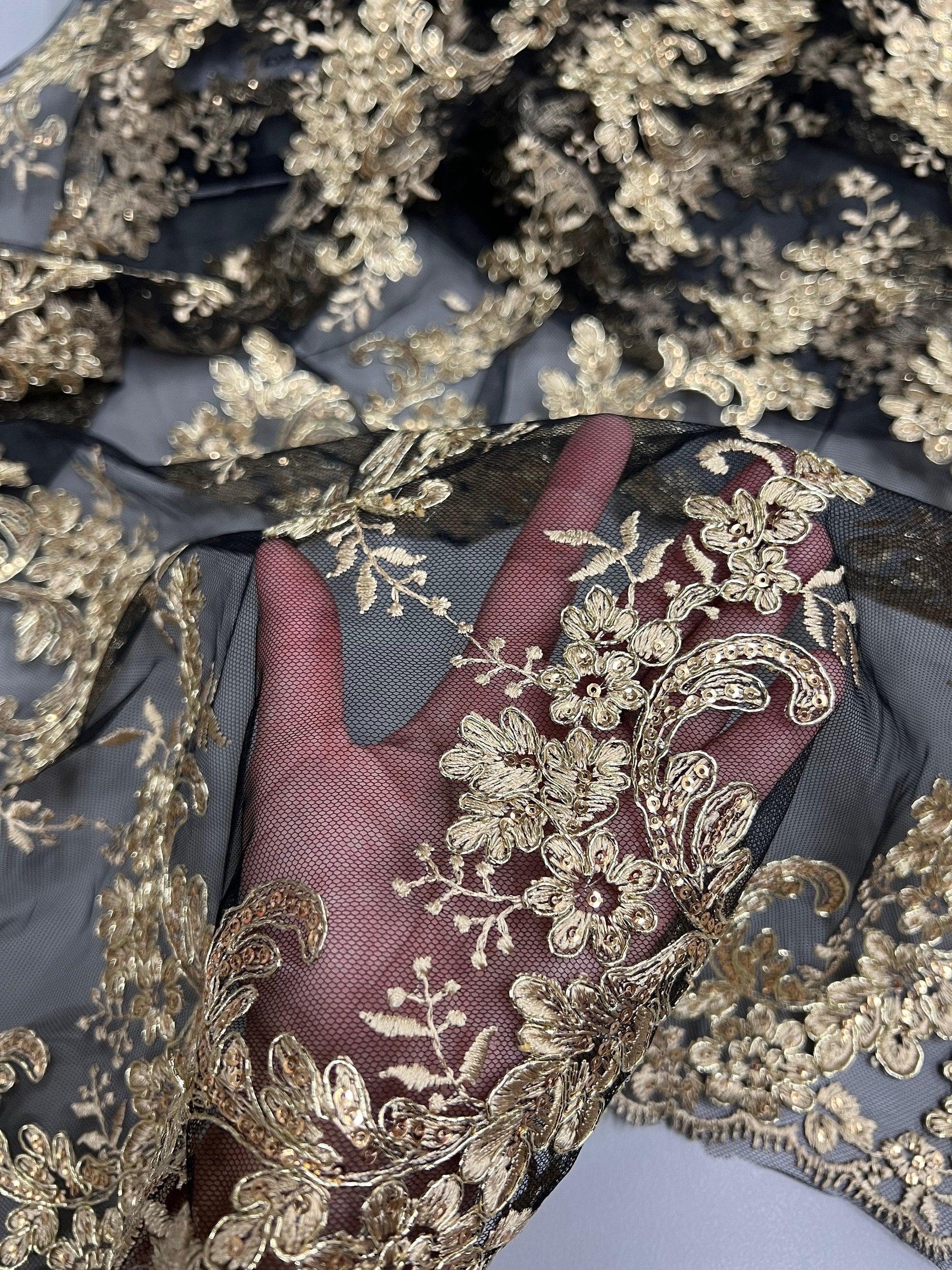 Cristina GOLD Polyester Floral Embroidery with Sequins on BLACK Mesh Lace Fabric by the Yard for Gown, Wedding, Bridesmaid, Prom - 10076