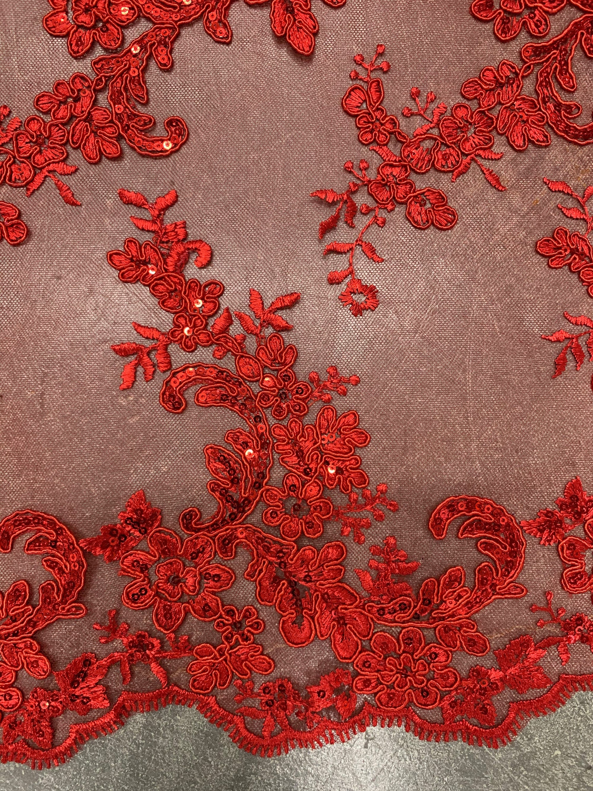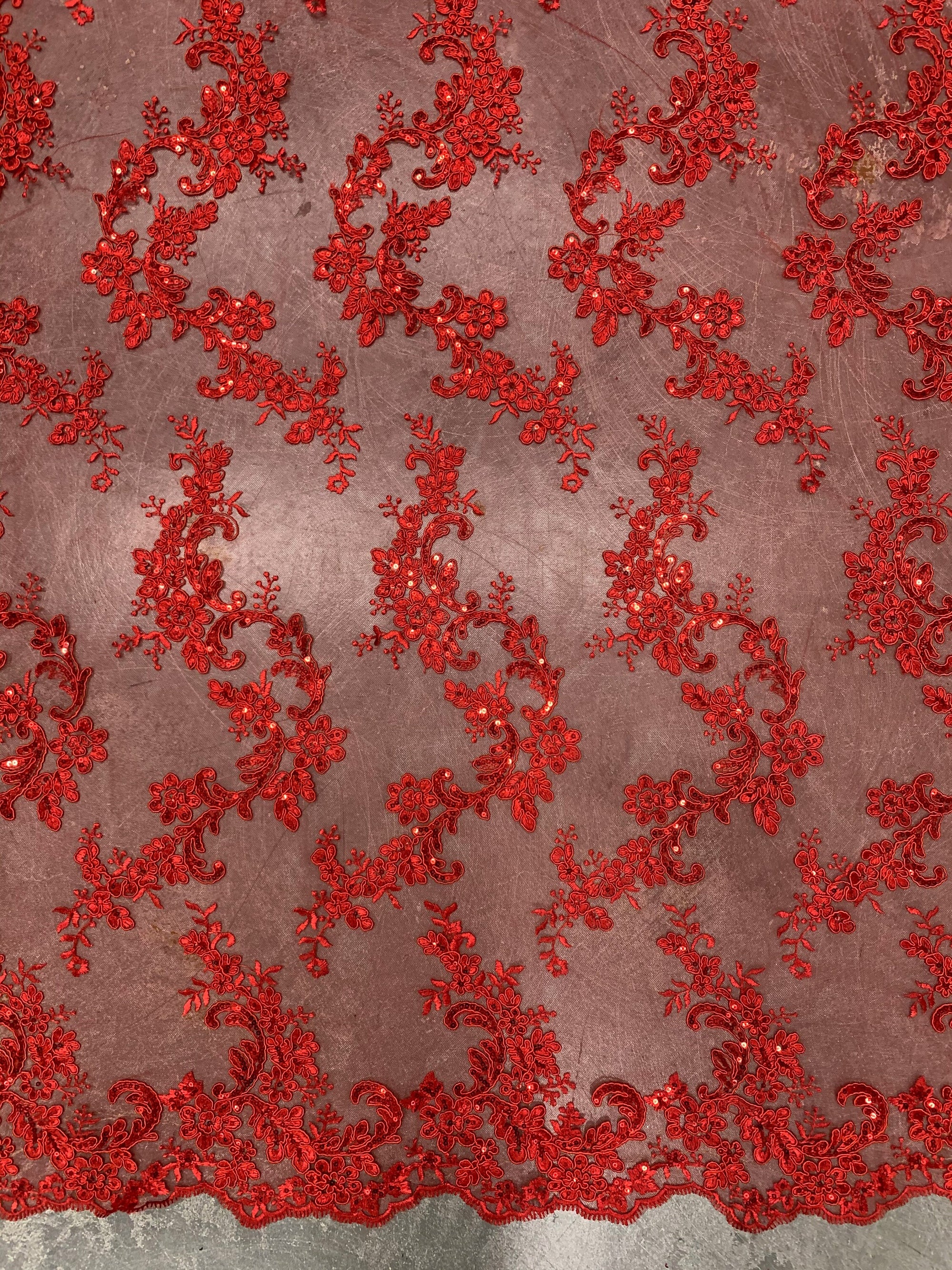Cristina RED Polyester Floral Embroidery with Sequins on Mesh Lace Fabric by the Yard for Gown, Wedding, Bridesmaid, Prom - 10076
