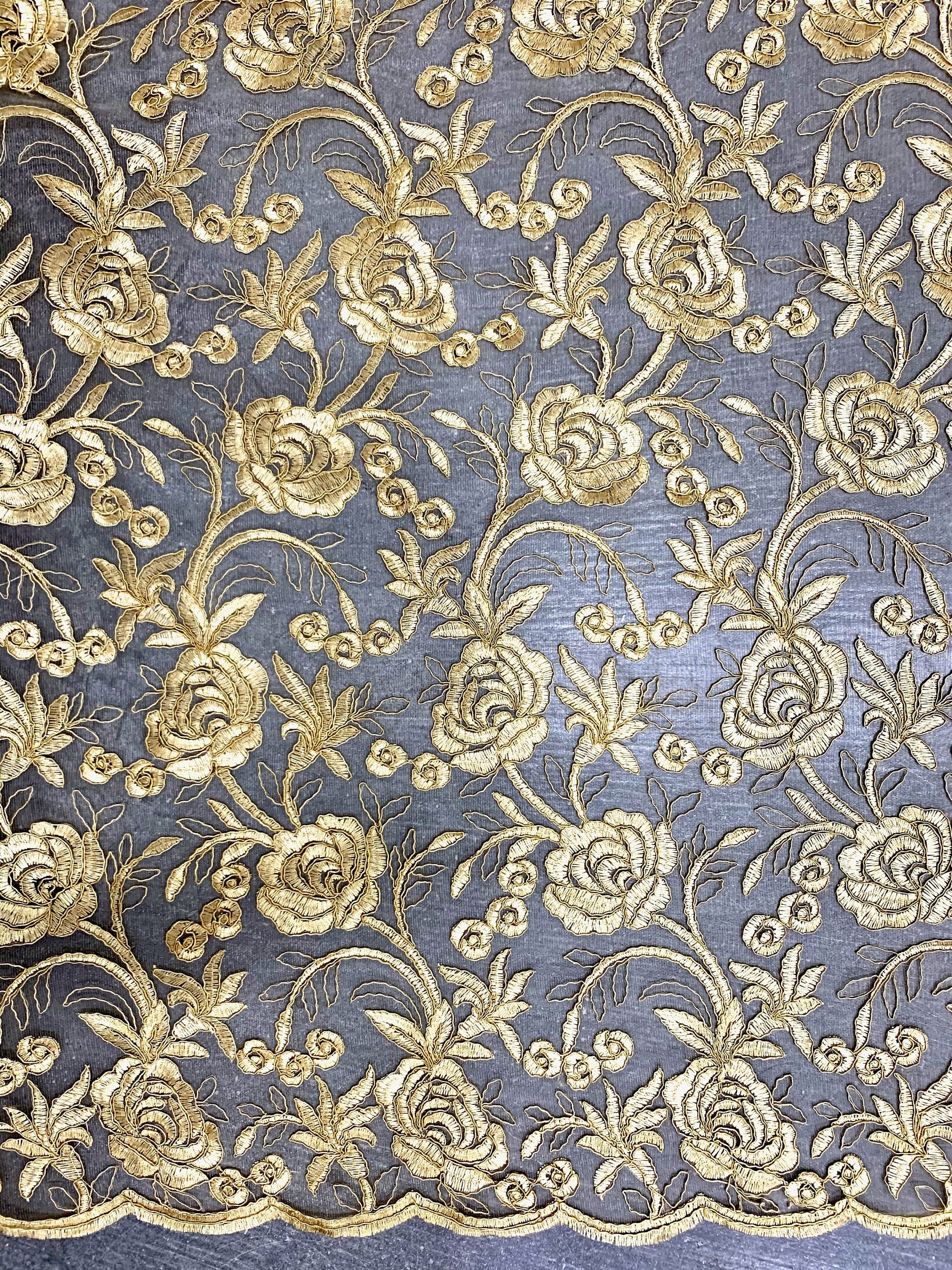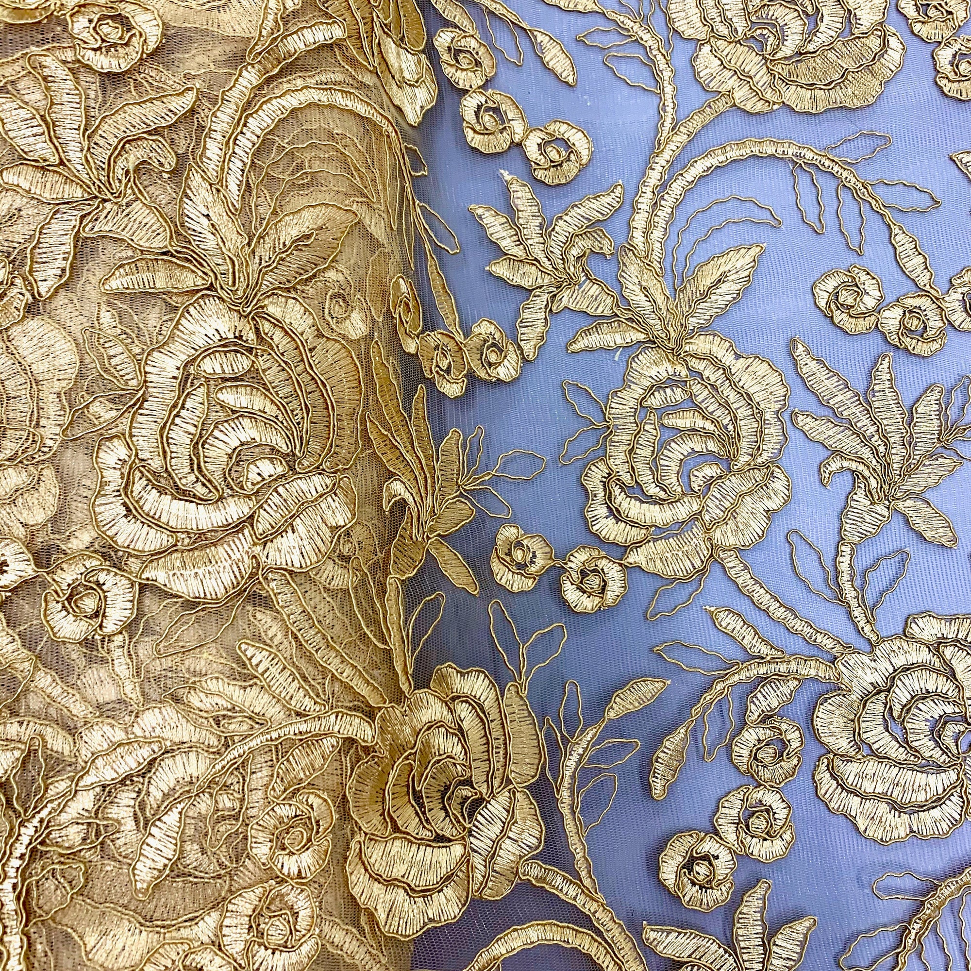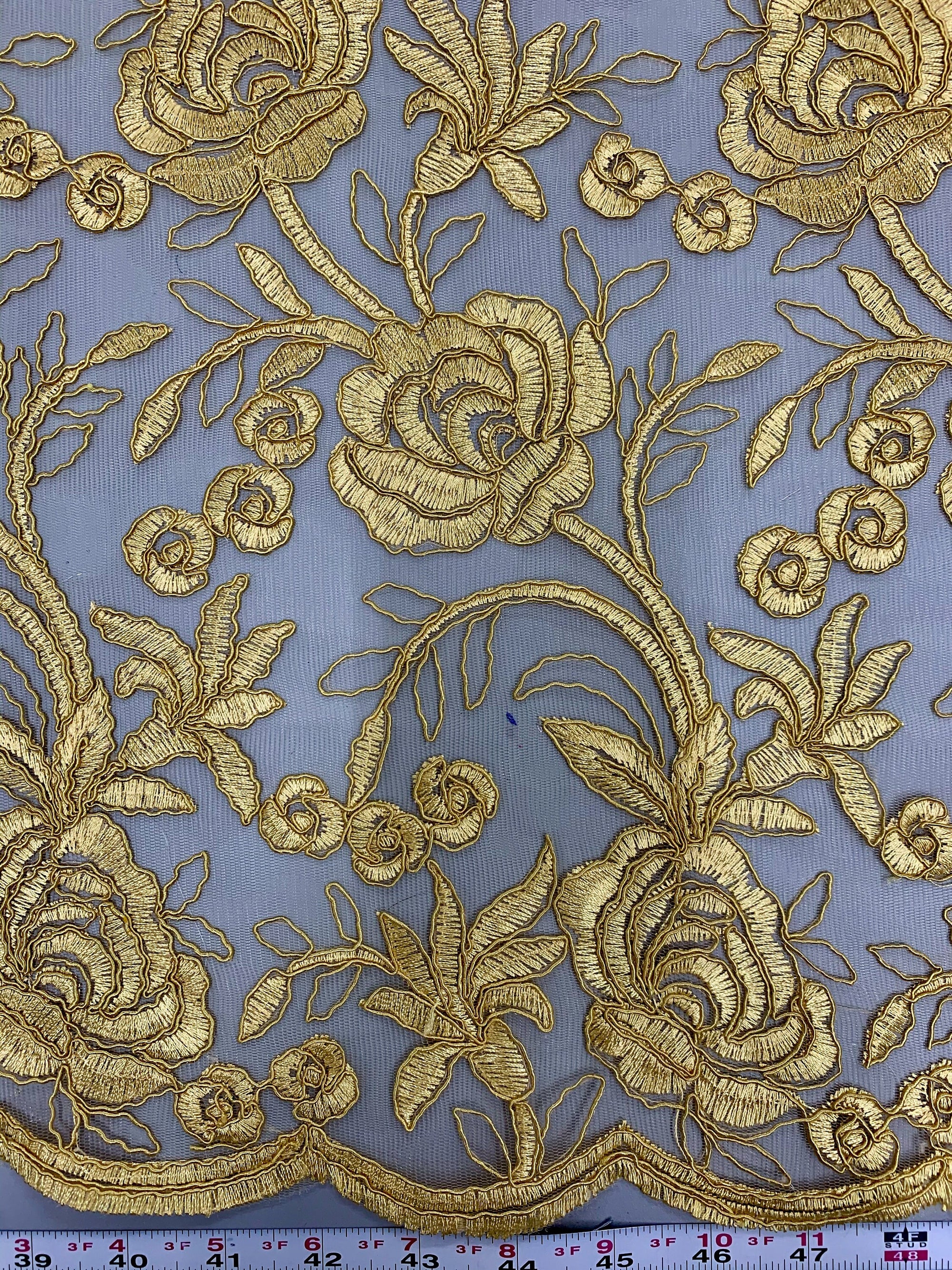 Dakota GOLD Polyester Corded Floral Embroidery on Mesh Lace Fabric by the Yard - 10043