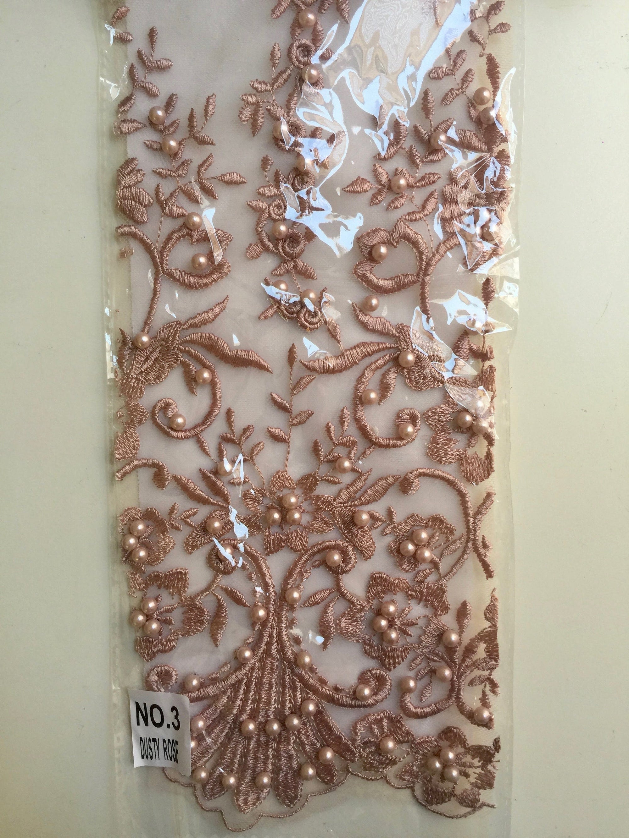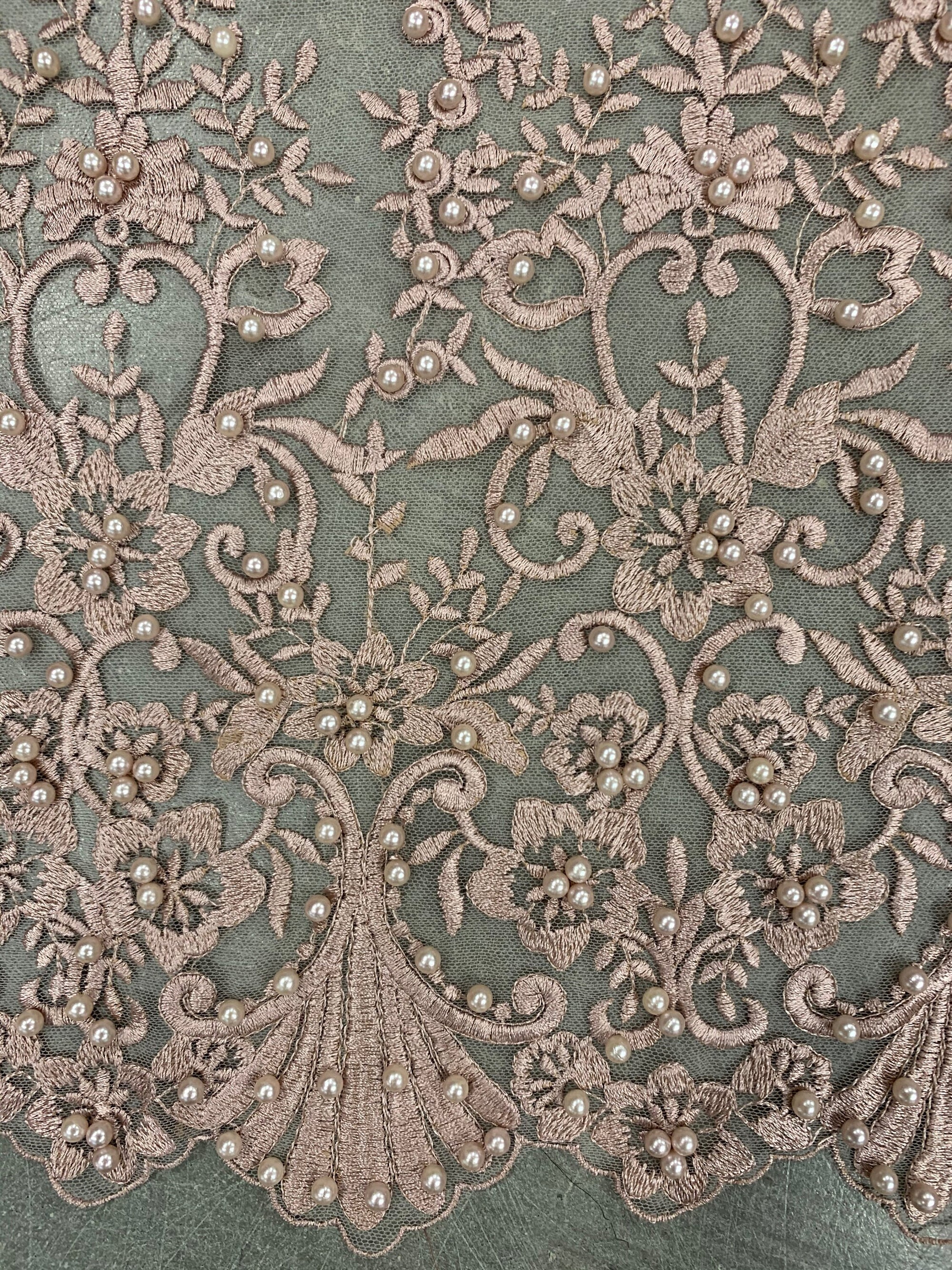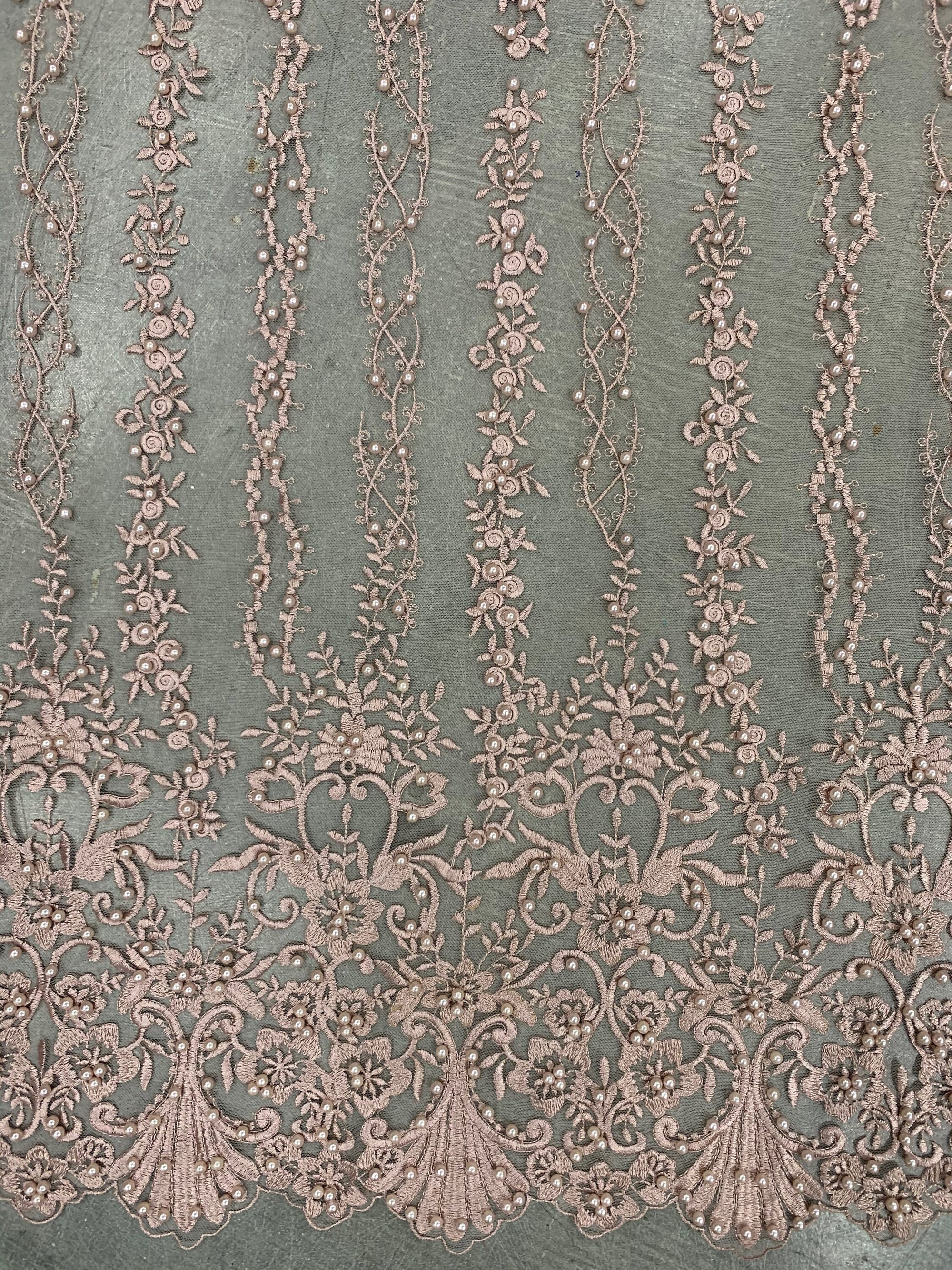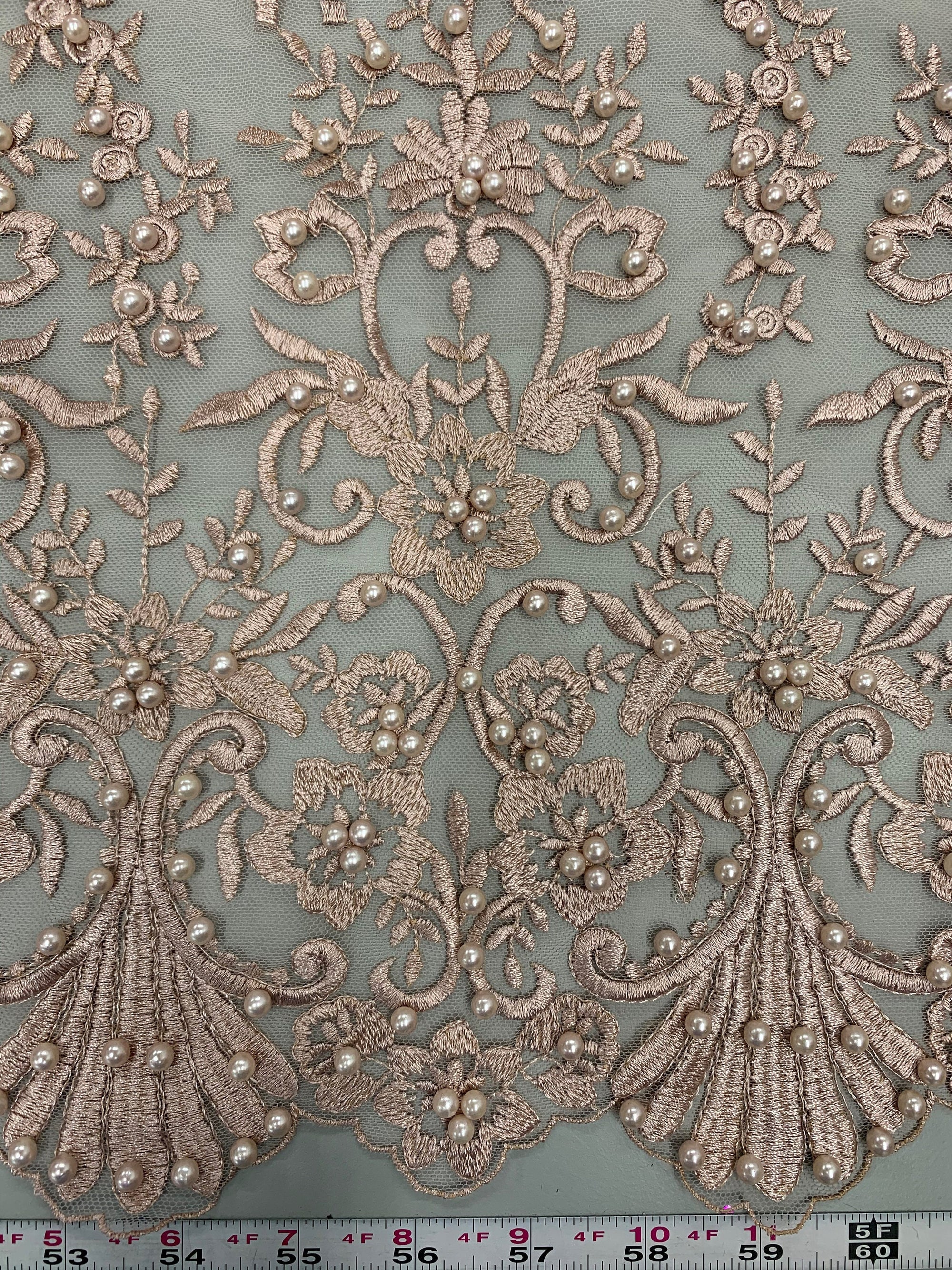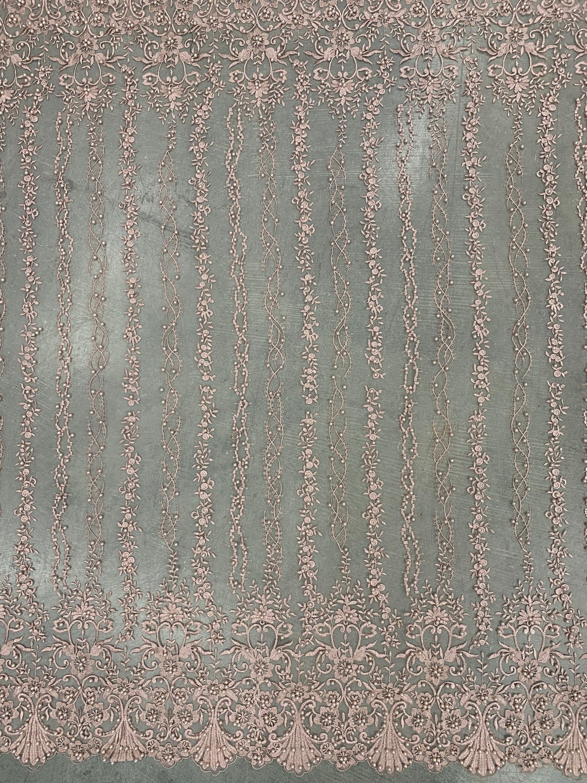 Daphne DUSTY ROSE Faux Pearls Beaded Flowers and Vines Lace Embroidery on Mesh Fabric by the Yard - 10103