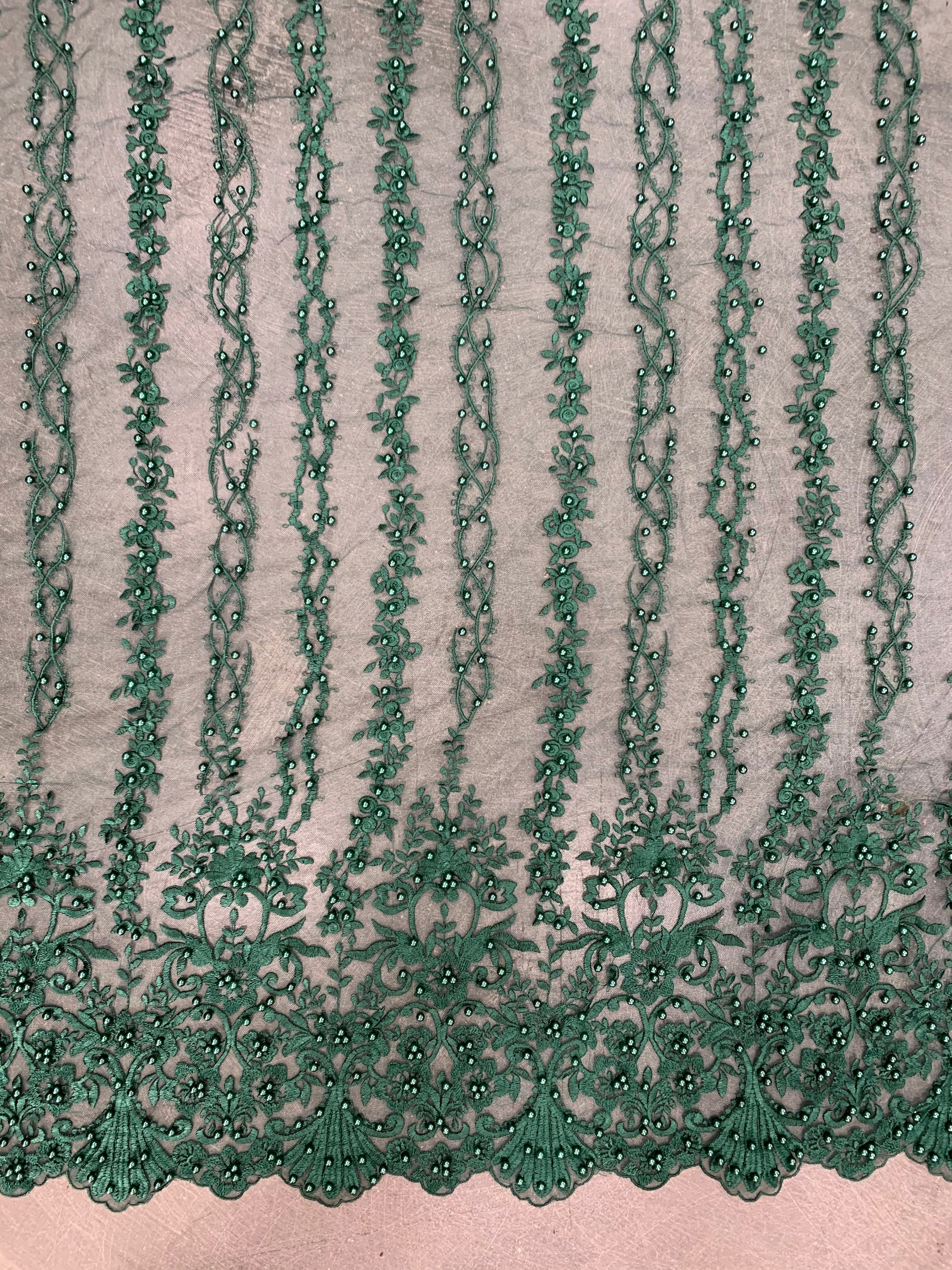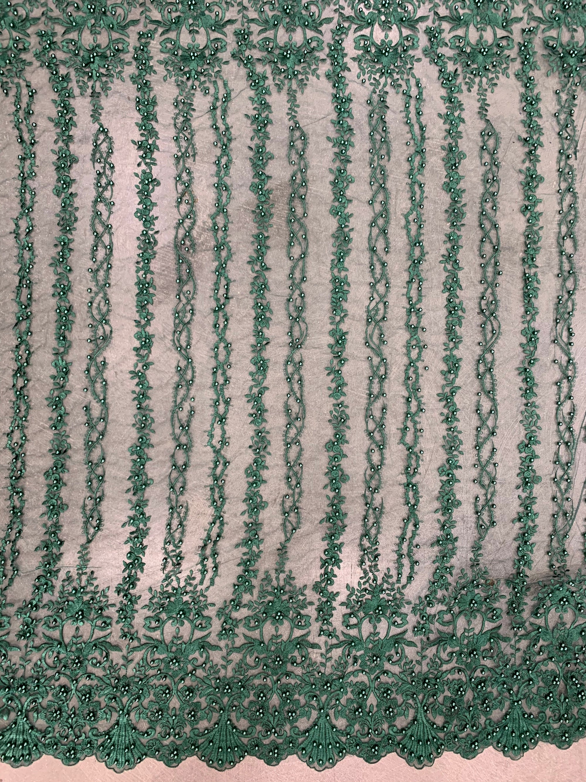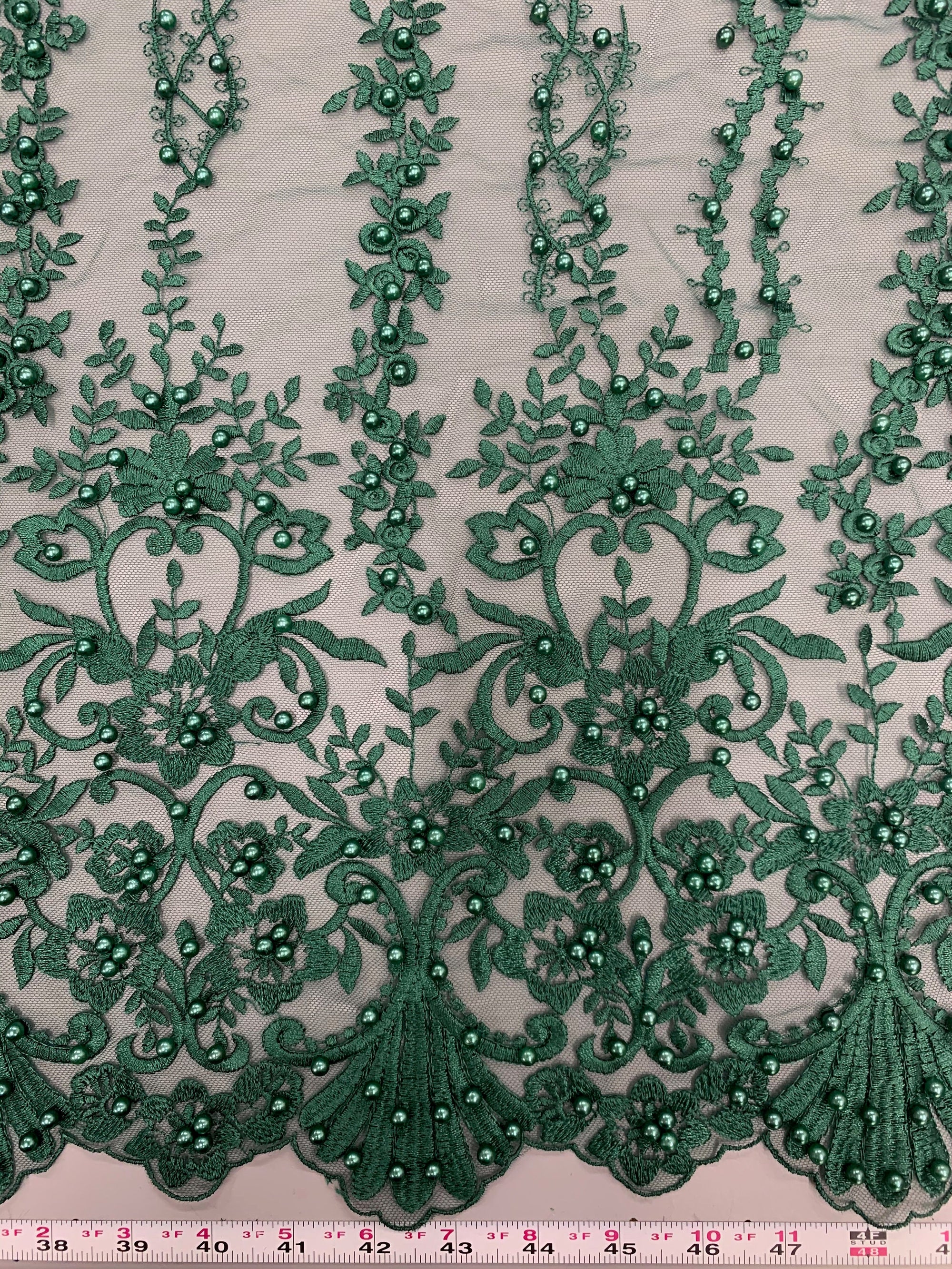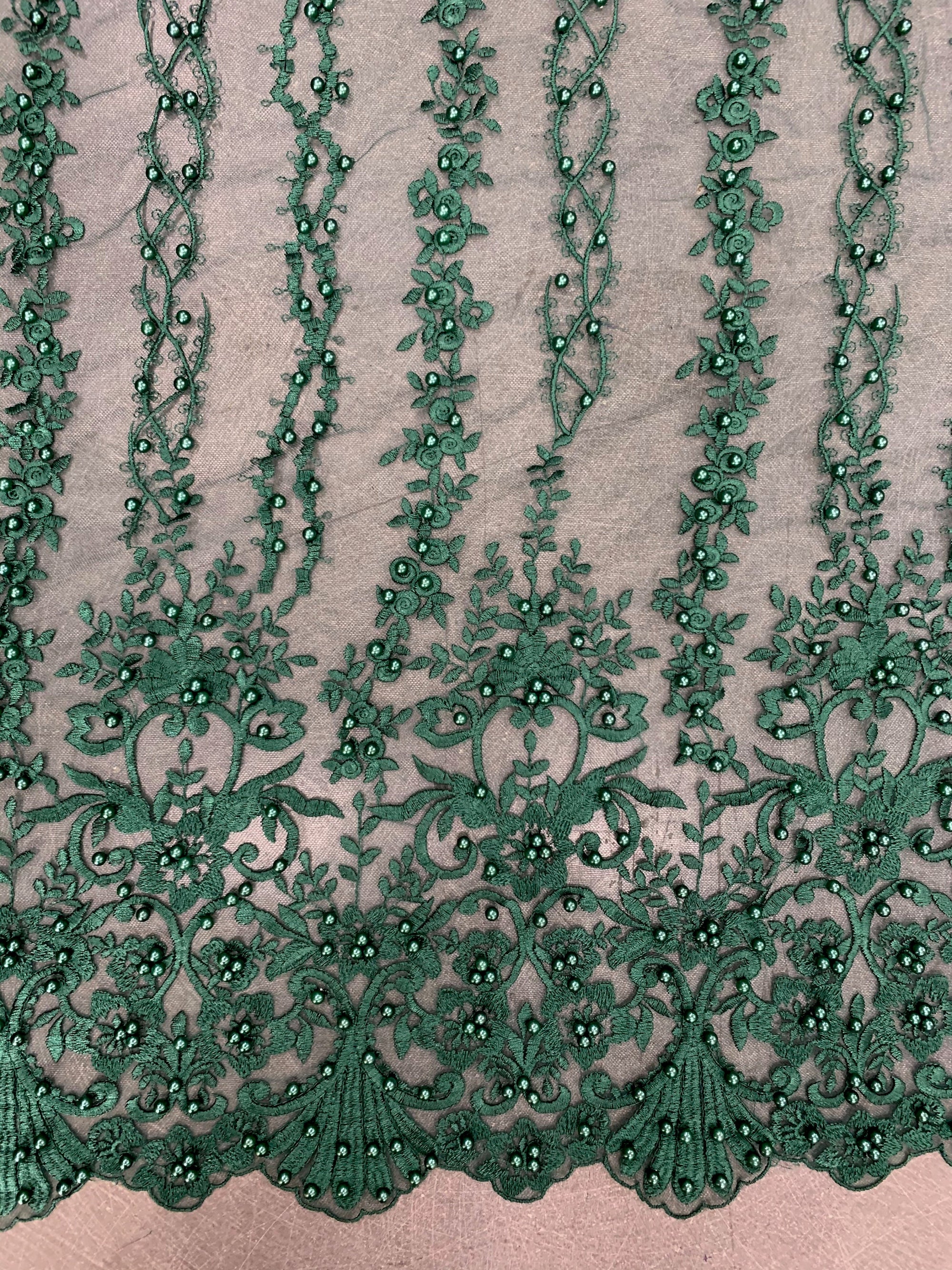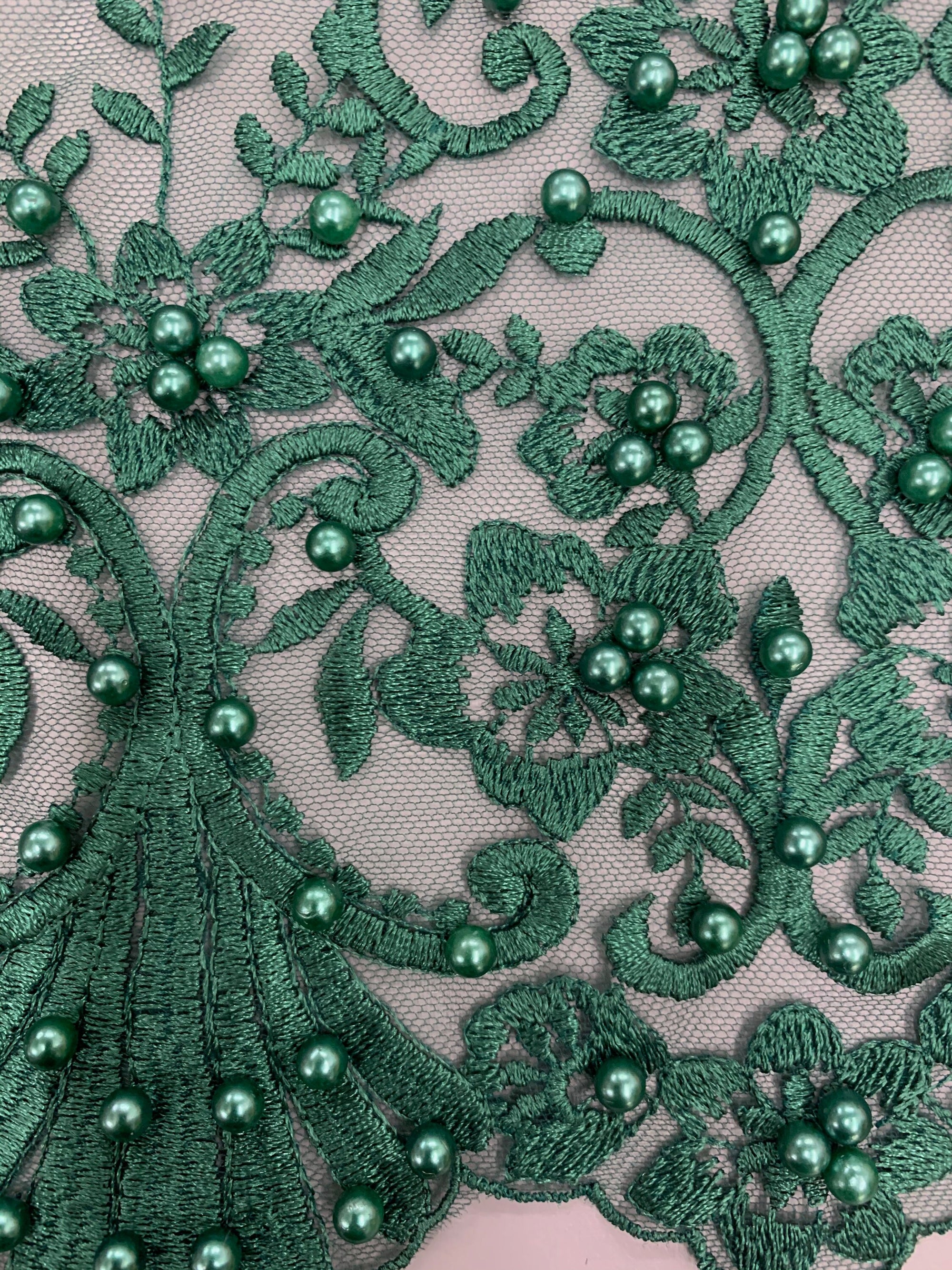 Daphne HUNTER GREEN Faux Pearls Beaded Flowers and Vines Lace Embroidery on Mesh Fabric by the Yard - 10103