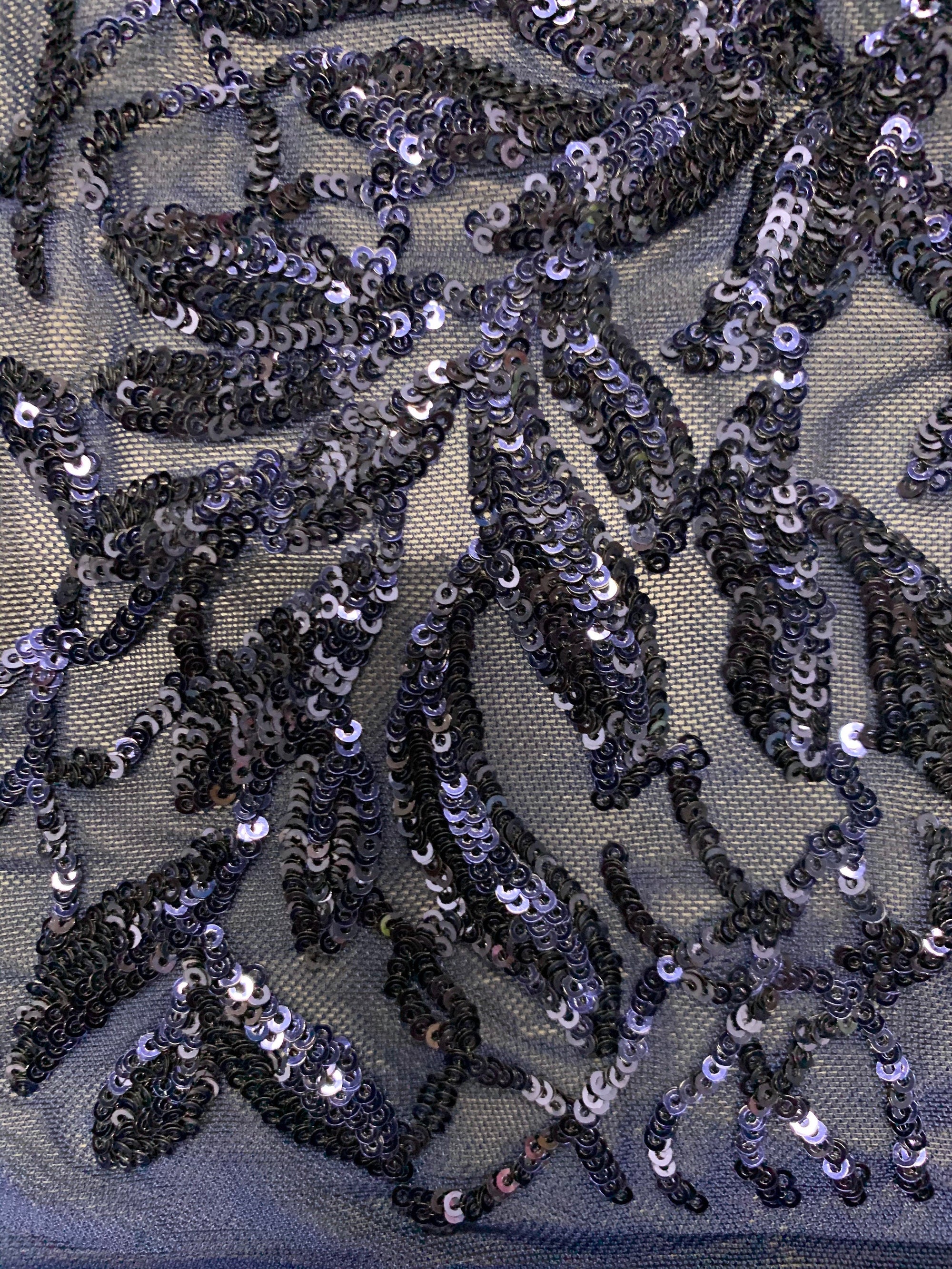 ["costumes","evening gown","formal wear","frances sequin lace","lace by the yard","lace fabric","lace mesh","navy sequin on mesh","sequin on mesh","sequins by yard","sequins lace on mesh","sparkling sequins","vines leaves sequin"]
