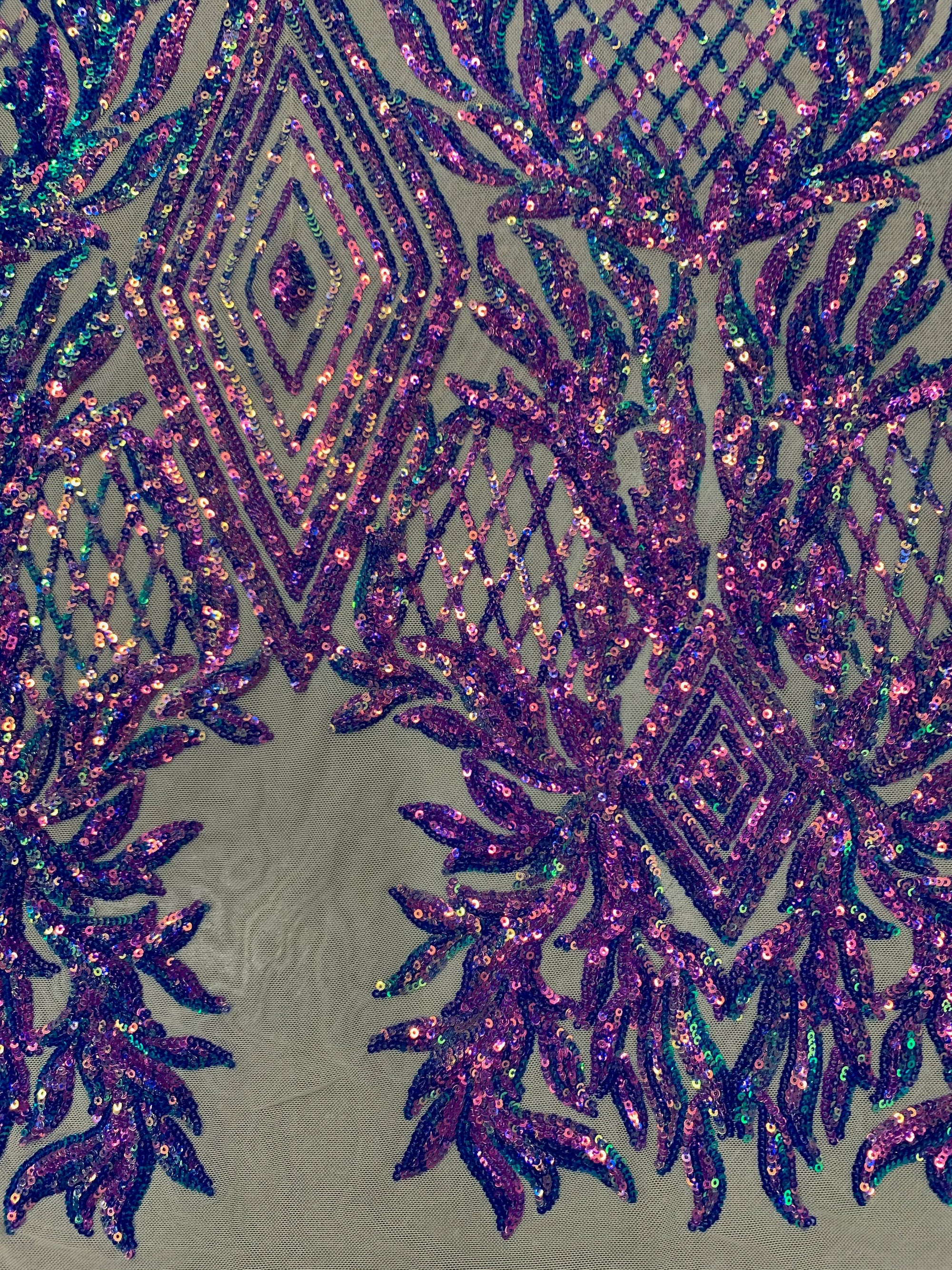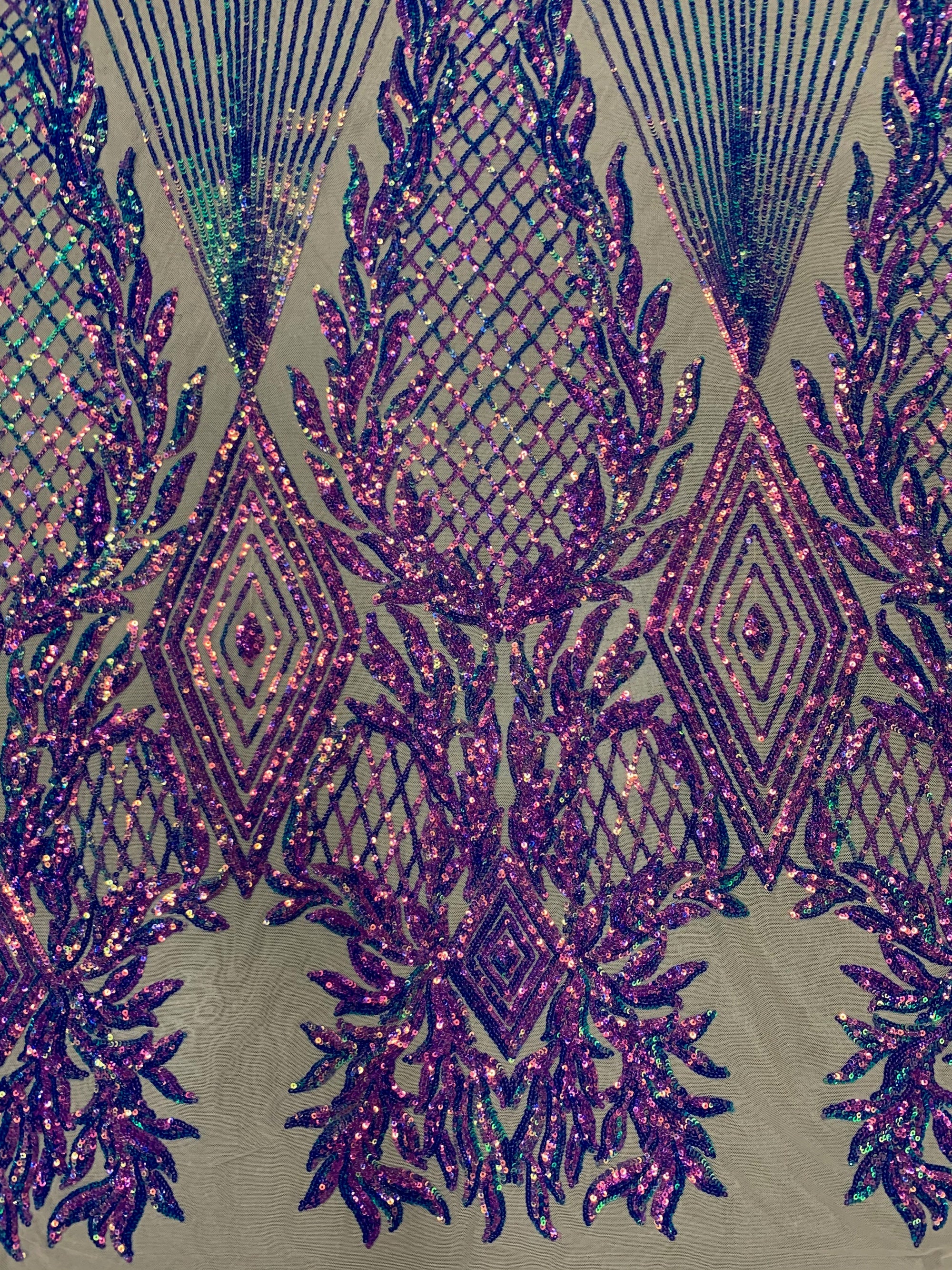 Francesca IRIDESCENT PURPLE Vines and Diamonds Pattern Sequins on NUDE Mesh Lace Fabric by the Yard - 10130
