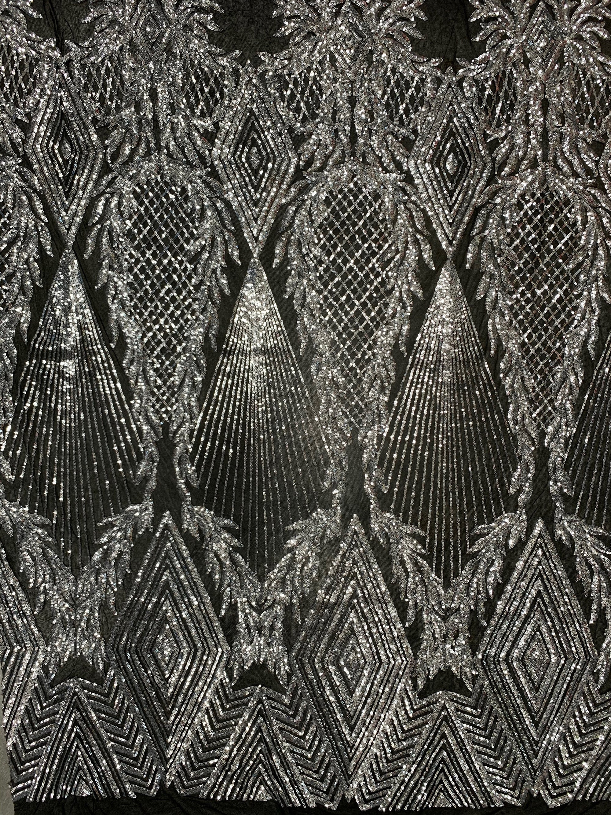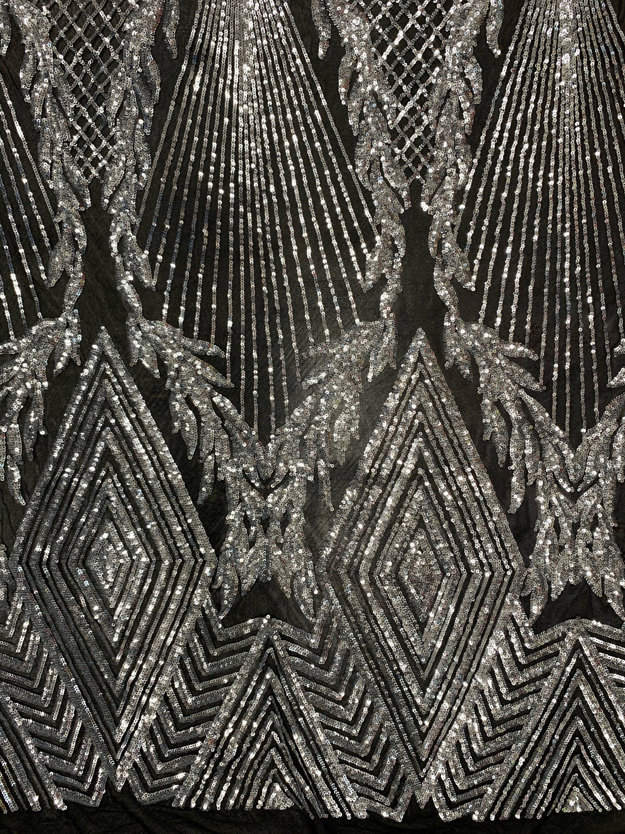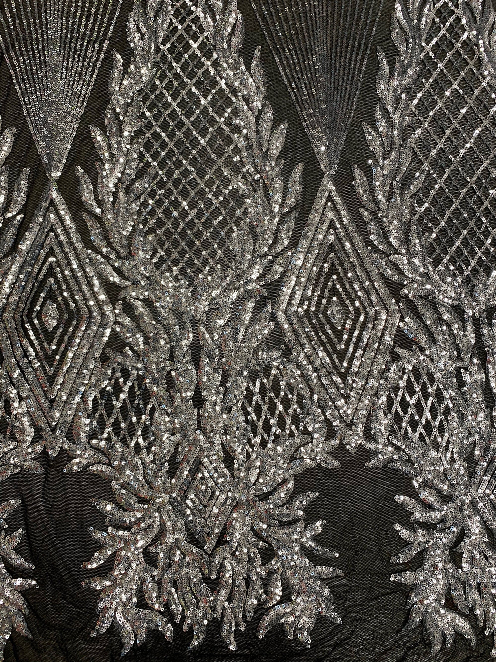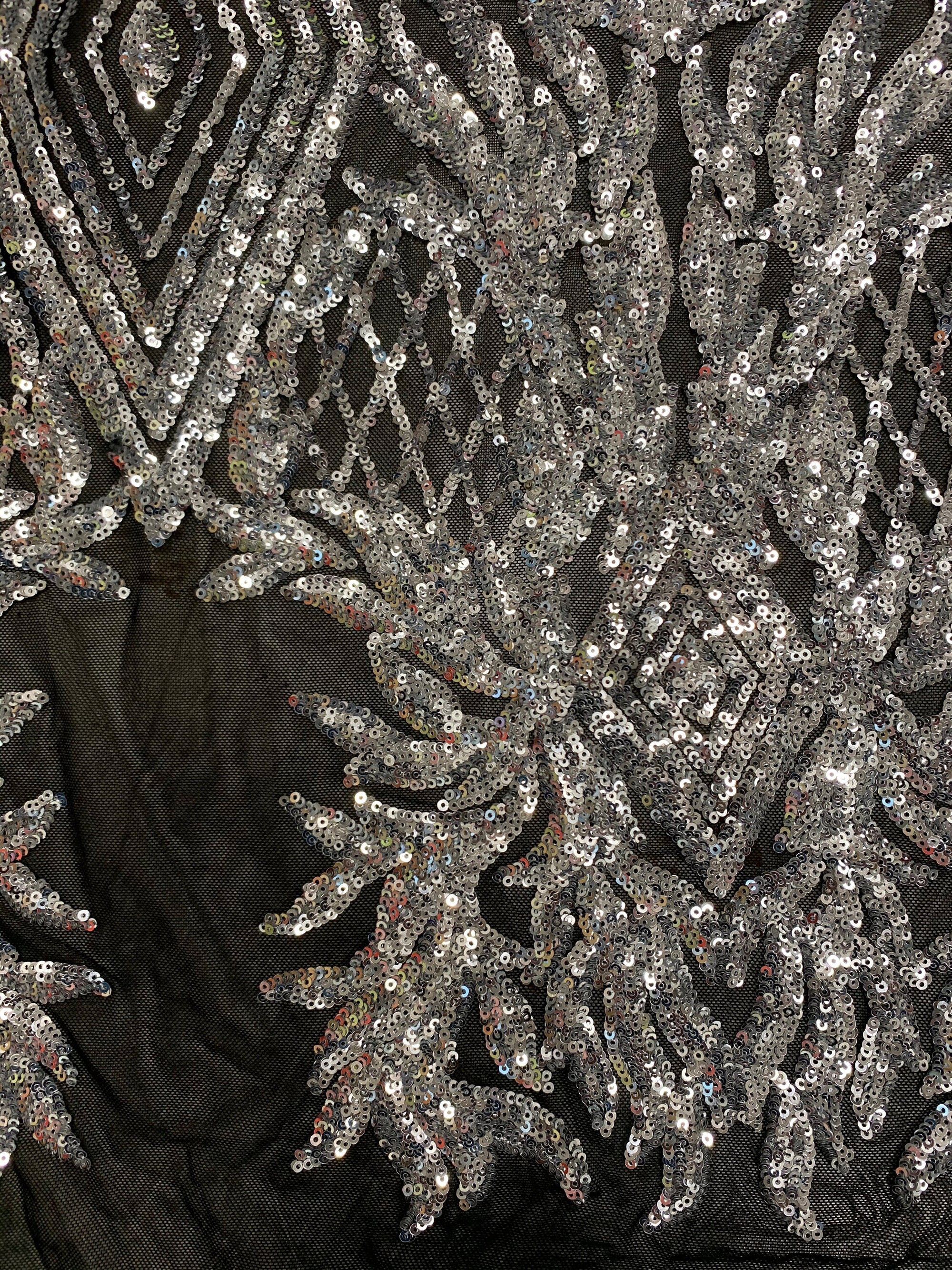 Francesca SILVER Vines and Diamonds Pattern Sequins on BLACK Mesh Lace Fabric by the Yard - 10130