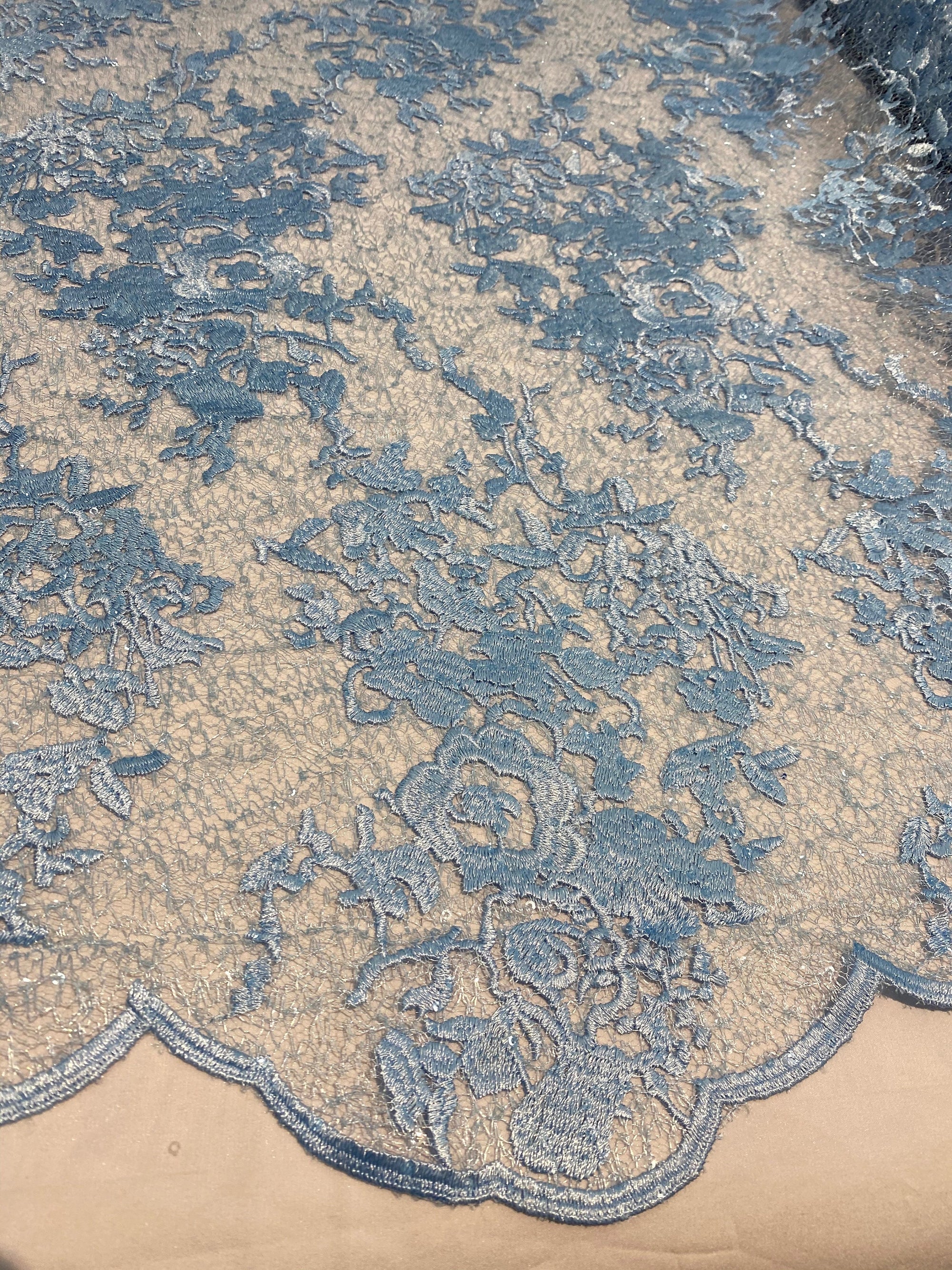 Hanna BABY BLUE Polyester Floral Embroidery with Sequins on Web Mesh Lace Fabric by the Yard for Gown, Wedding, Bridesmaid, Prom - 10165