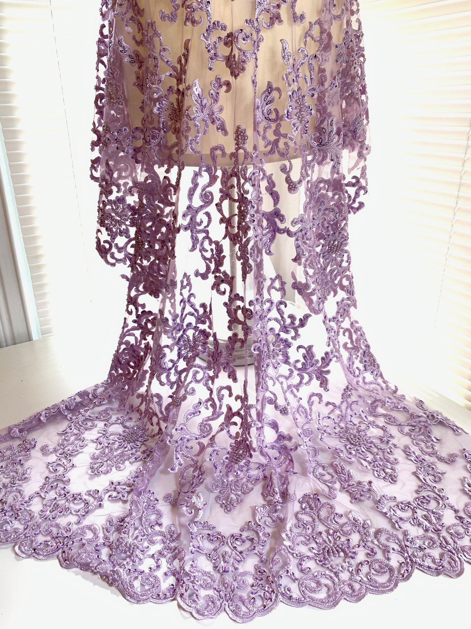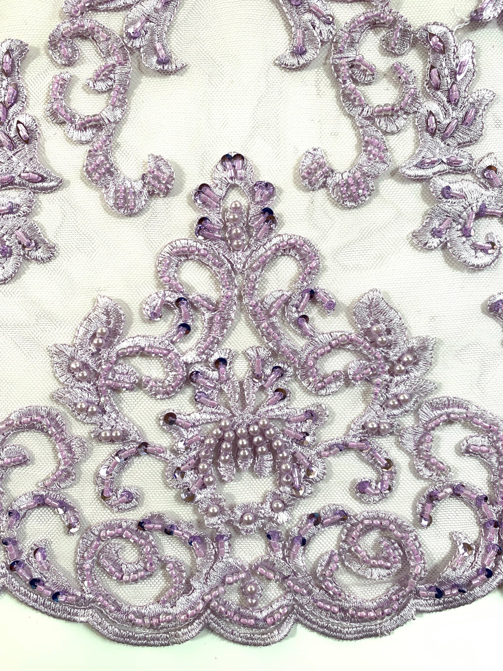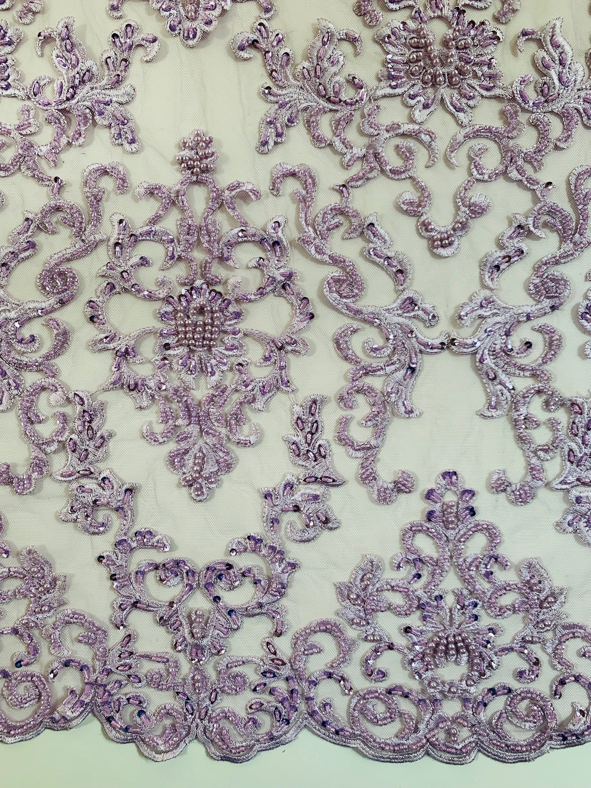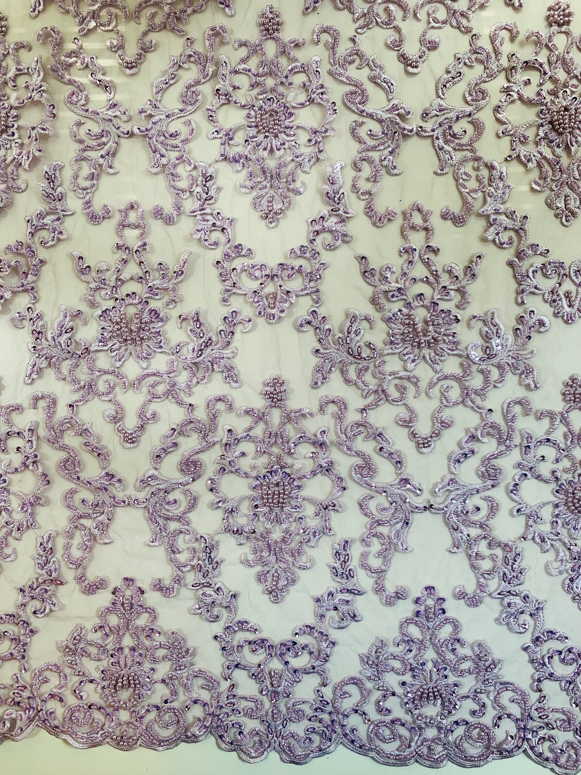 Helena-B LILAC Embroidered Damask Pattern with Faux Pearls and Beads on Mesh Lace Fabric by the Yard - 10225