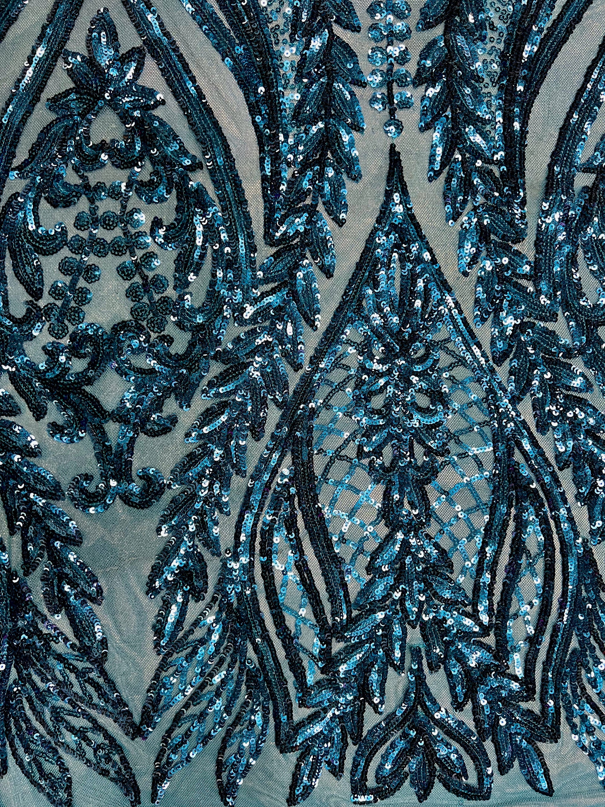 Isabella DARK TURQUOISE Curlicue & Leaves Sequins on Mesh Lace Fabric by the Yard