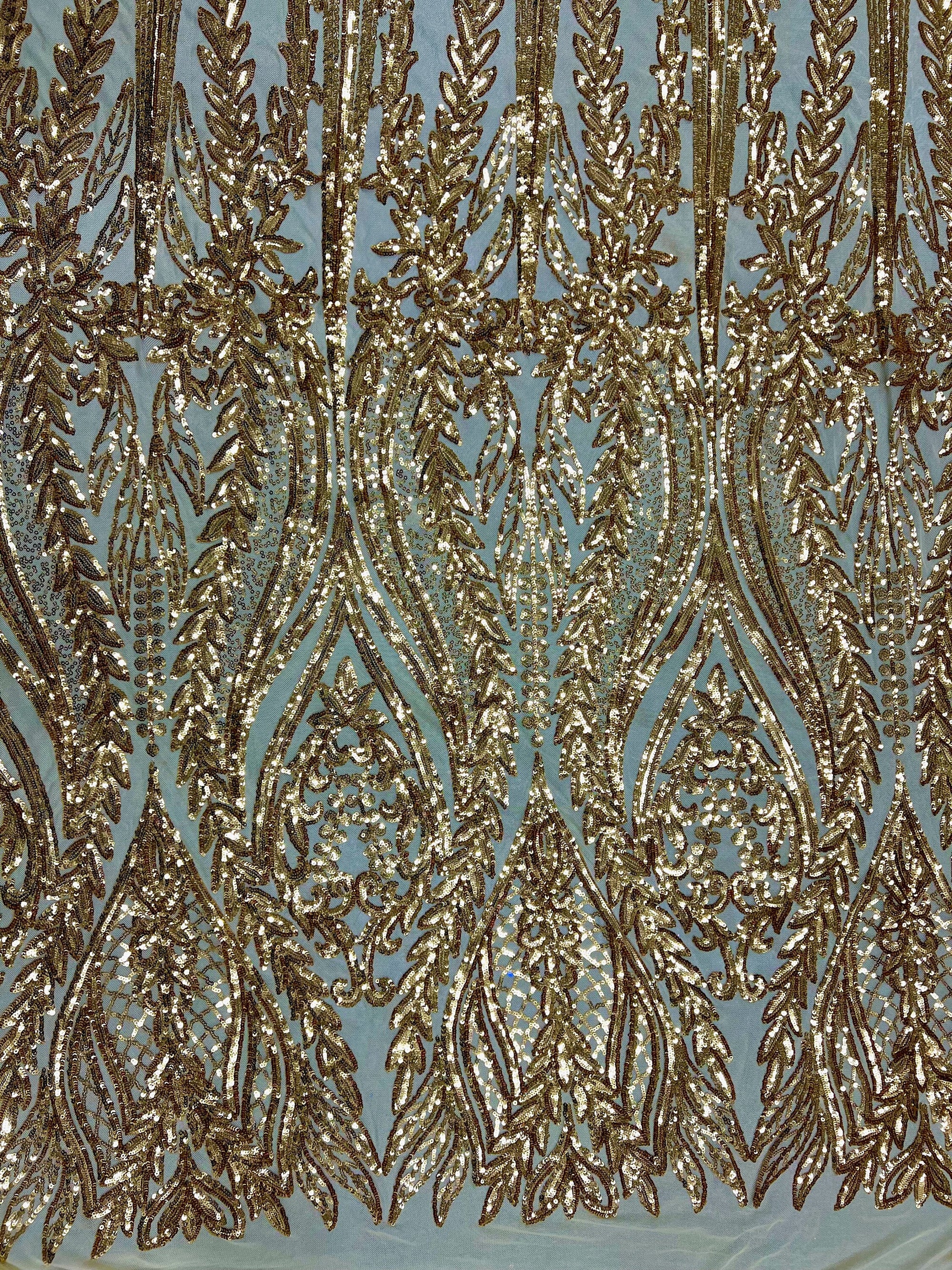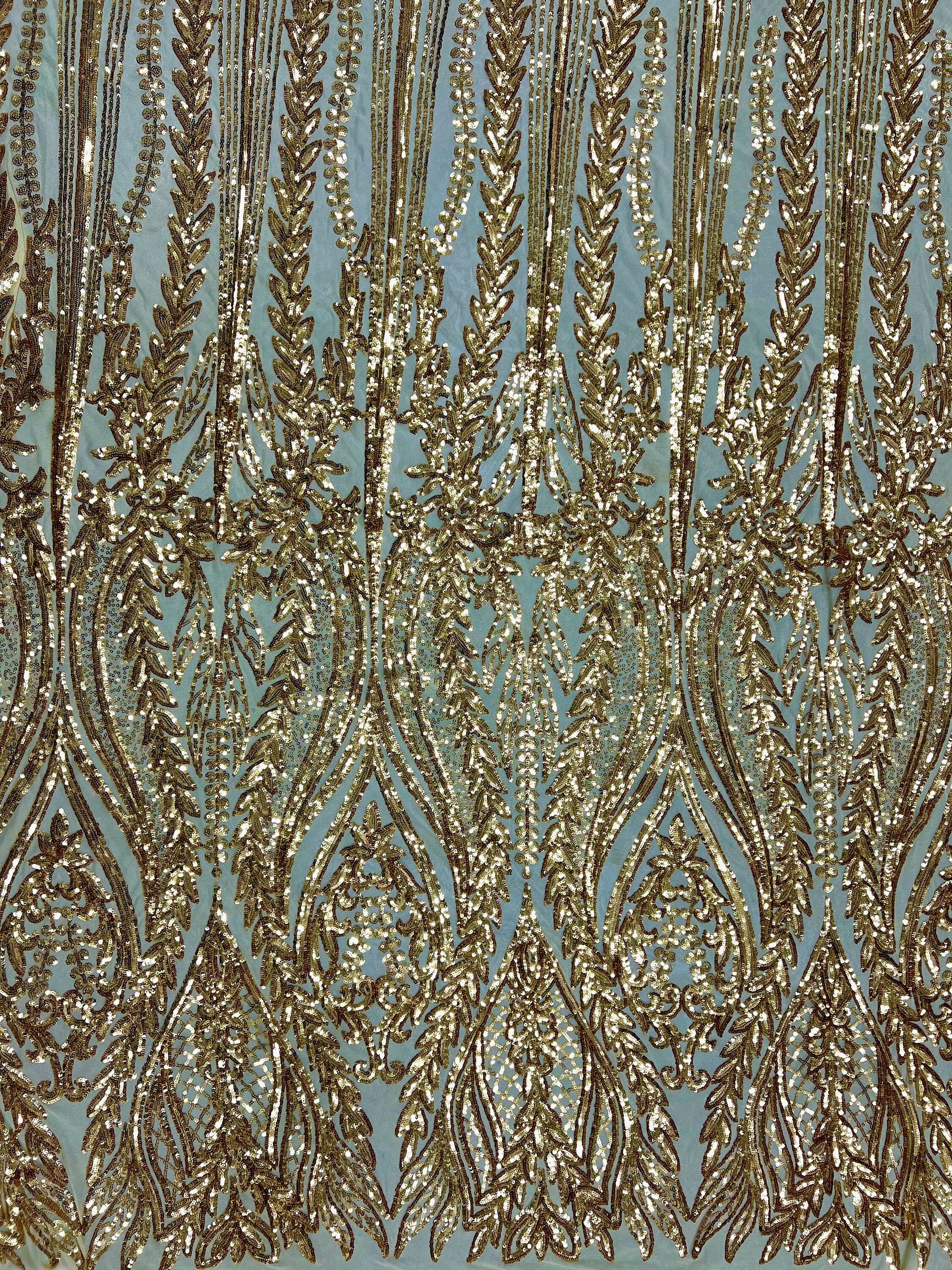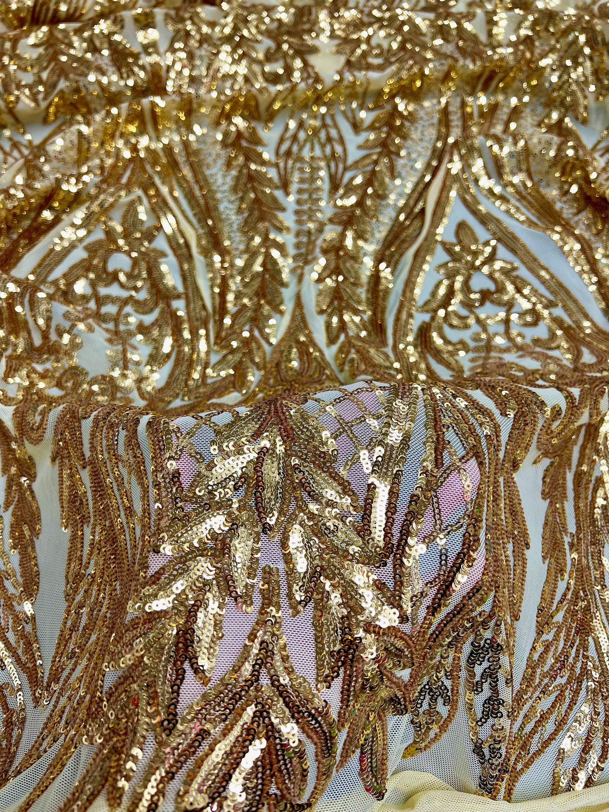 Isabella GOLD Curlicue & Leaves Sequins on Mesh Lace Fabric by the Yard
