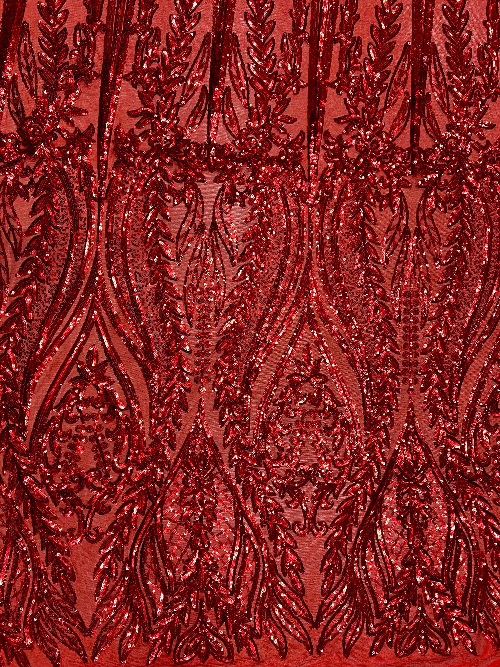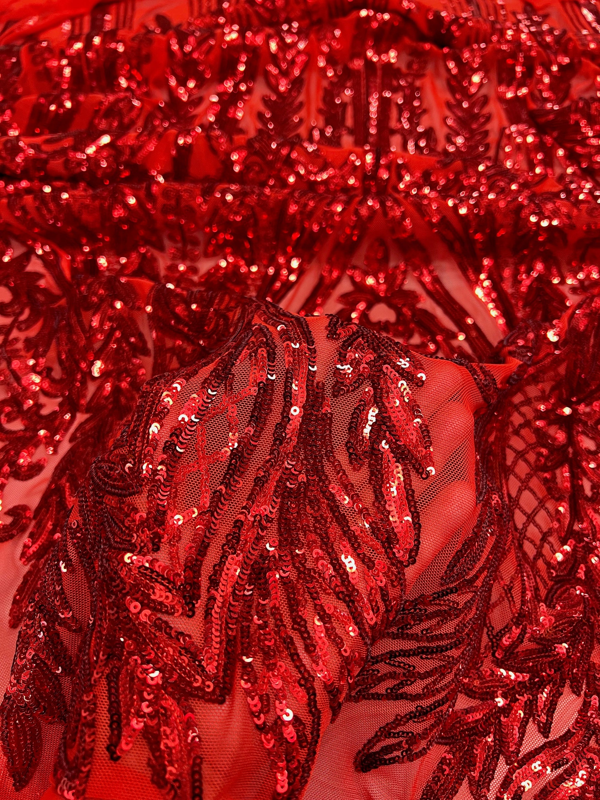 Isabella RED Curlicue & Leaves Sequins on Mesh Lace Fabric by the Yard