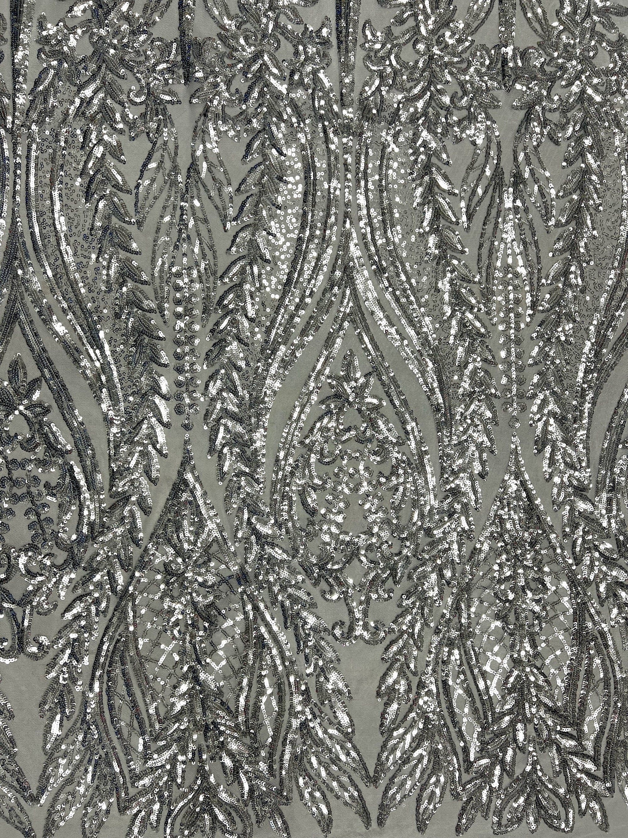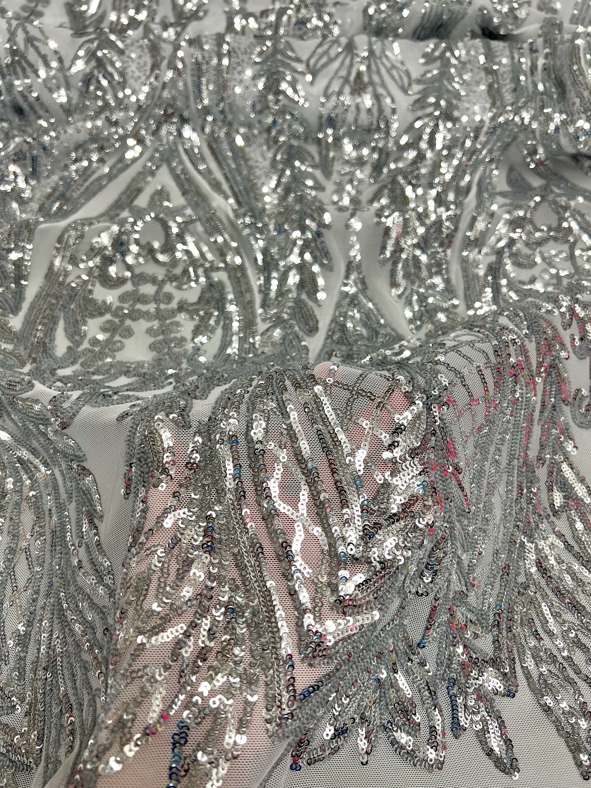 Isabella SILVER Curlicue & Leaves Sequins on WHITE Mesh Lace Fabric by the Yard - 10206