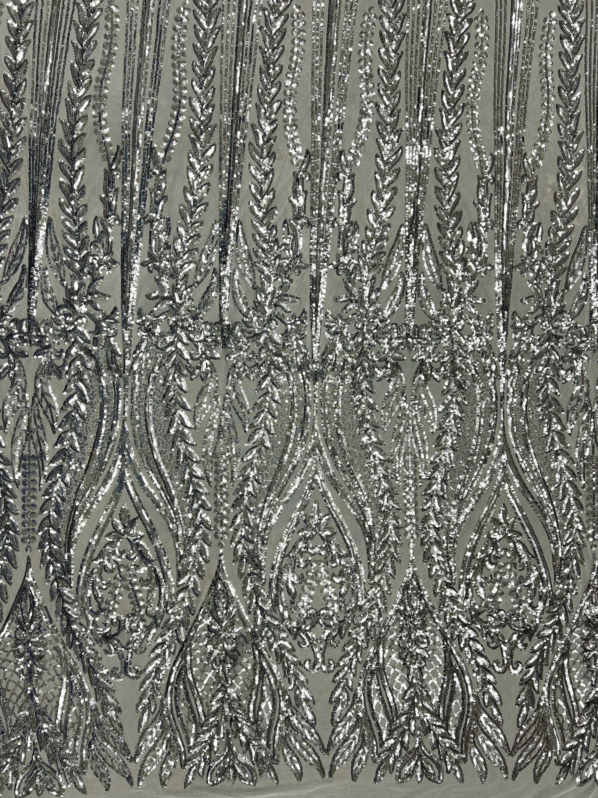 Isabella SILVER Curlicue & Leaves Sequins on WHITE Mesh Lace Fabric by the Yard