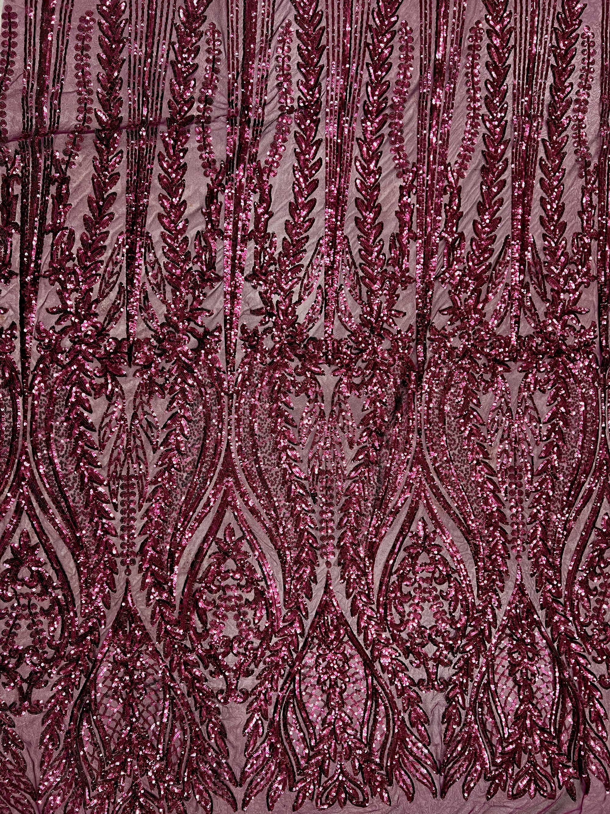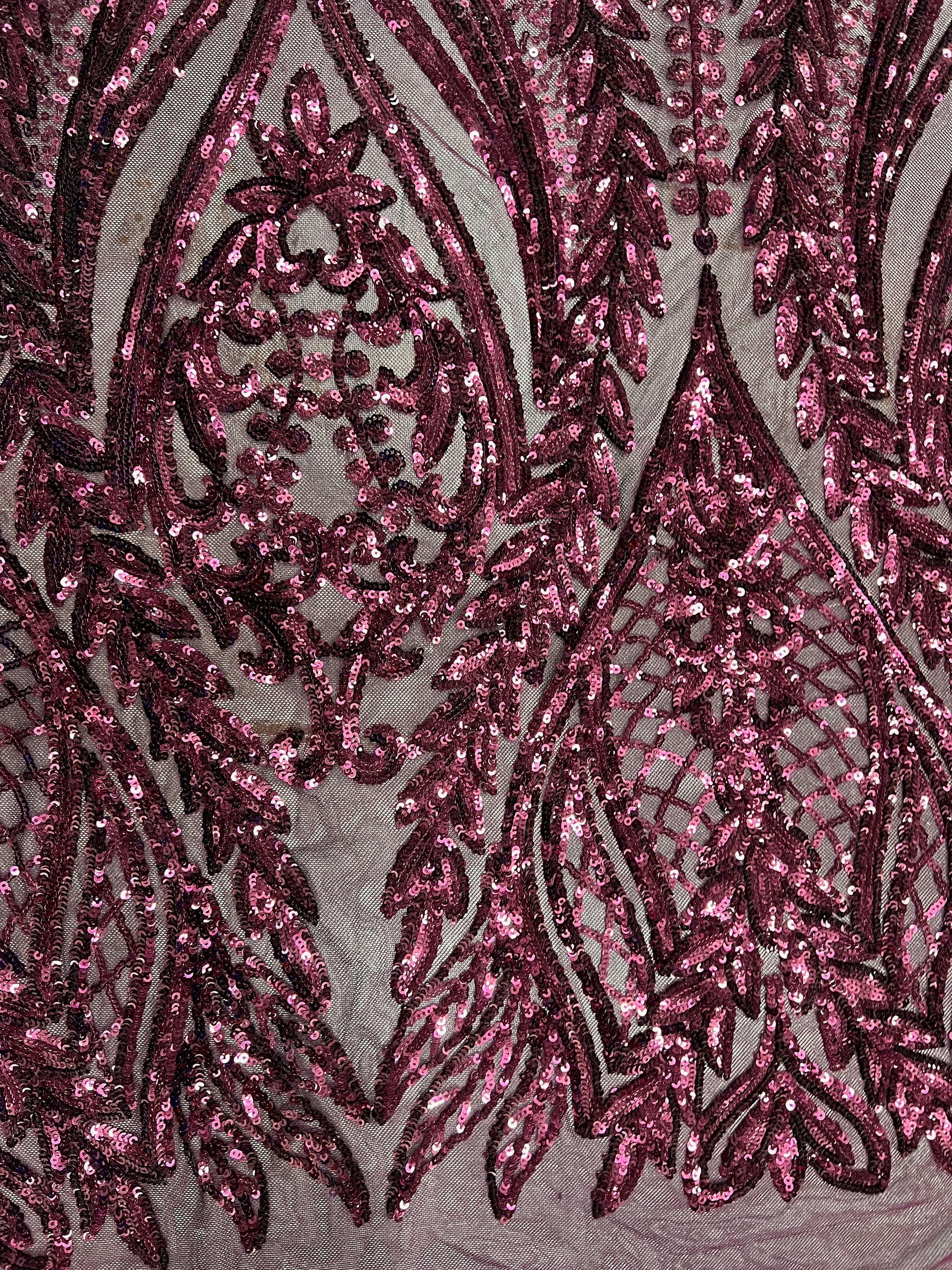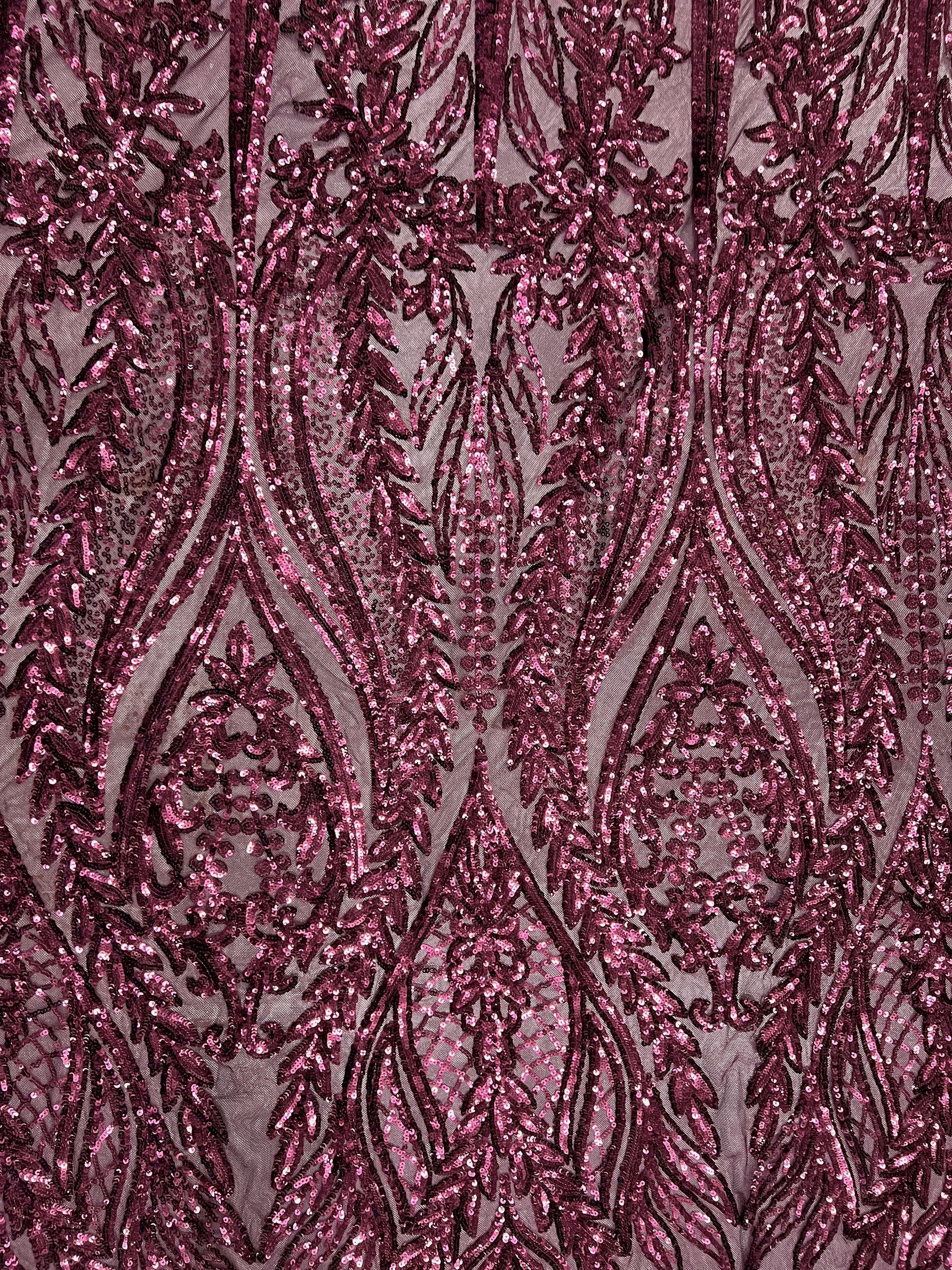 Isabella WINE Curlicue & Leaves Sequins on Mesh Lace Fabric by the Yard