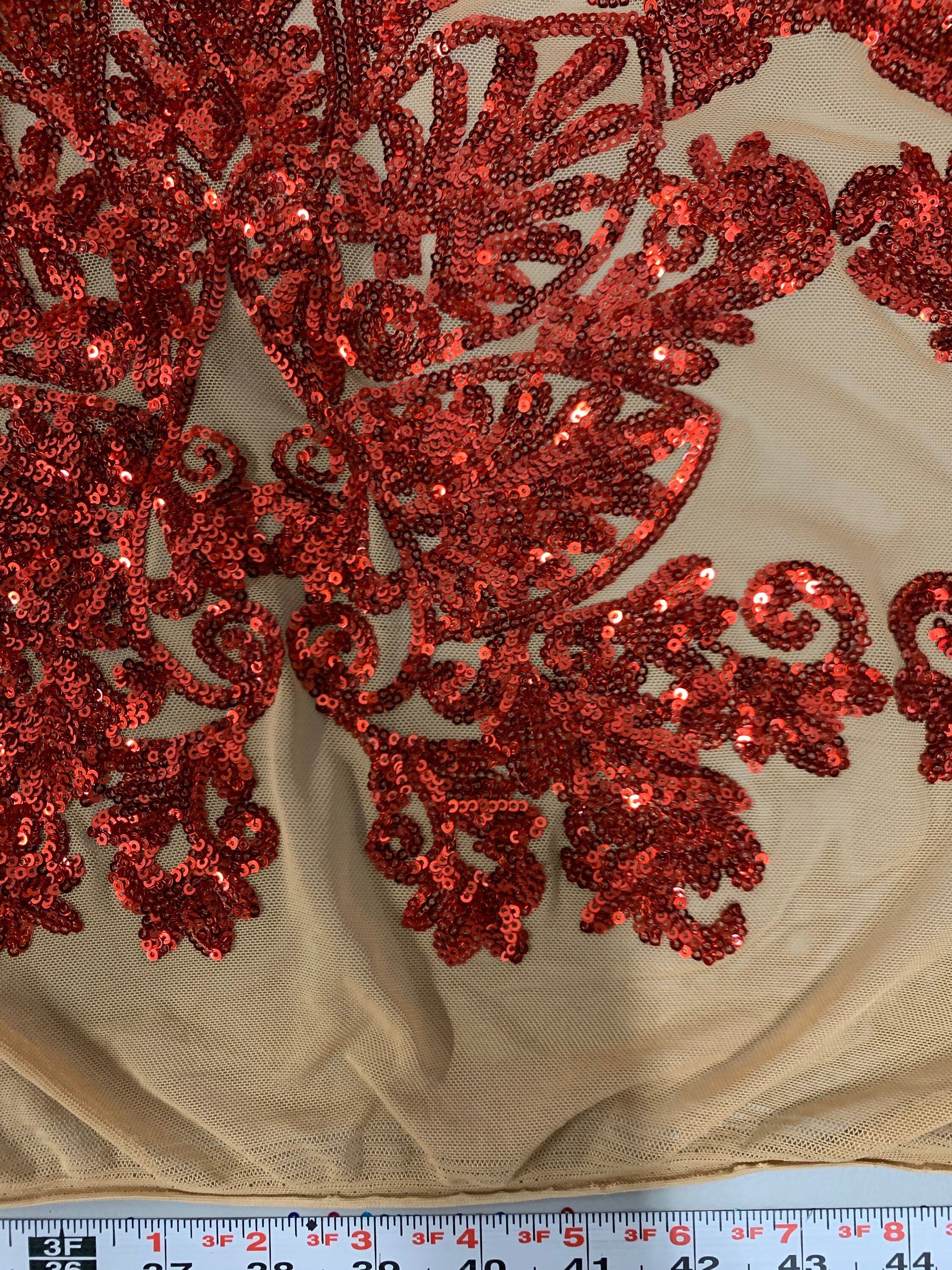 Kara RED Hearts and Flowers Sequins on NUDE Mesh Lace Fabric by the Yard - 10148