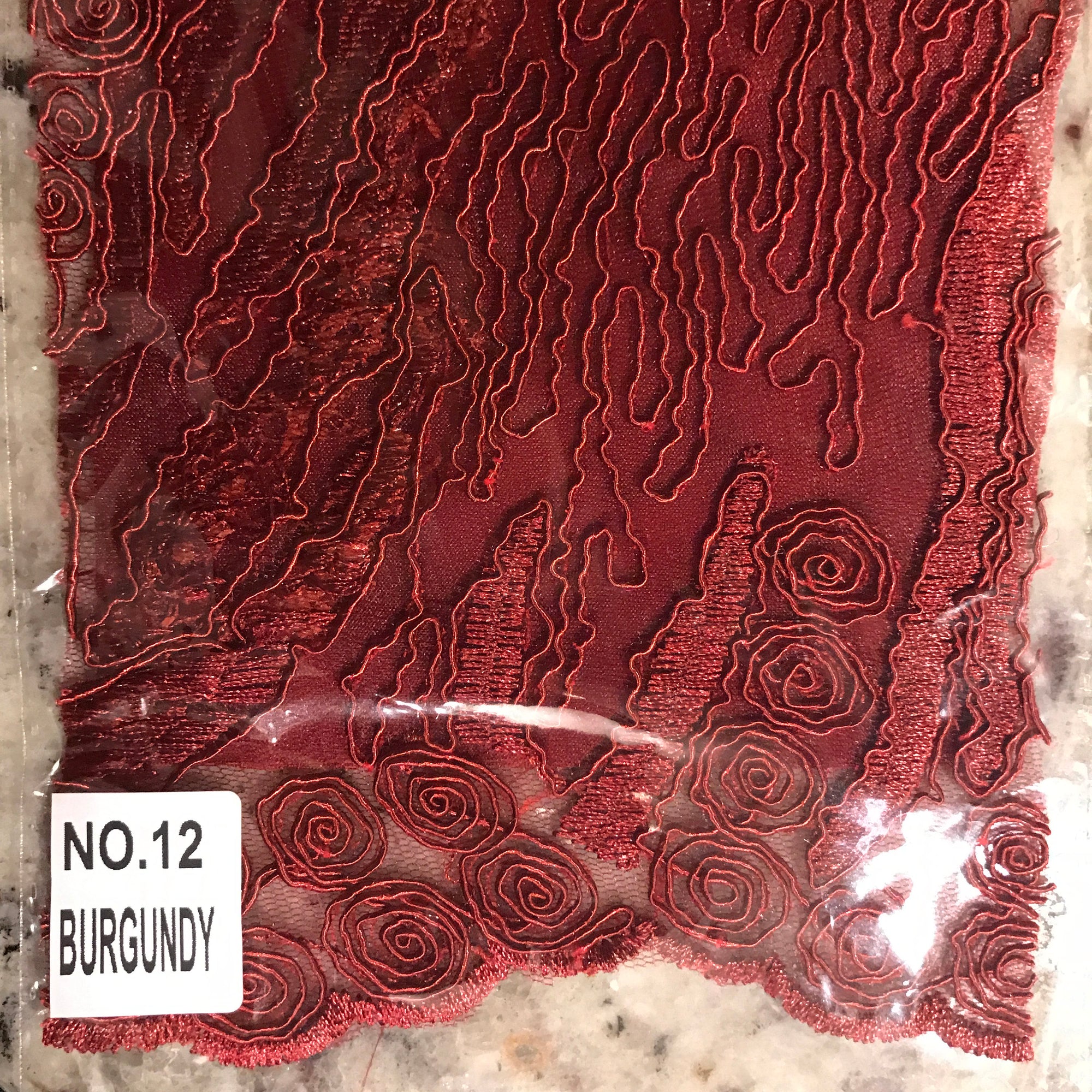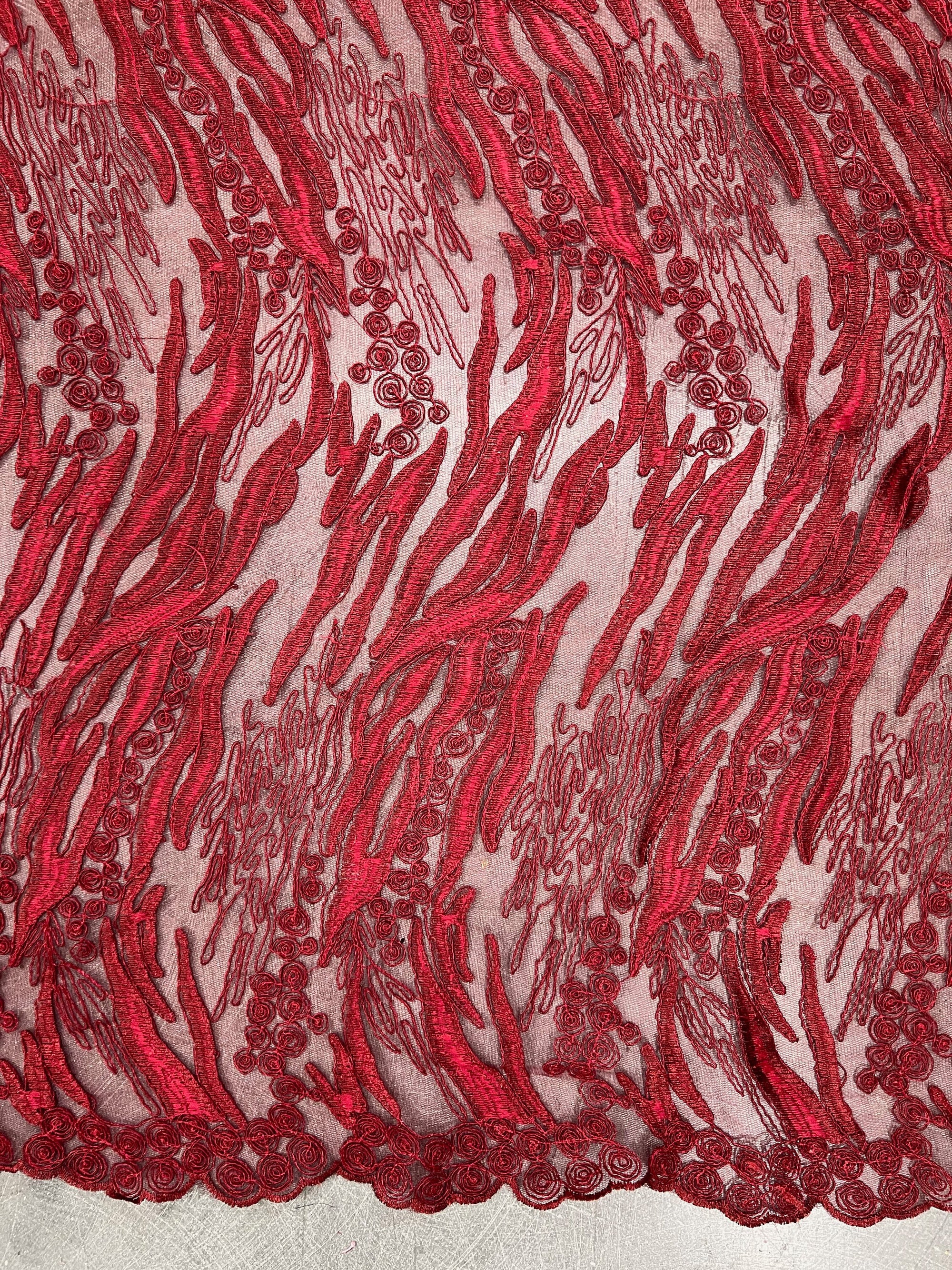 Katelyn BURGUNDY Vines and Swirls Corded Embroidery on Mesh Fabric by the Yard - 10045