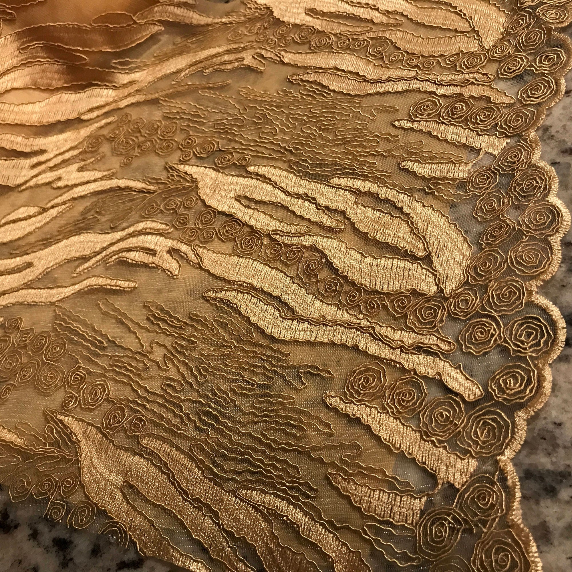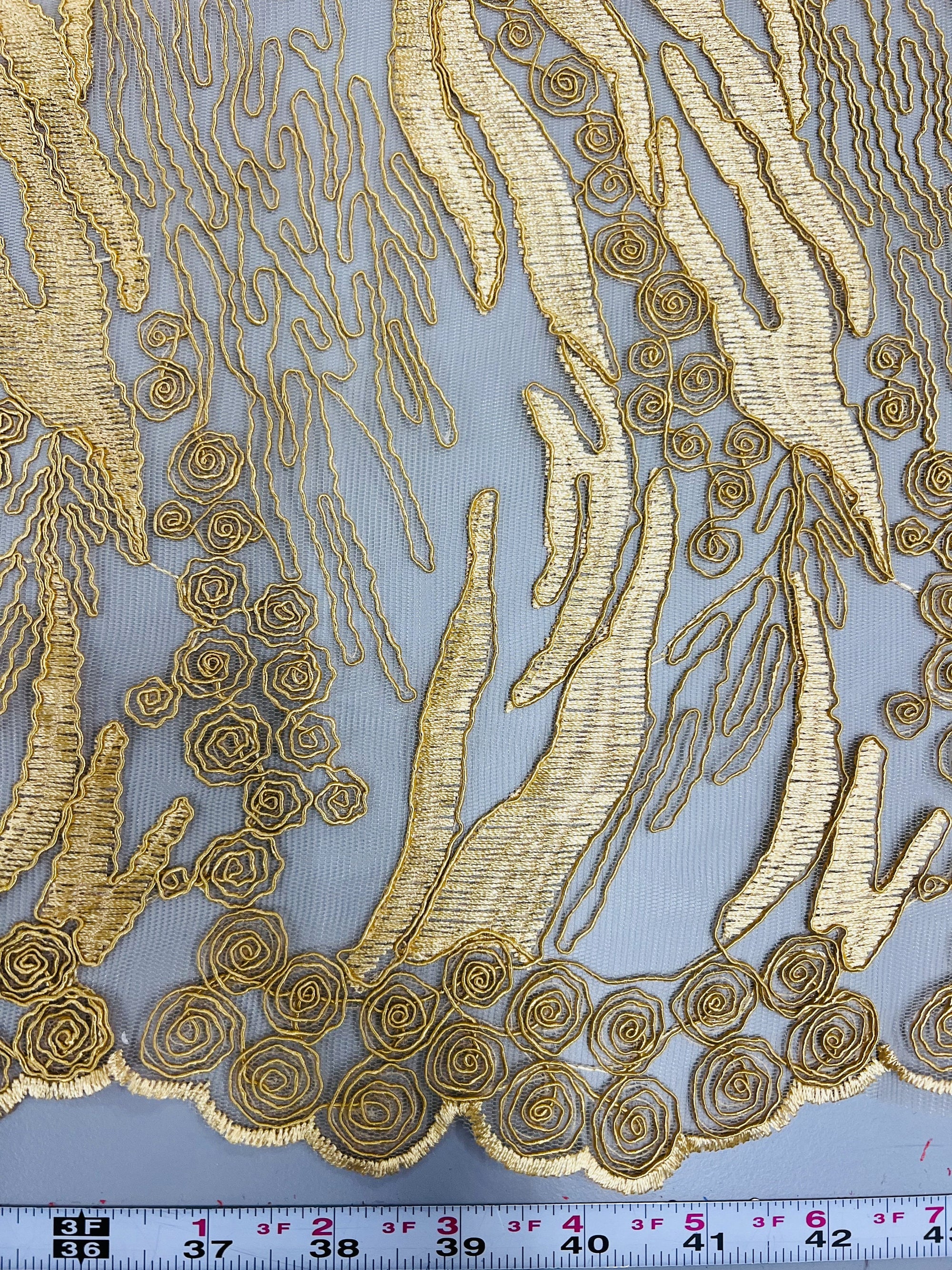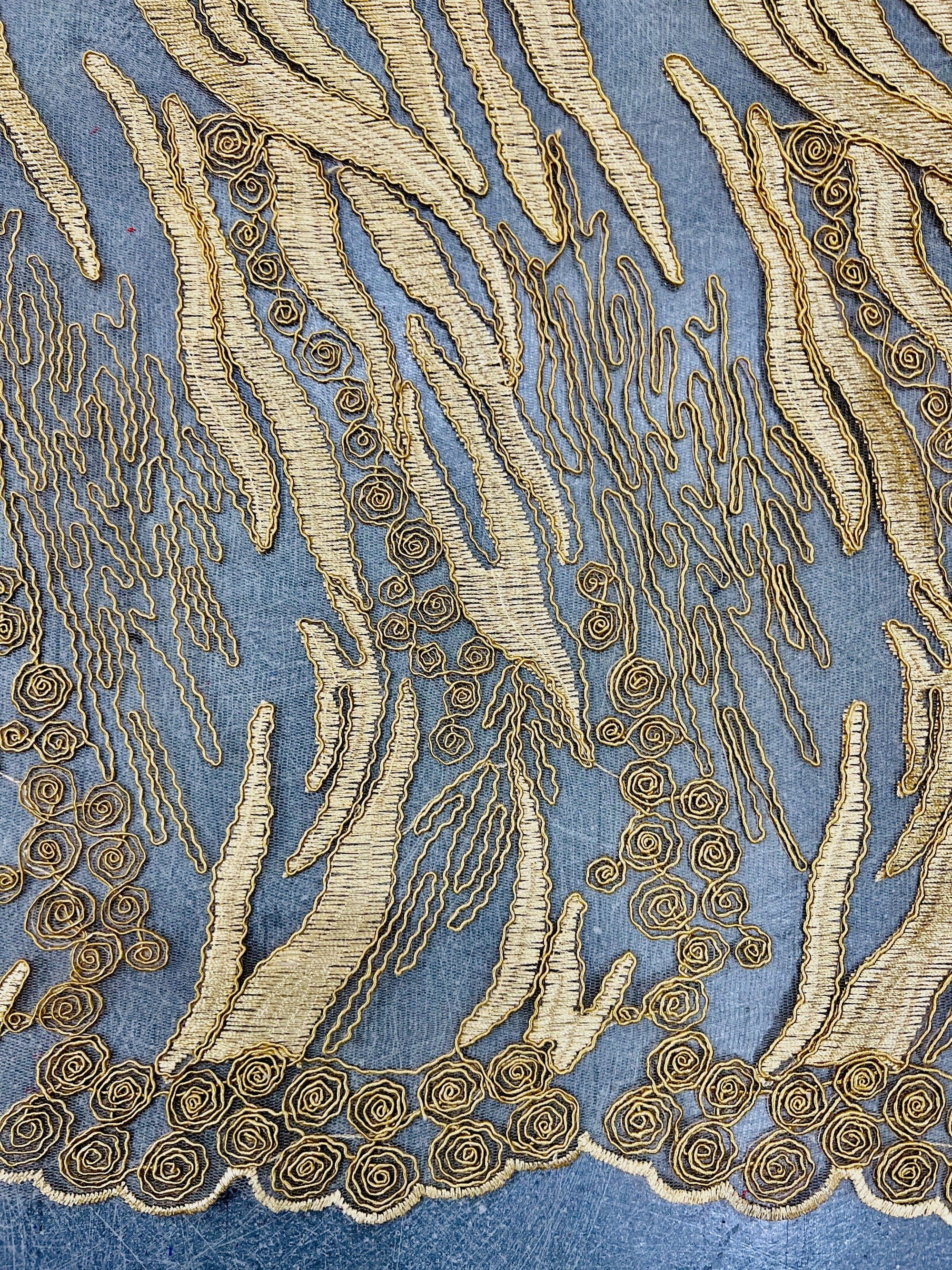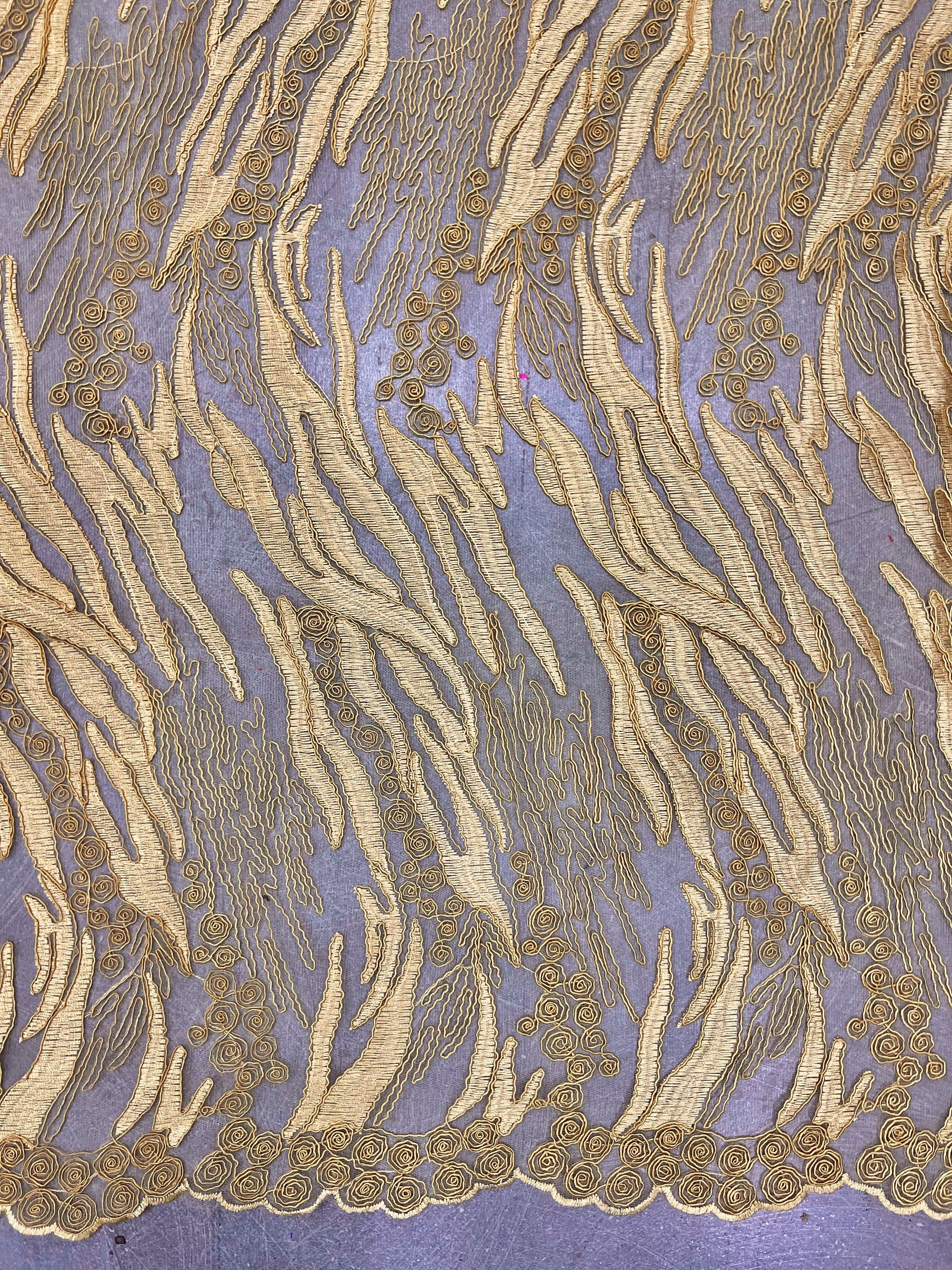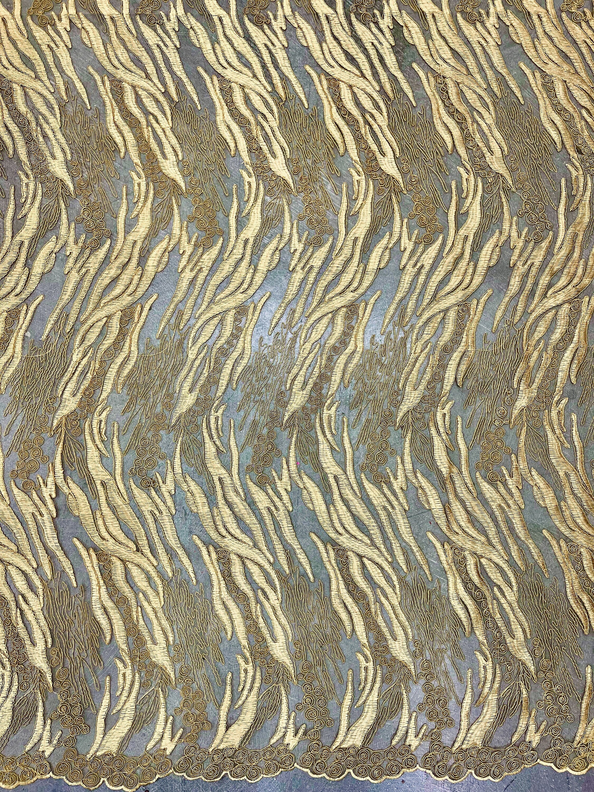 Katelyn GOLD Vines and Swirls Corded Embroidery on Mesh Fabric by the Yard - 10045