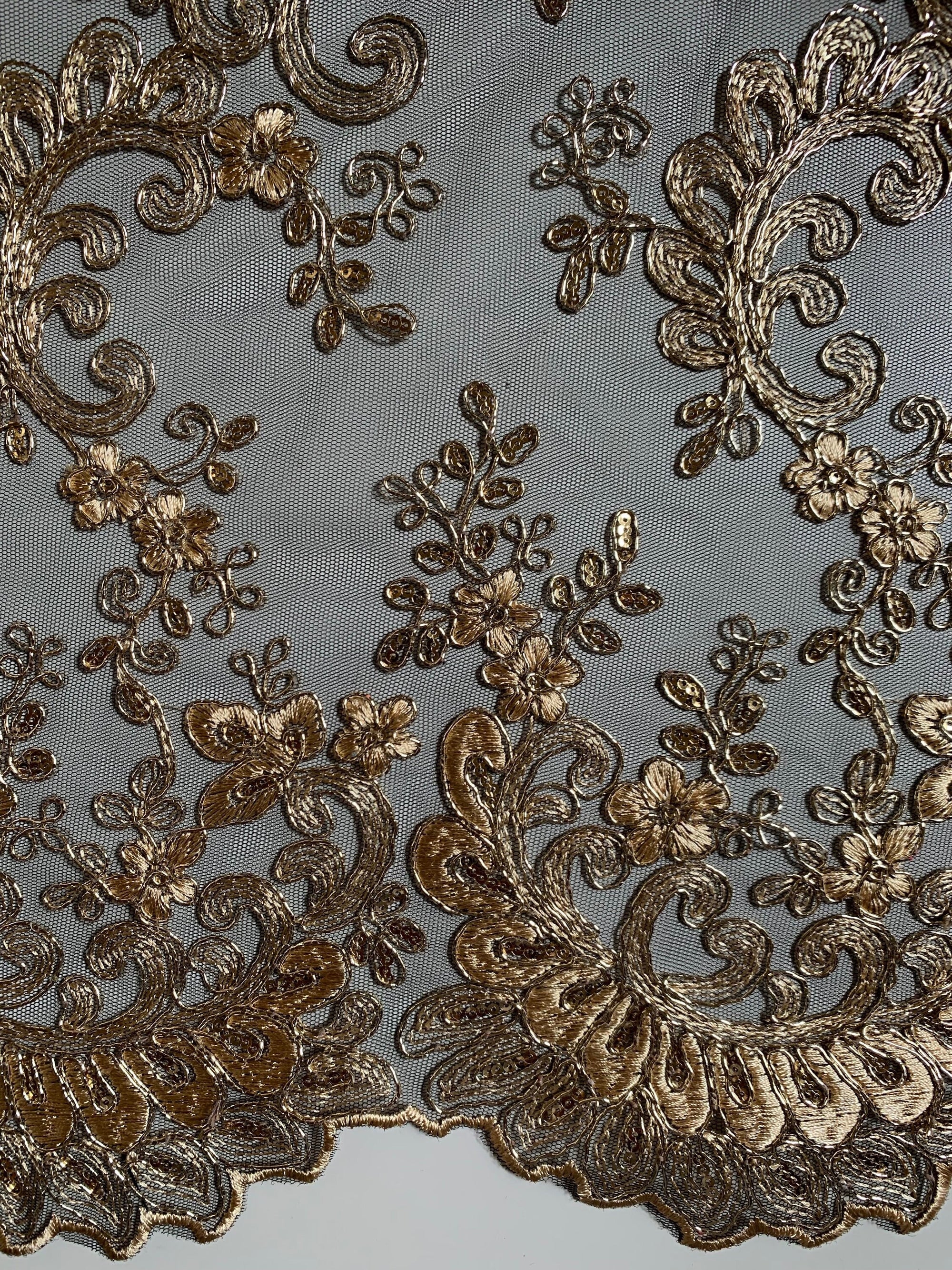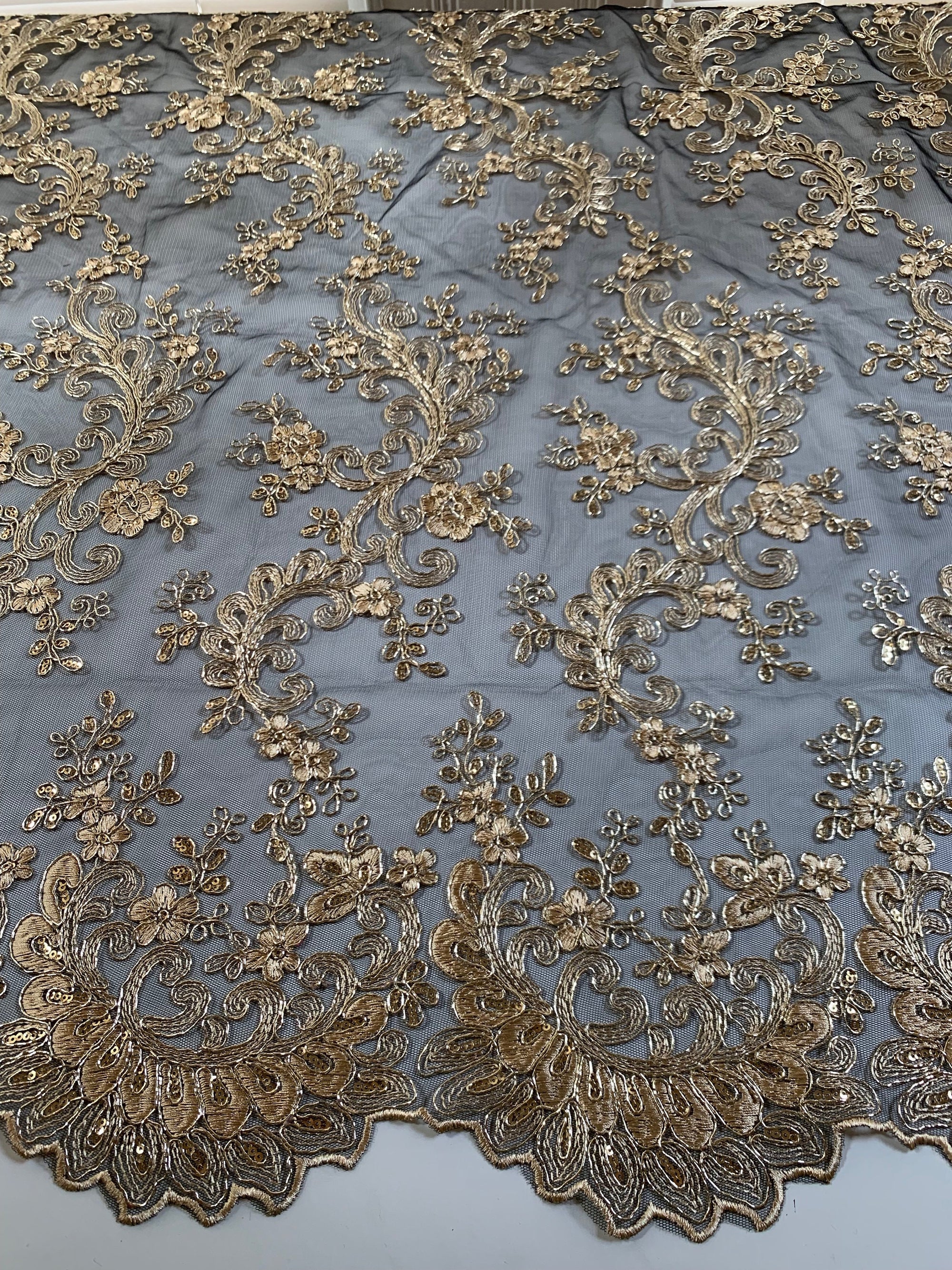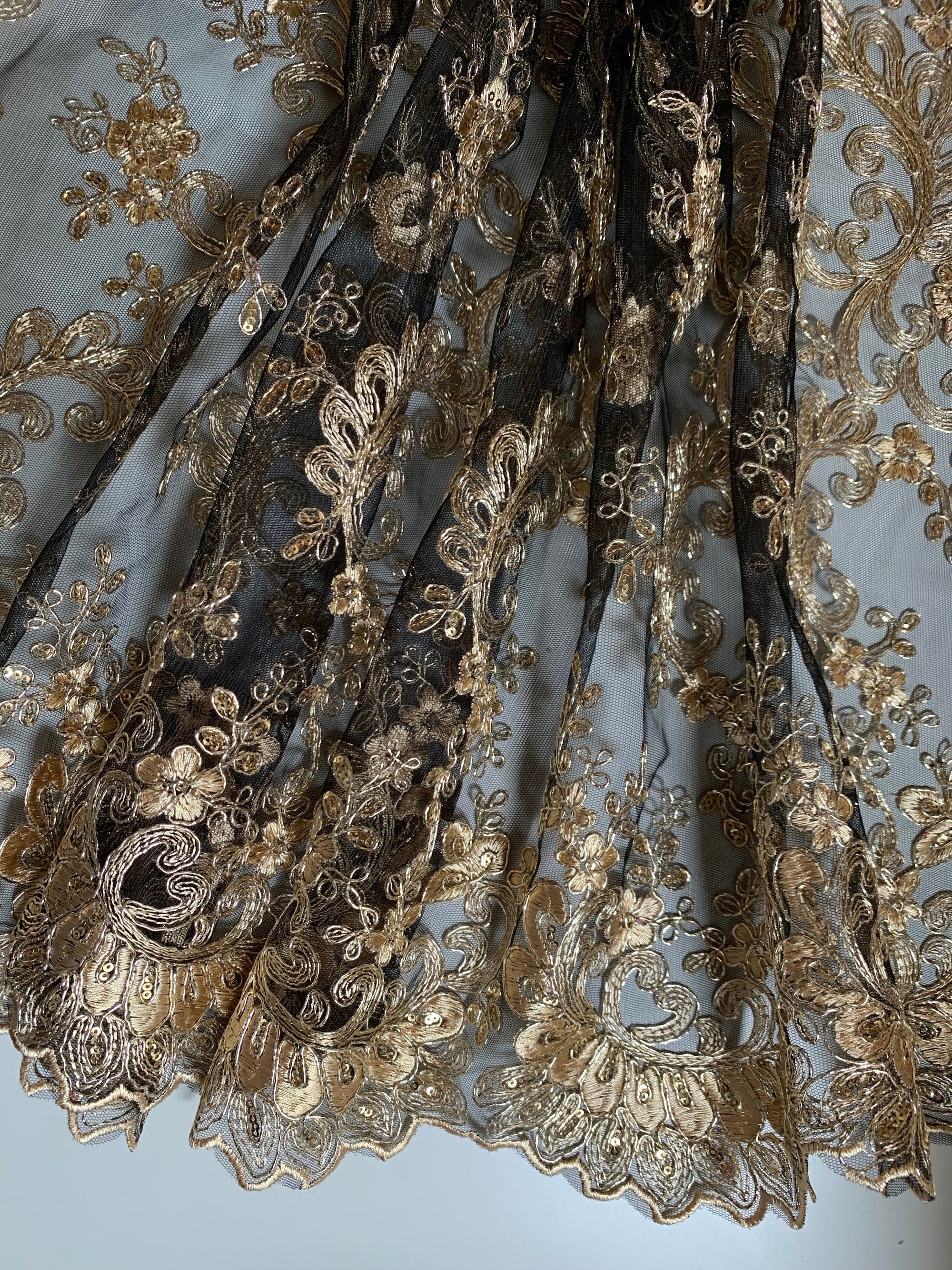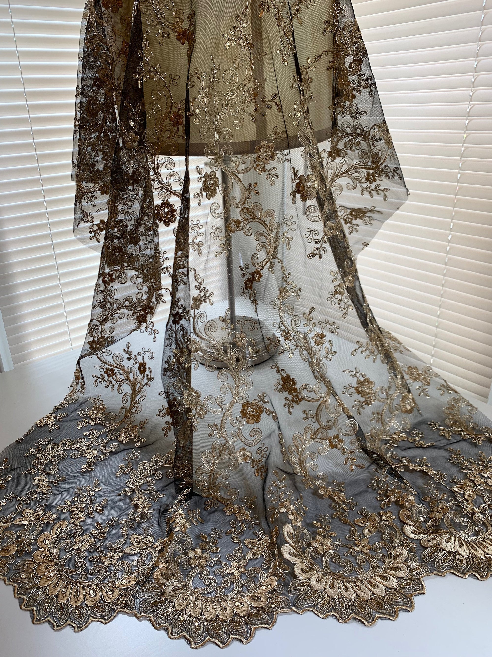 Melody GOLD Polyester Floral Embroidery with Sequins on BLACK Mesh Lace Fabric by the Yard for Gown, Wedding, Bridesmaid, Prom - 10002