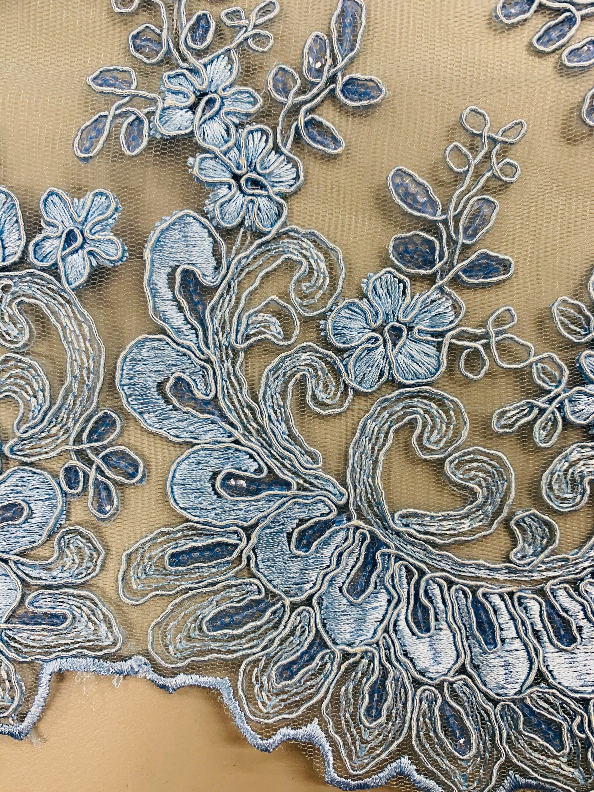 Melody LIGHT BLUE Polyester Floral Embroidery with Sequins on Mesh Lace Fabric for Gown, Wedding, Bridesmaid, Prom, Crafts - 10002