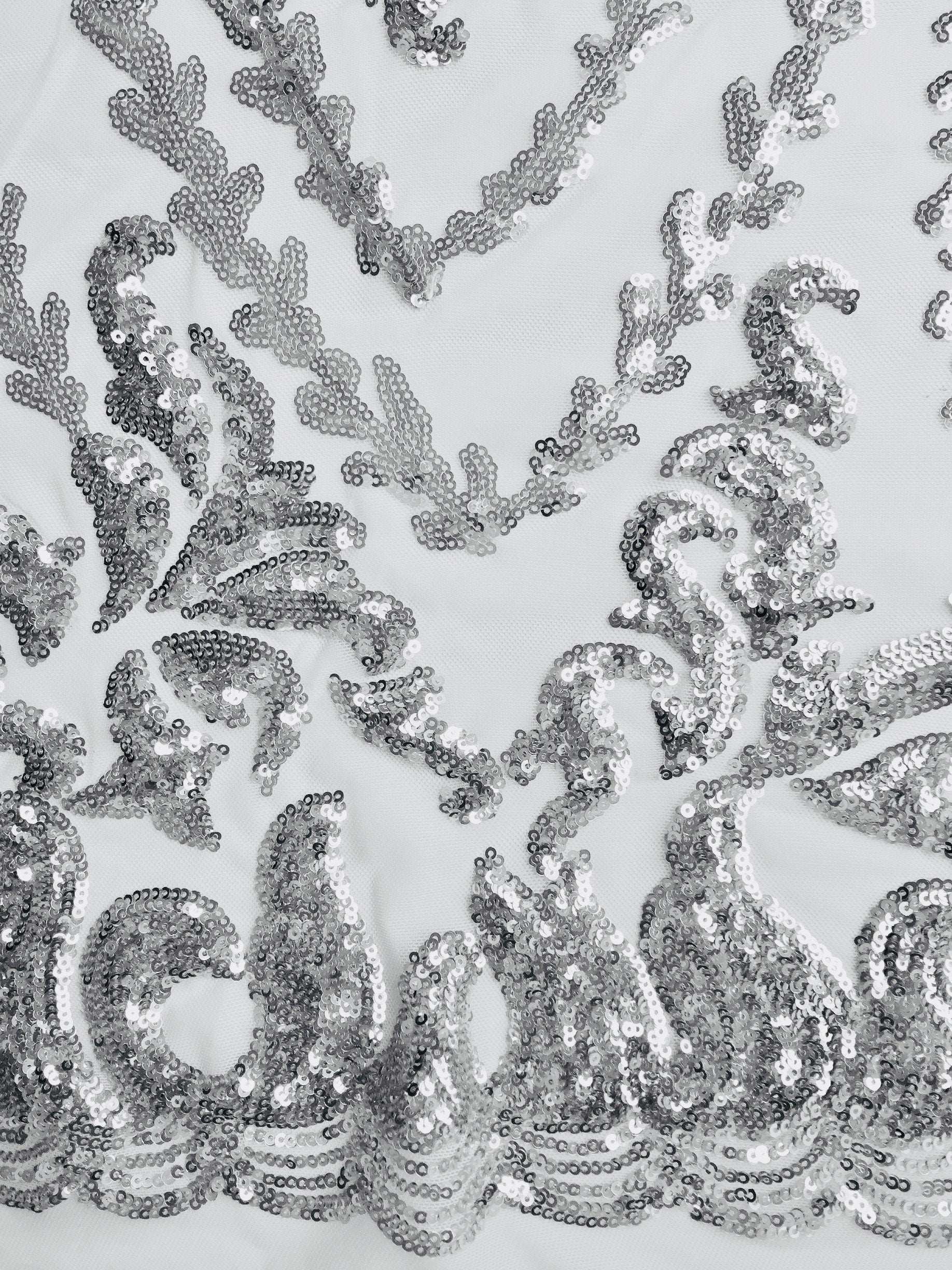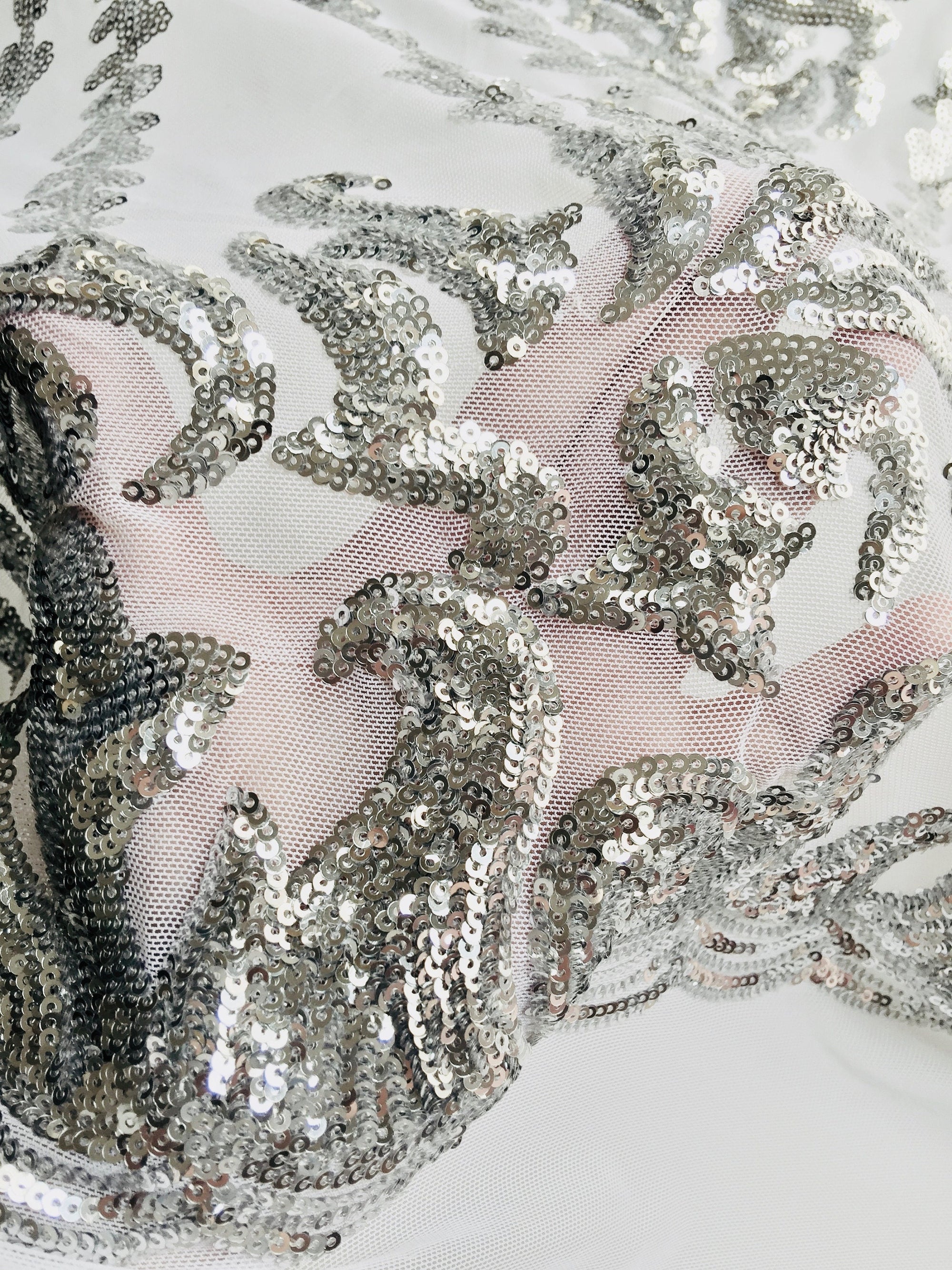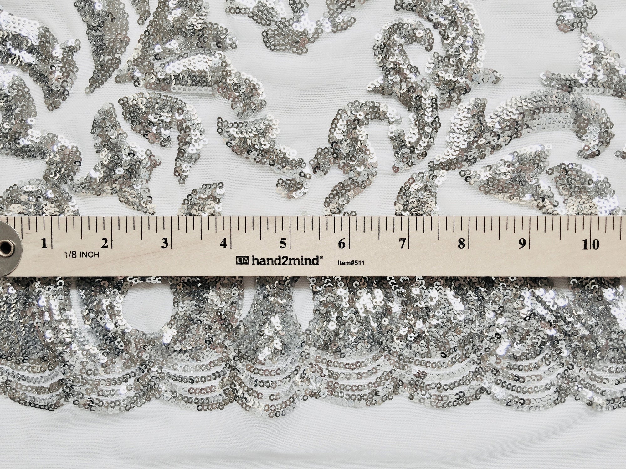 Miranda SILVER Vines and Leaves Sequins on WHITE Mesh Lace Fabric by the Yard - 10061