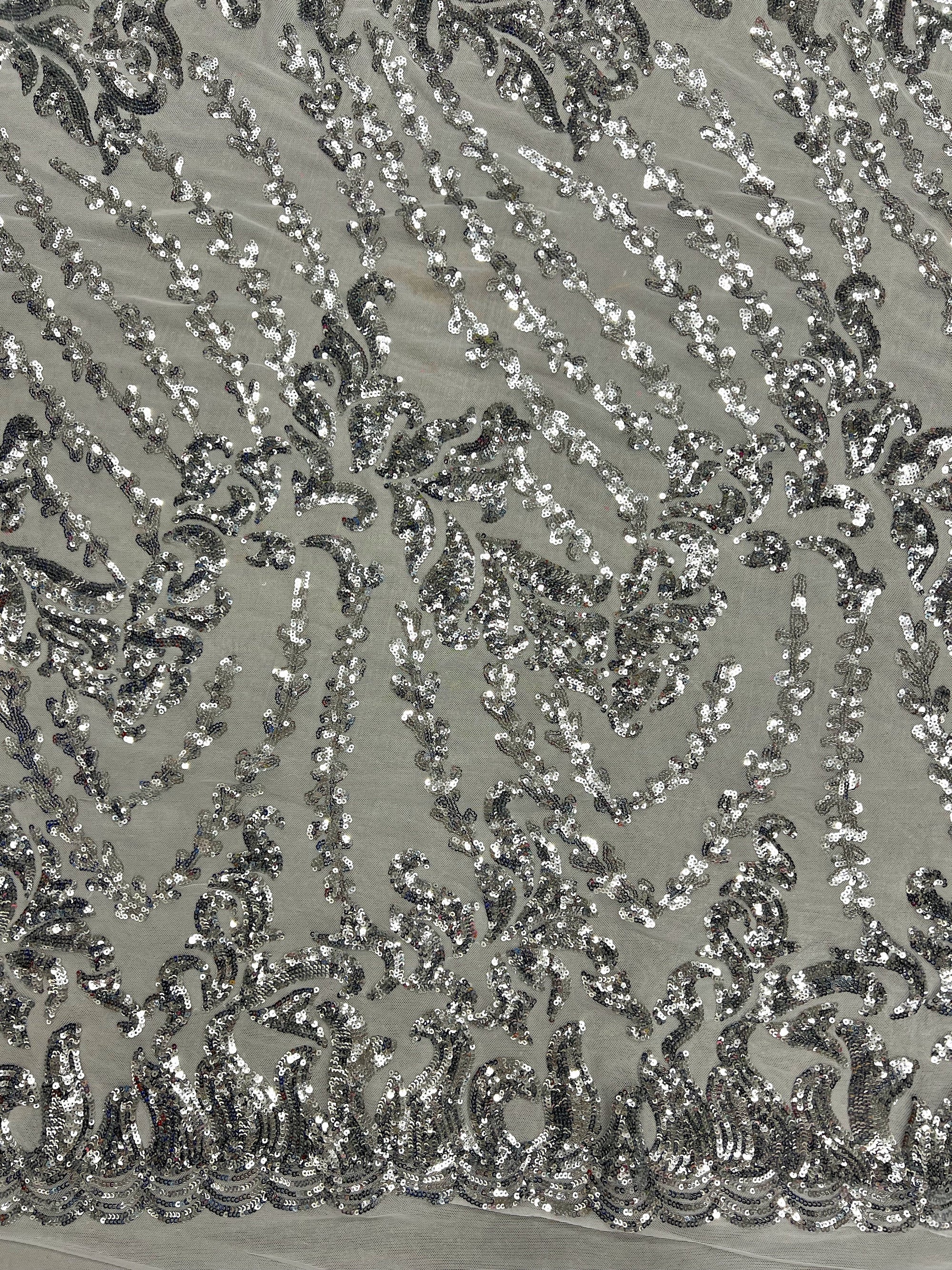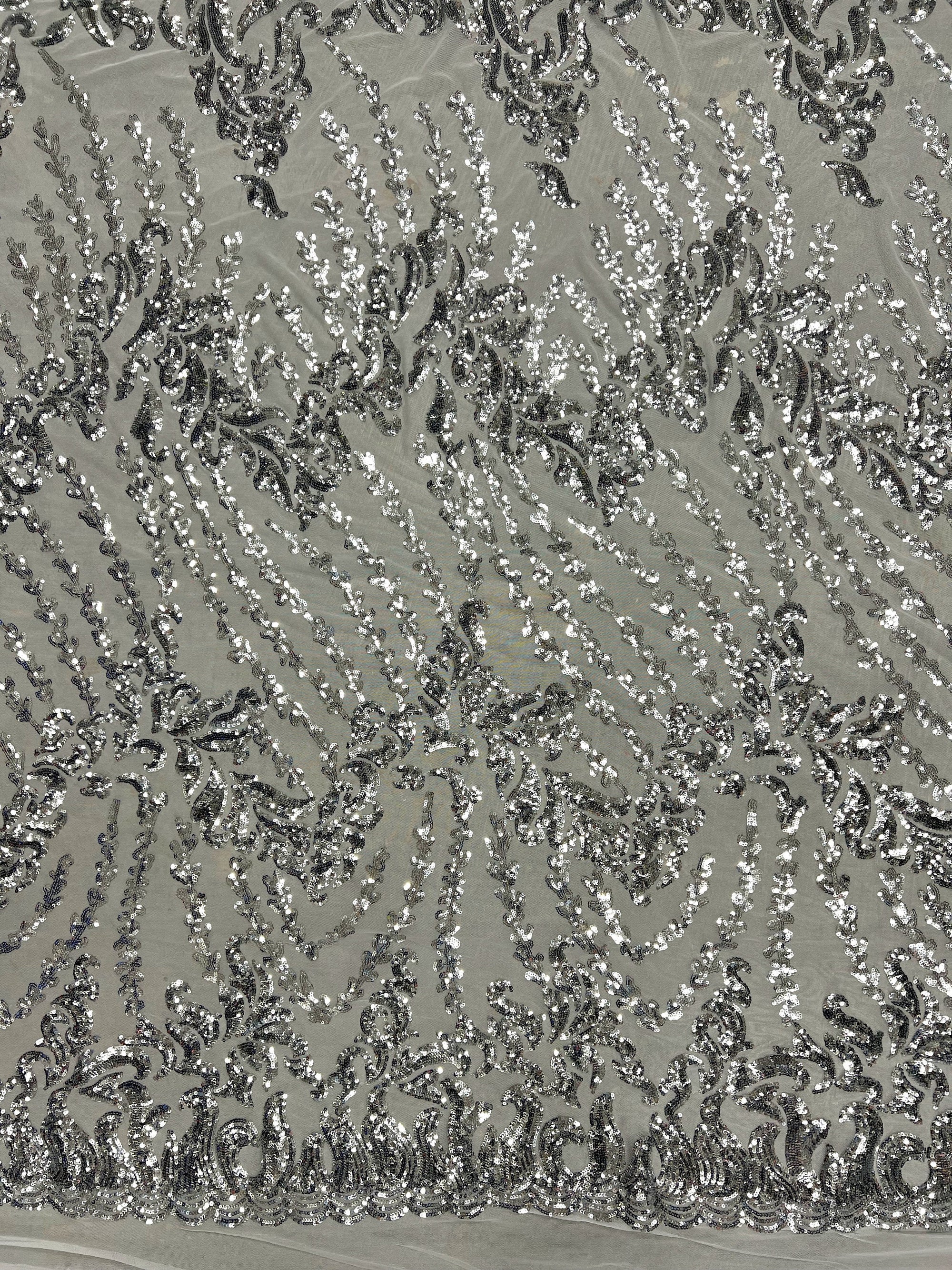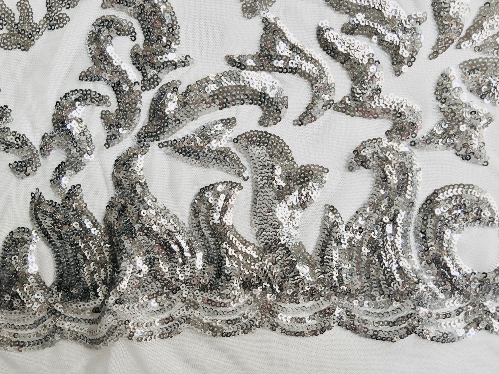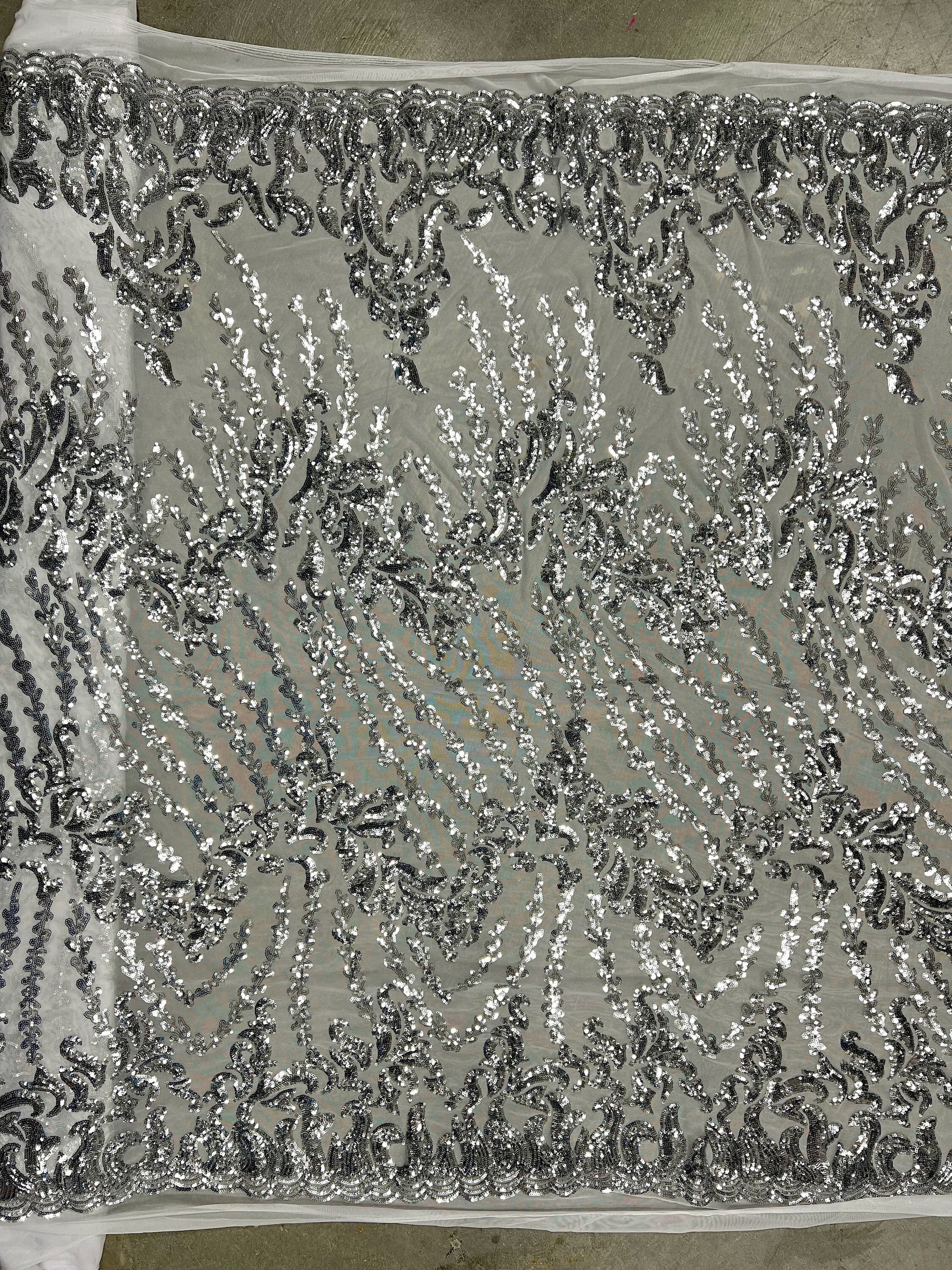 Miranda SILVER Vines and Leaves Sequins on WHITE Mesh Lace Fabric by the Yard - 10061
