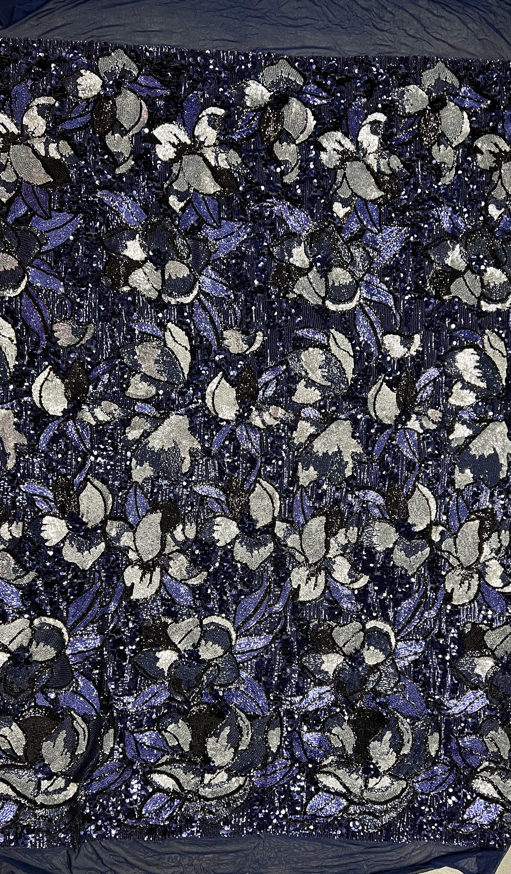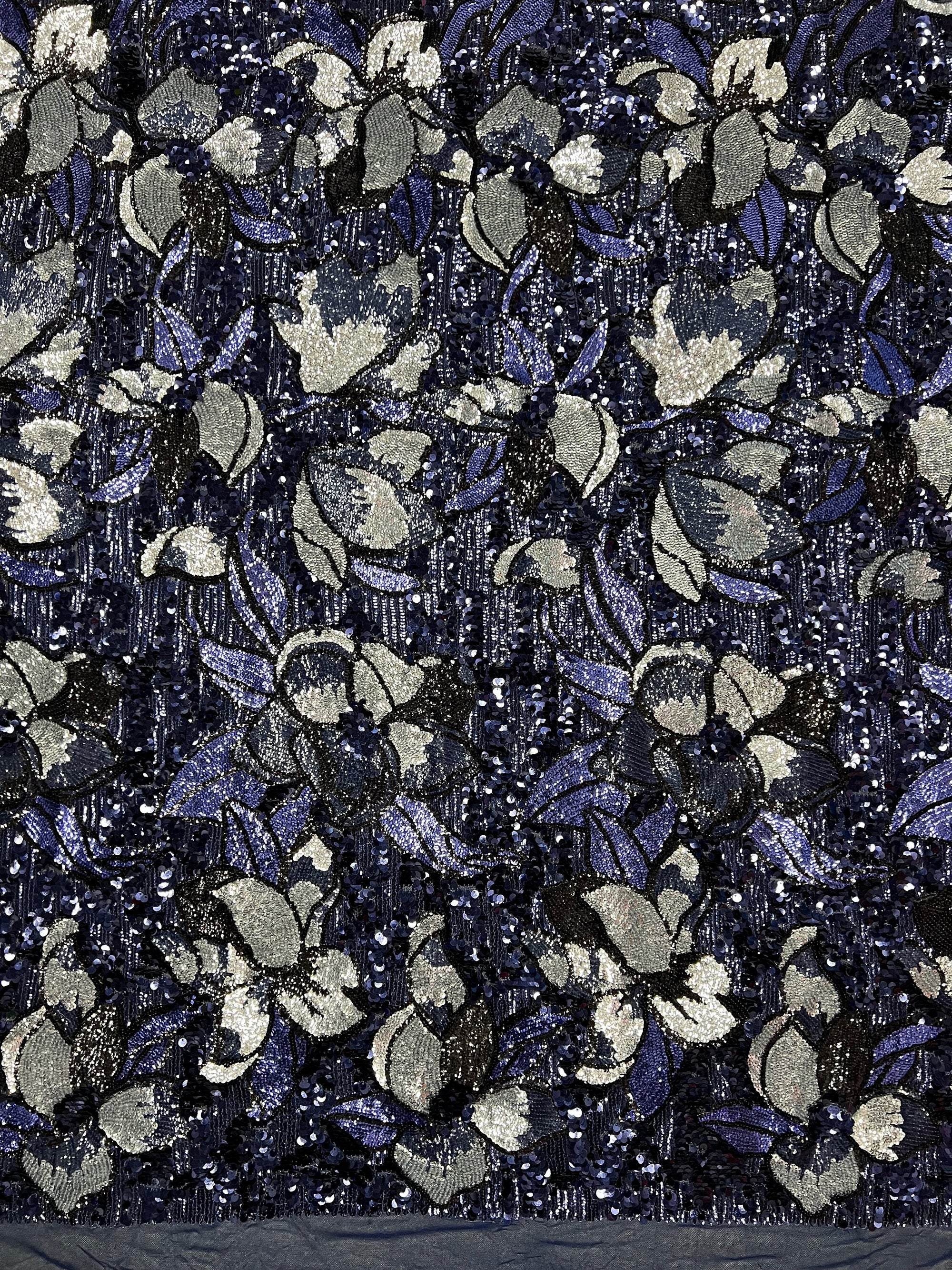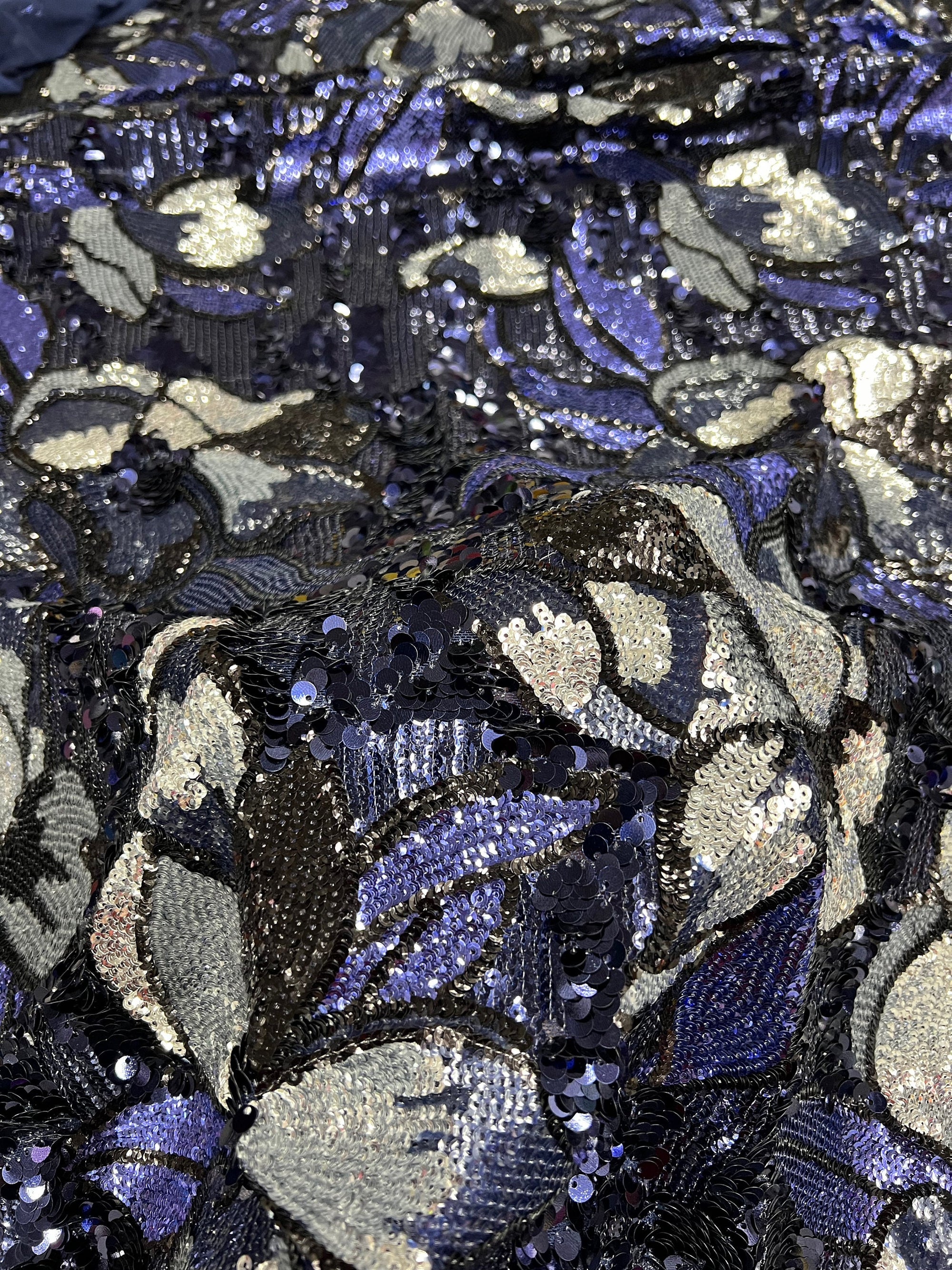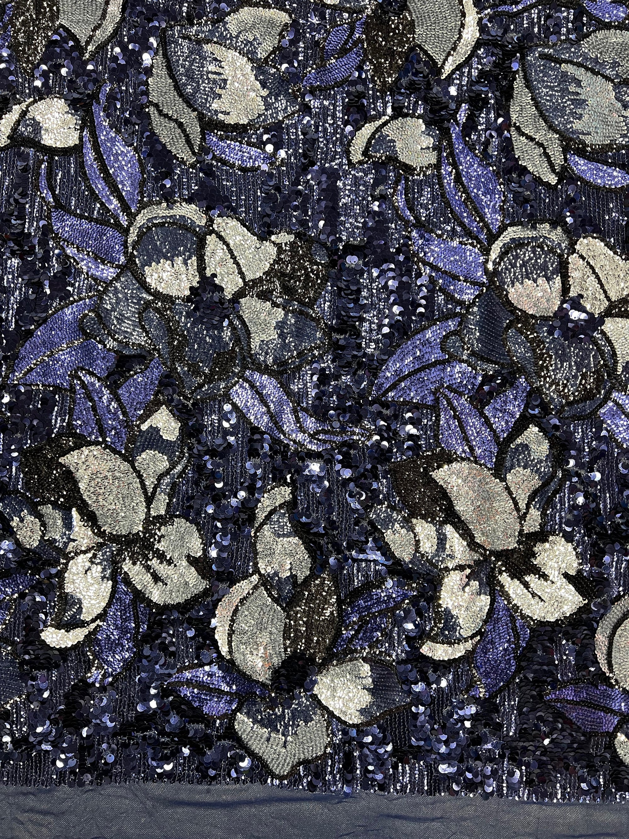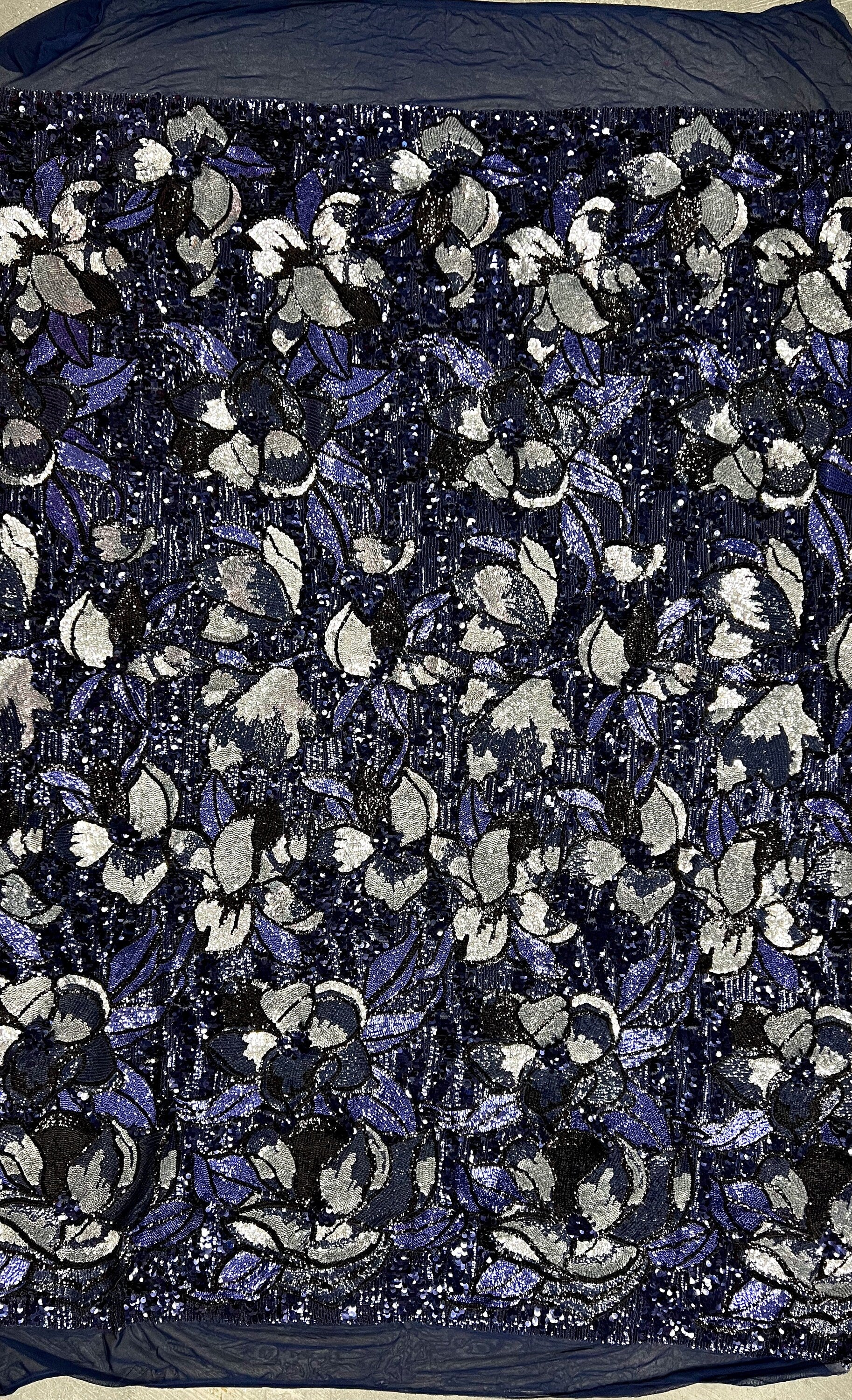 Natasha NAVY/SILVER Full Overlapping Sequins on Stretch Mesh Lace Fabric by the Yard - 10235