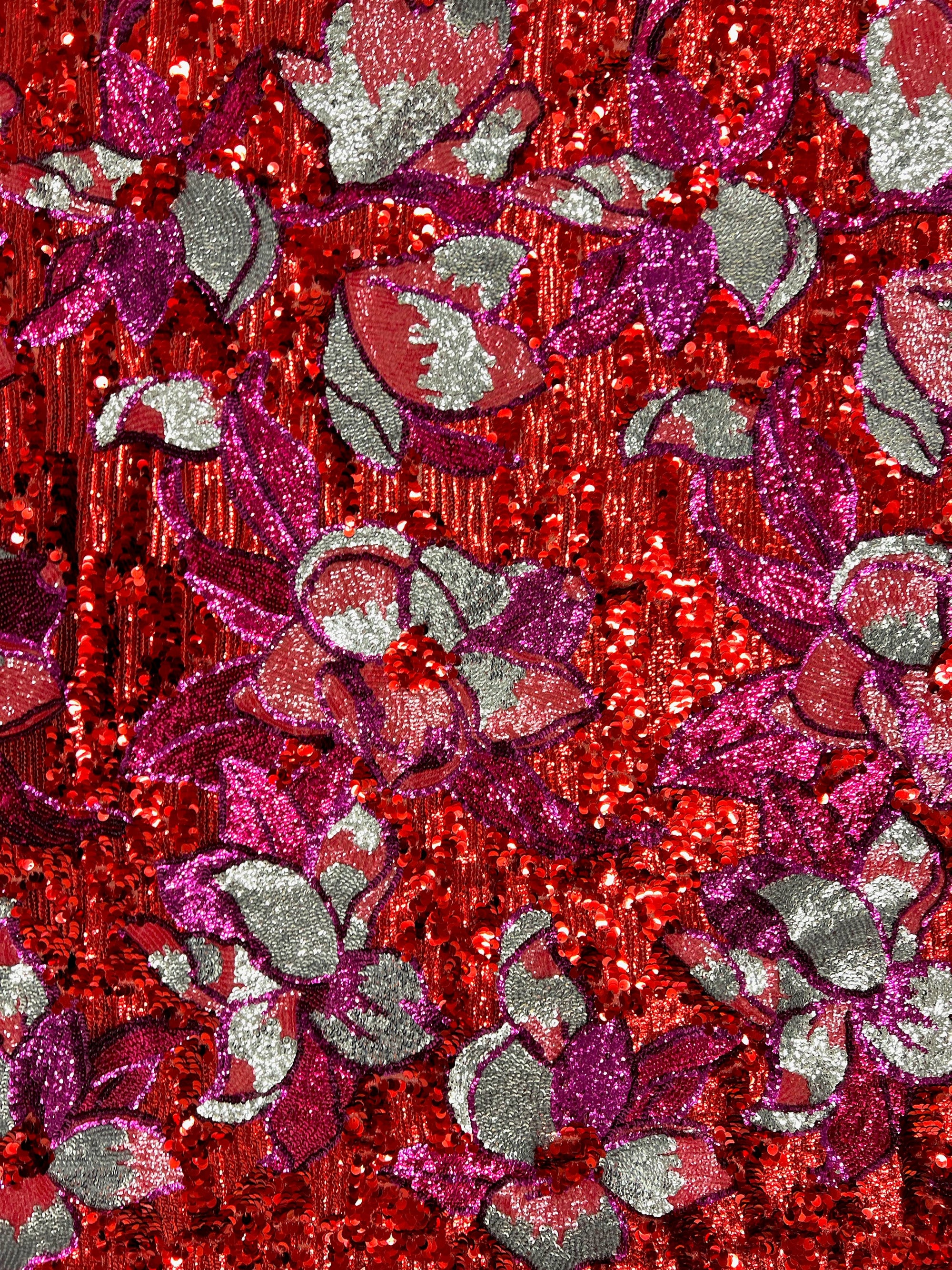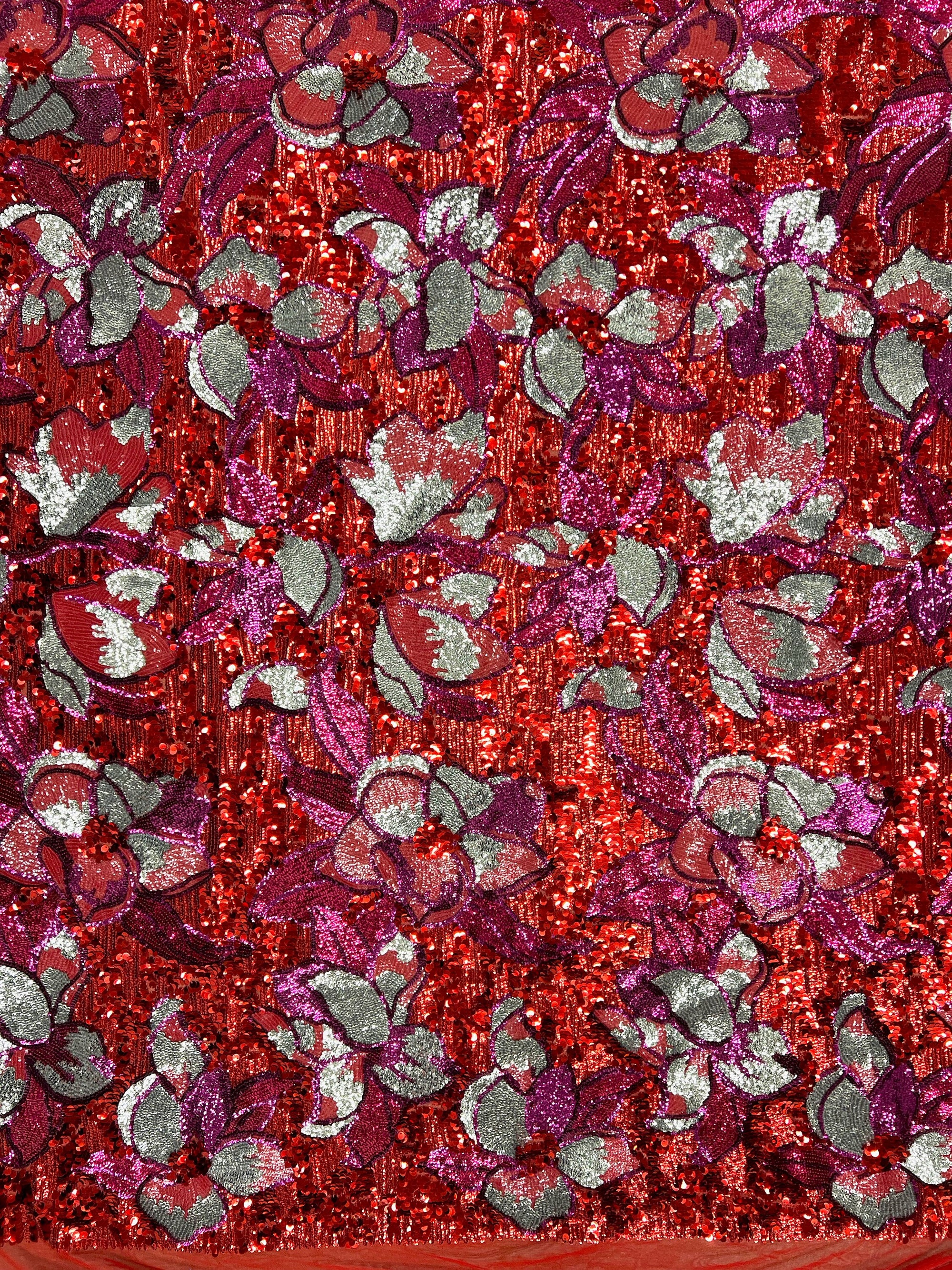 Natasha RED FUCHSIA SILVER Coral Full Overlapping Sequins on Red Stretch Mesh Lace Fabric by the Yard