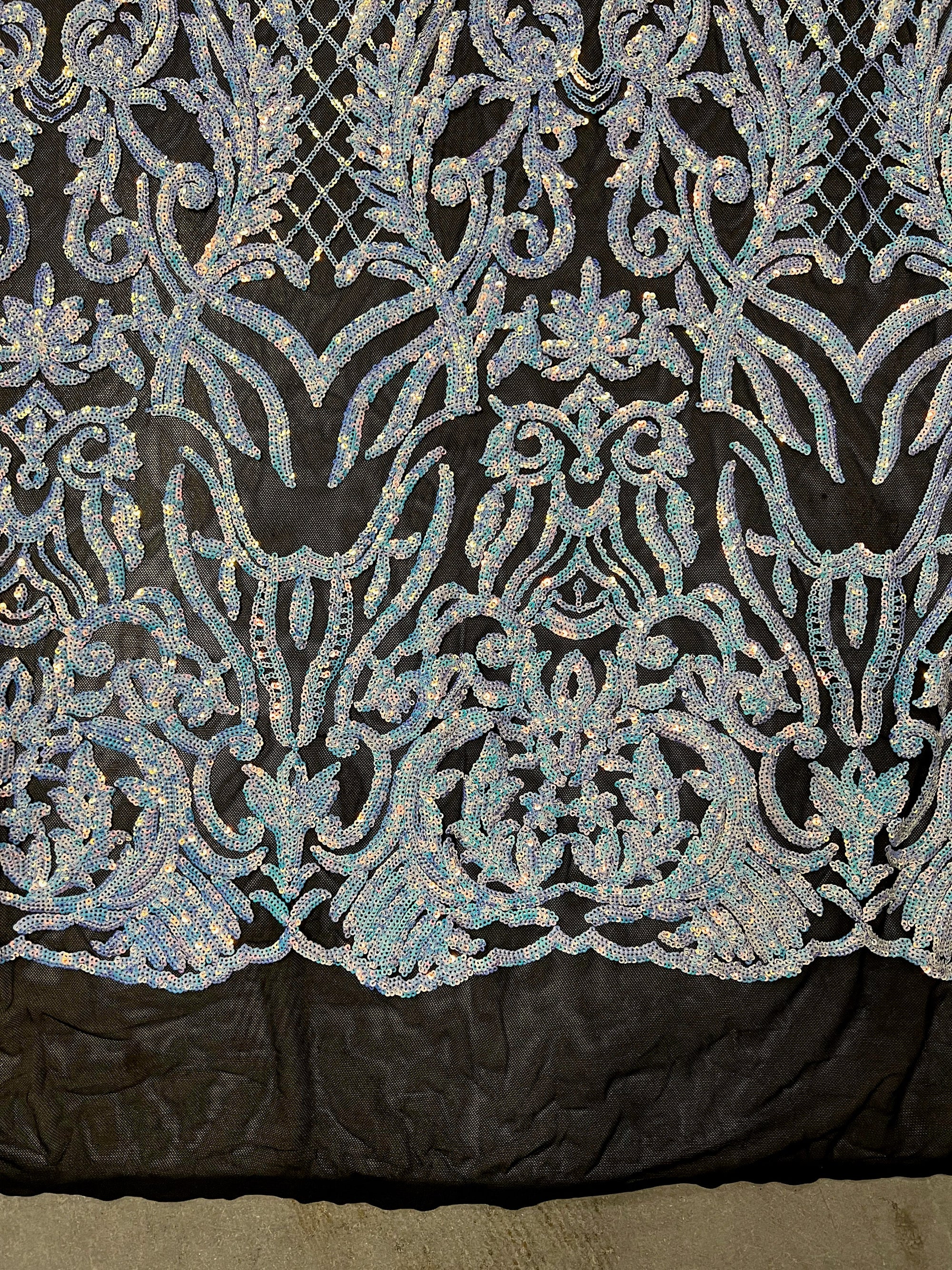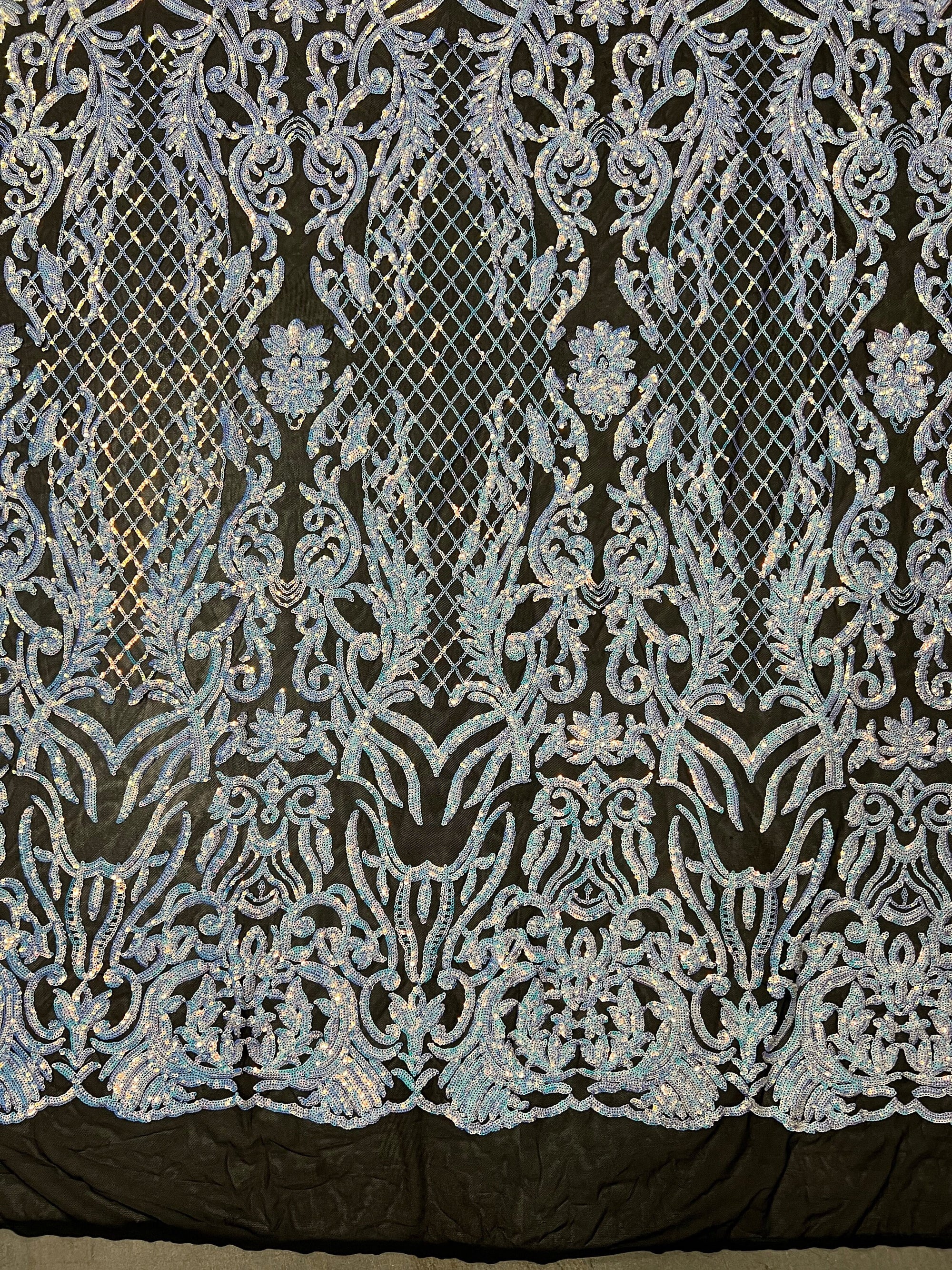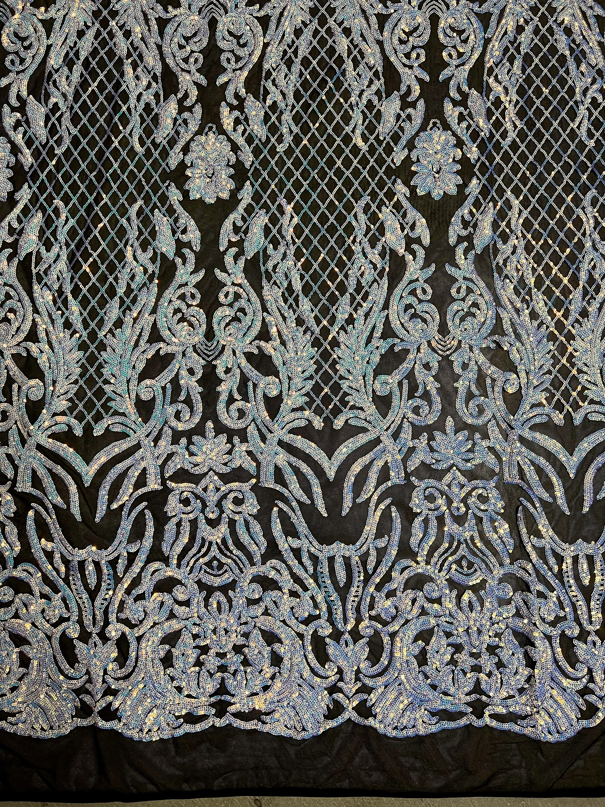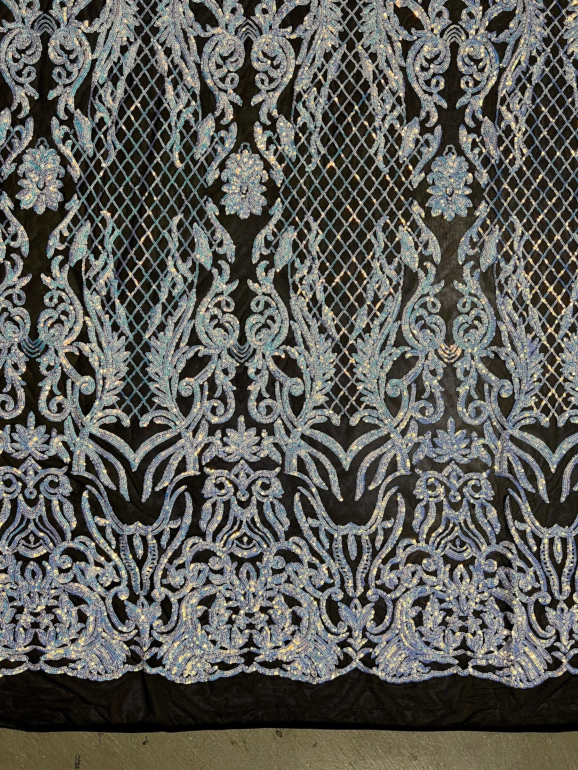 Phoebe IRIDESCENT WHITE Sequins on BLACK Mesh Lace Fabric by the Yard - 10062
