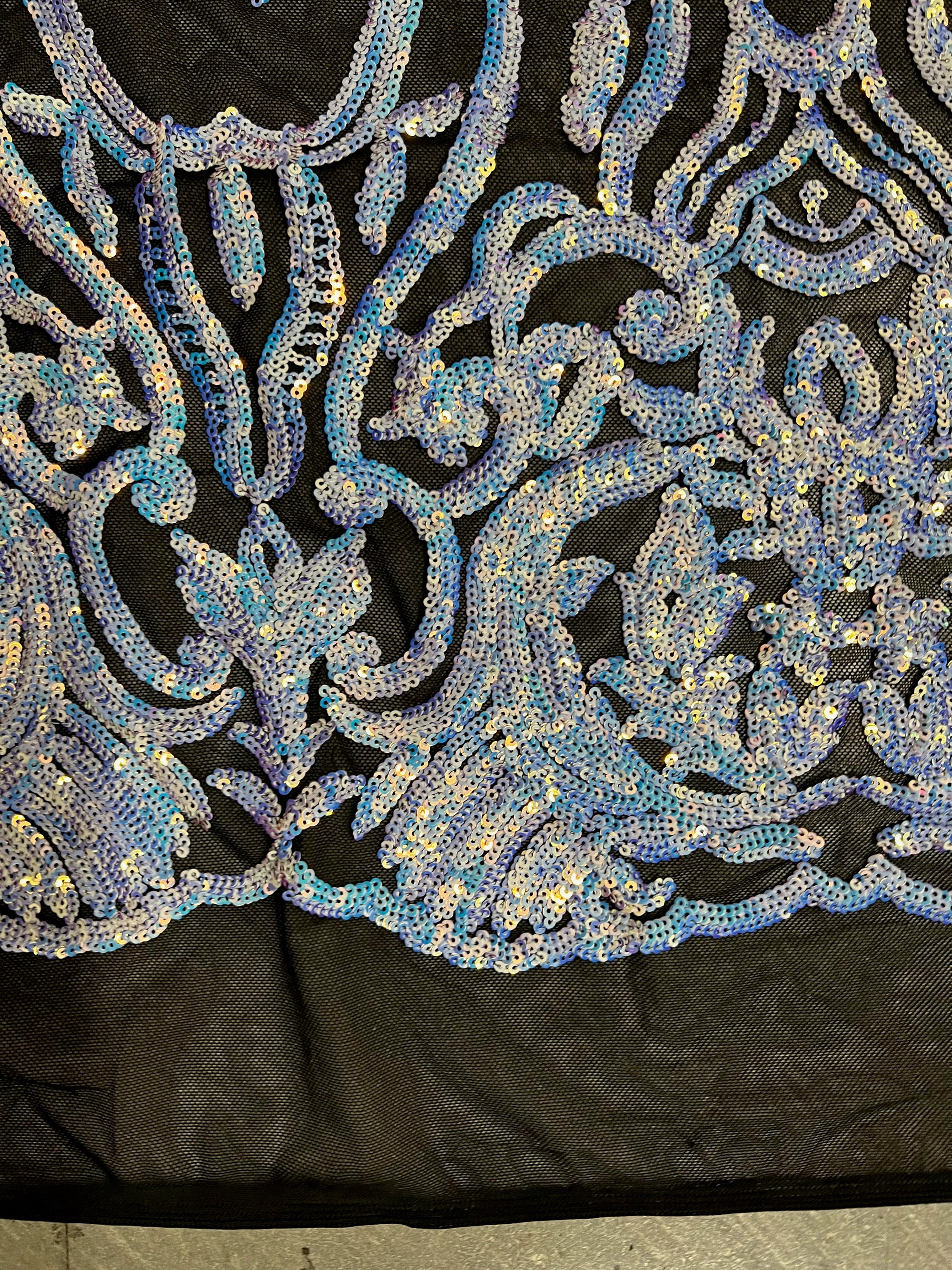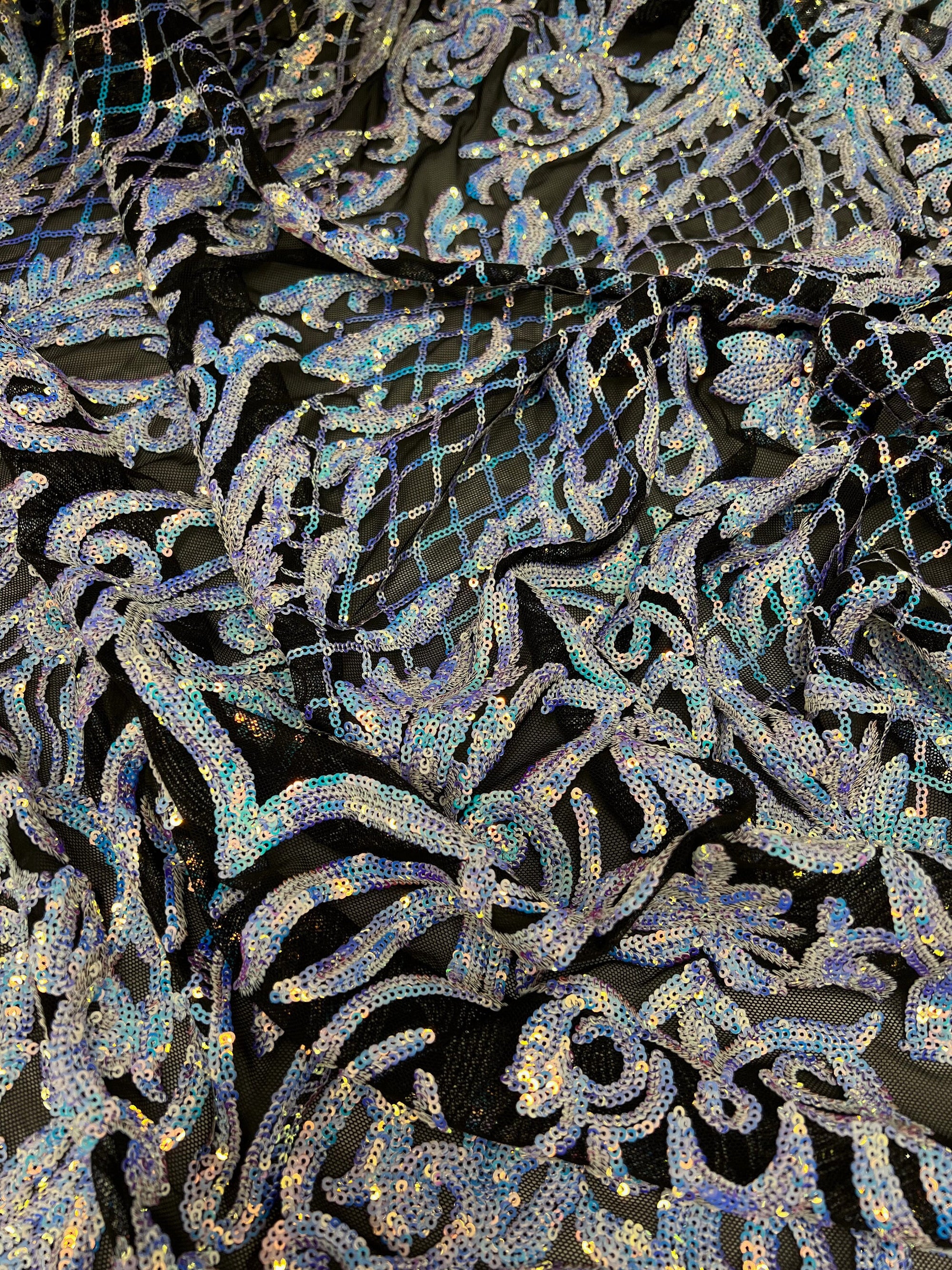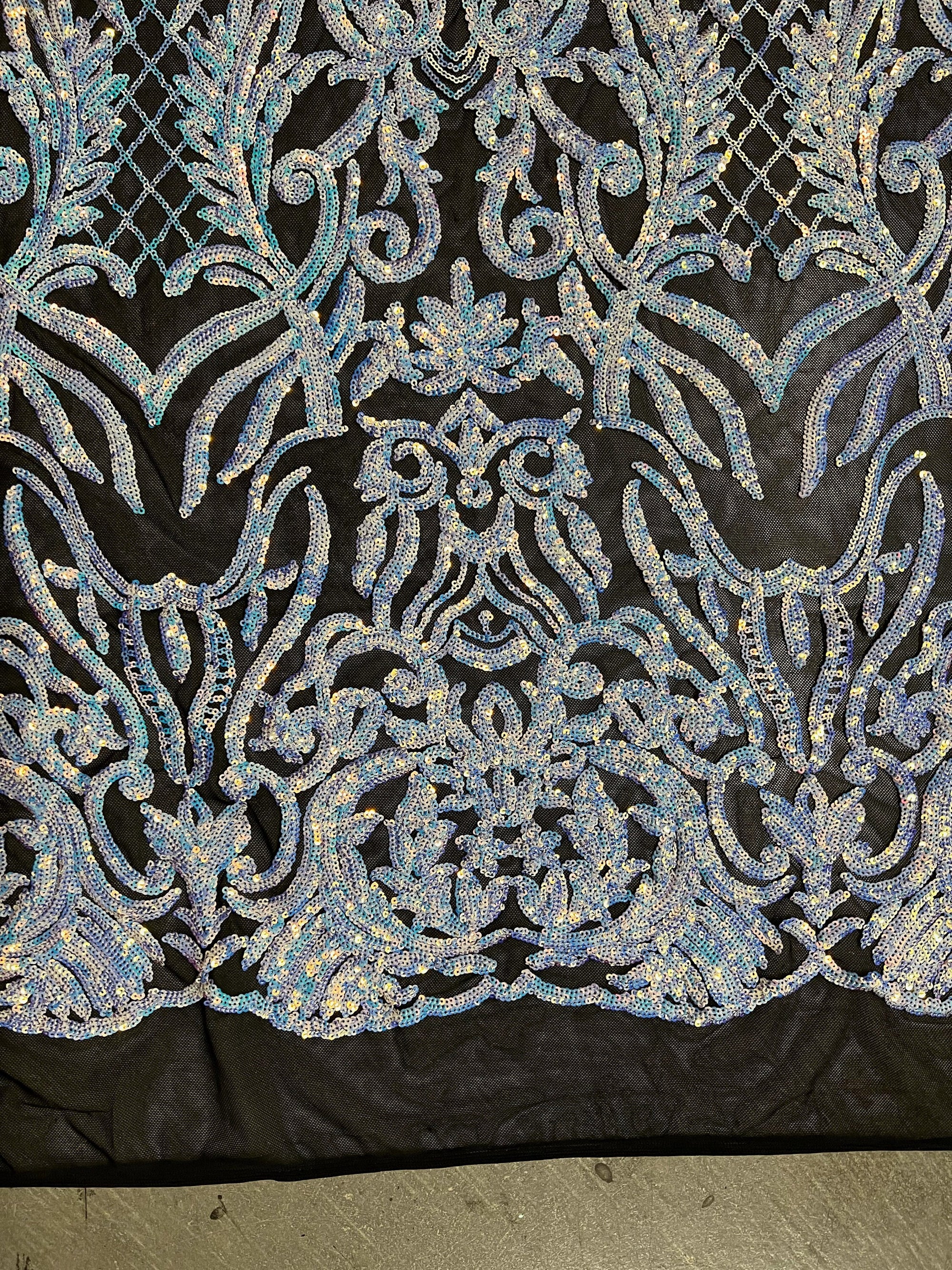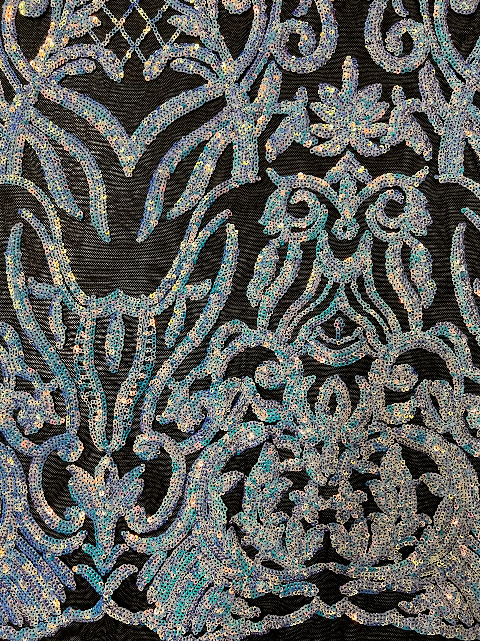 Phoebe IRIDESCENT WHITE Sequins on BLACK Mesh Lace Fabric by the Yard - 10062