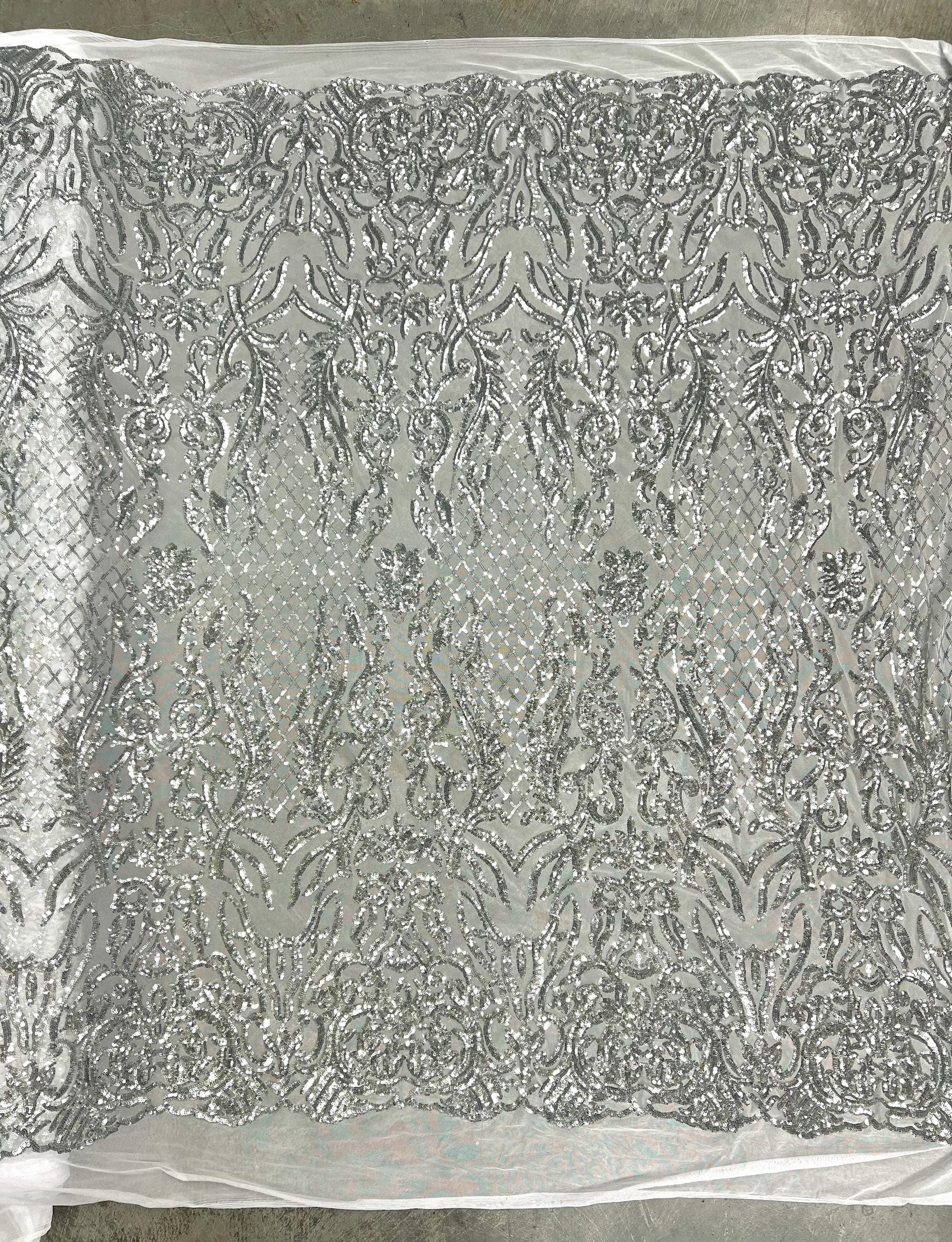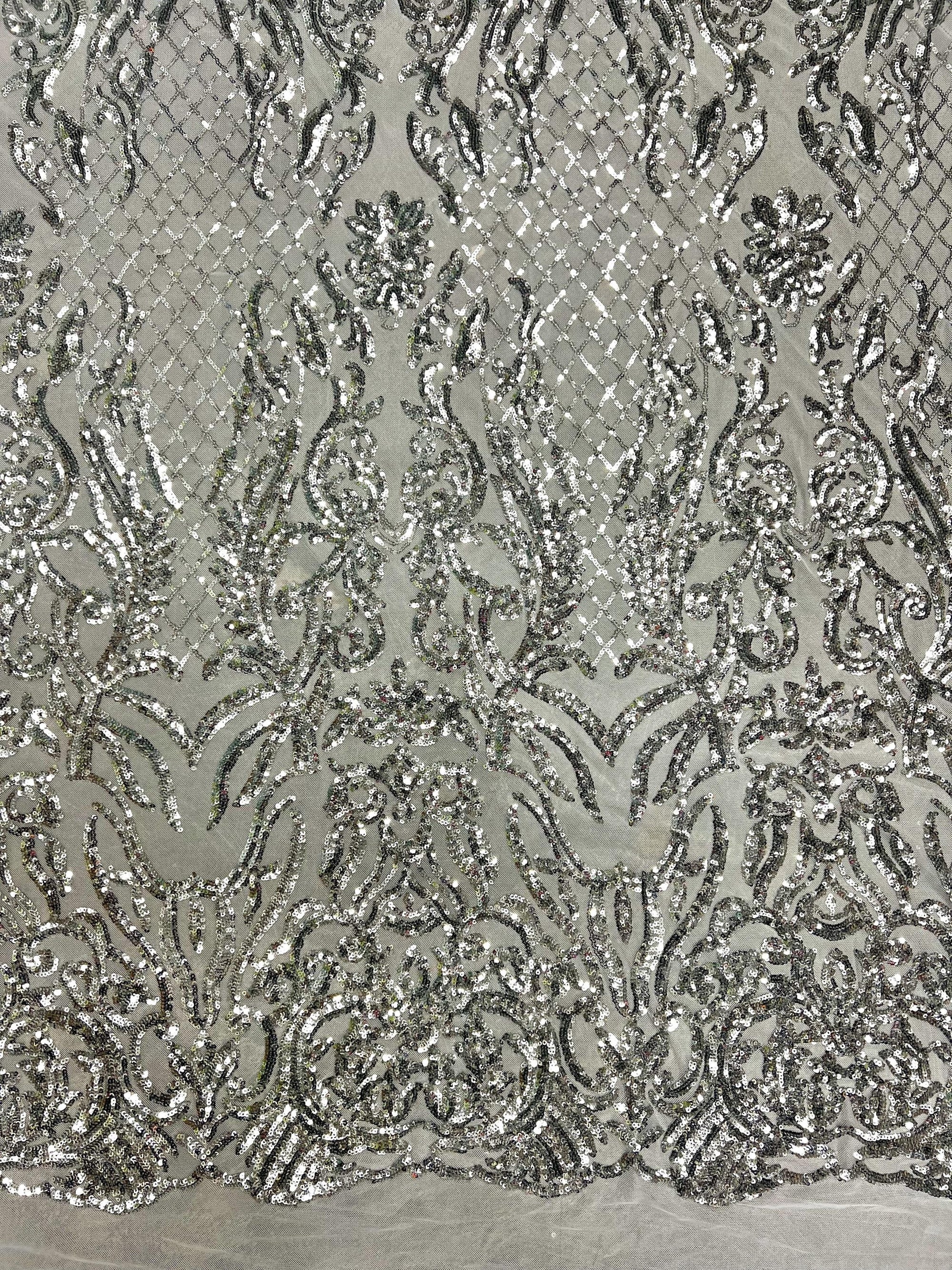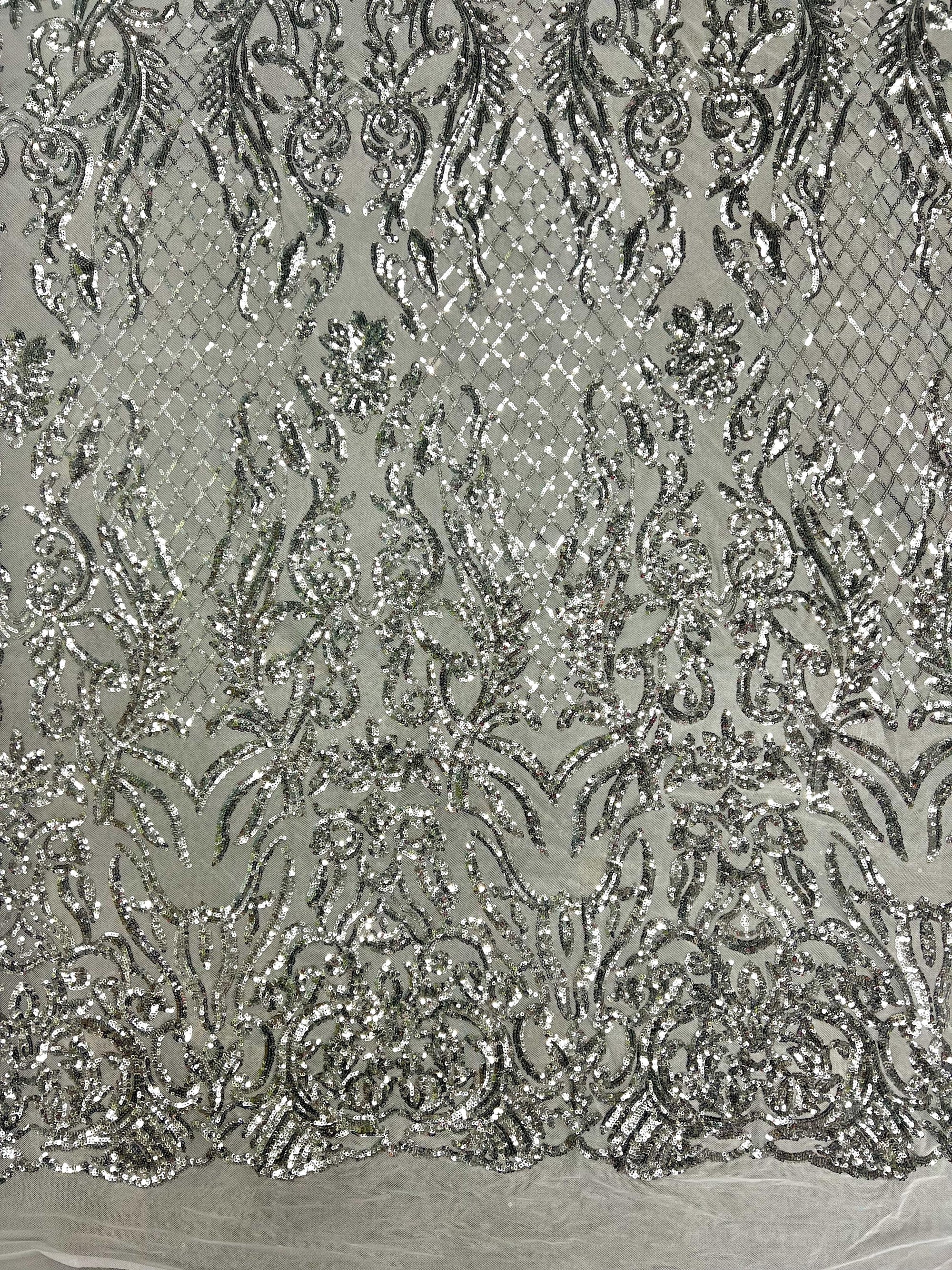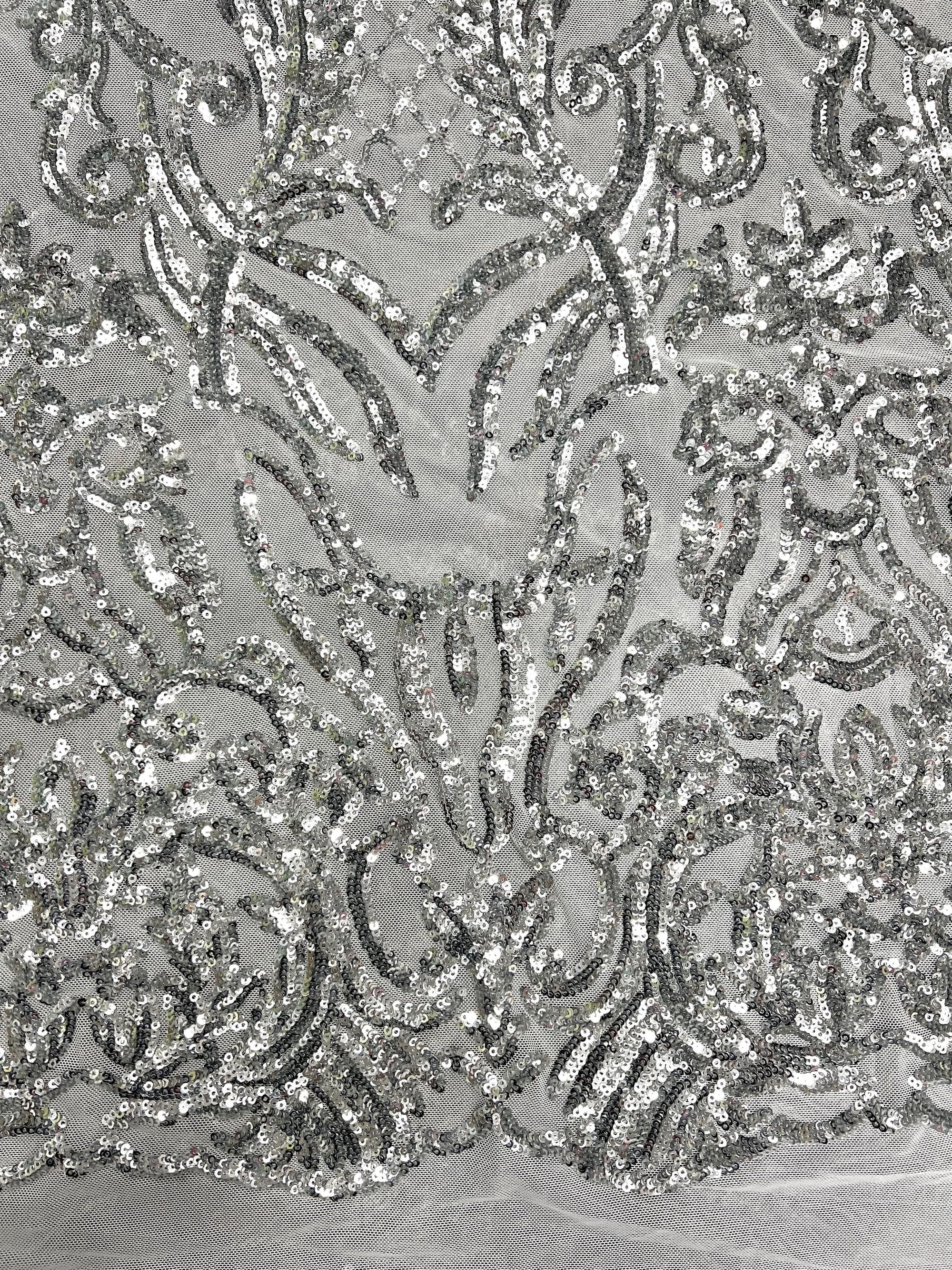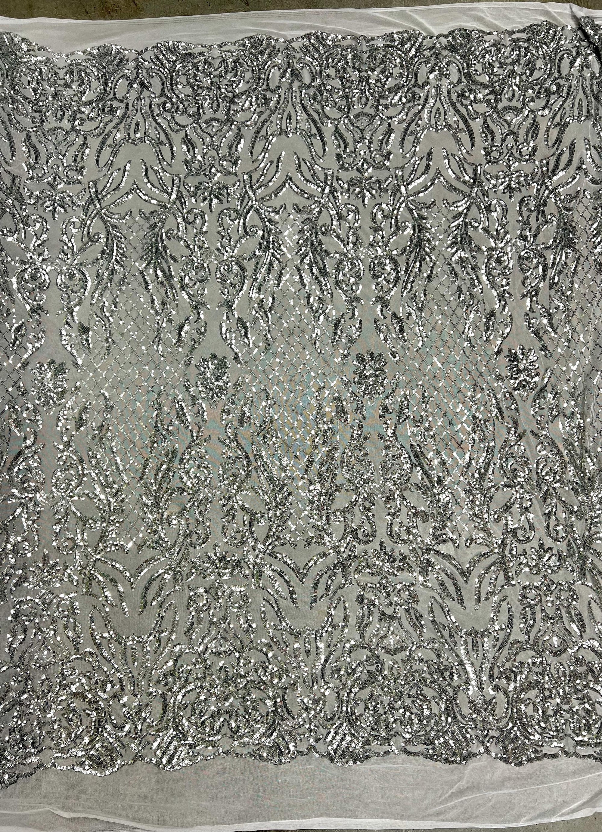 Phoebe SILVER Sequins on WHITE Mesh Lace Fabric by the Yard - 10062