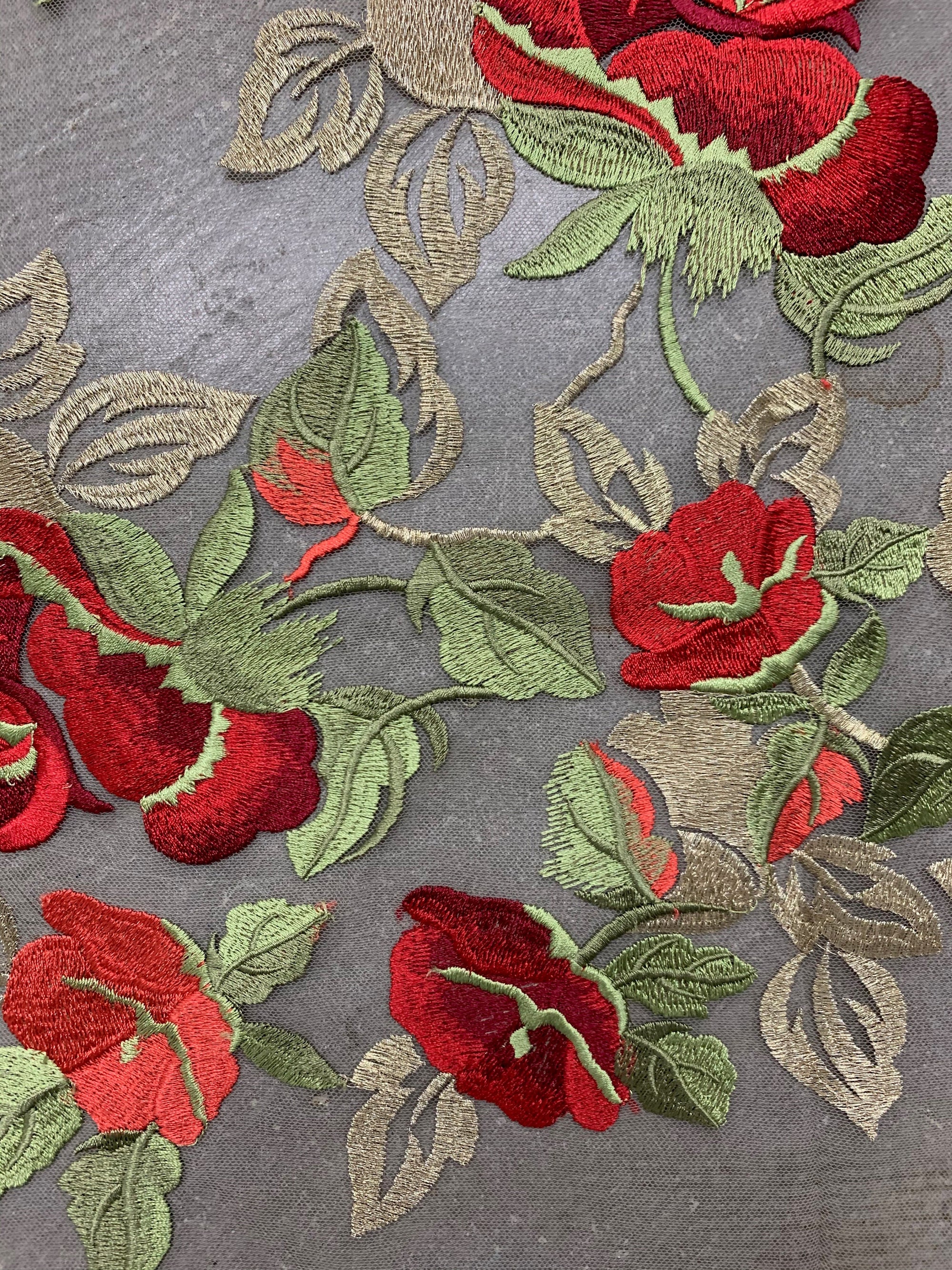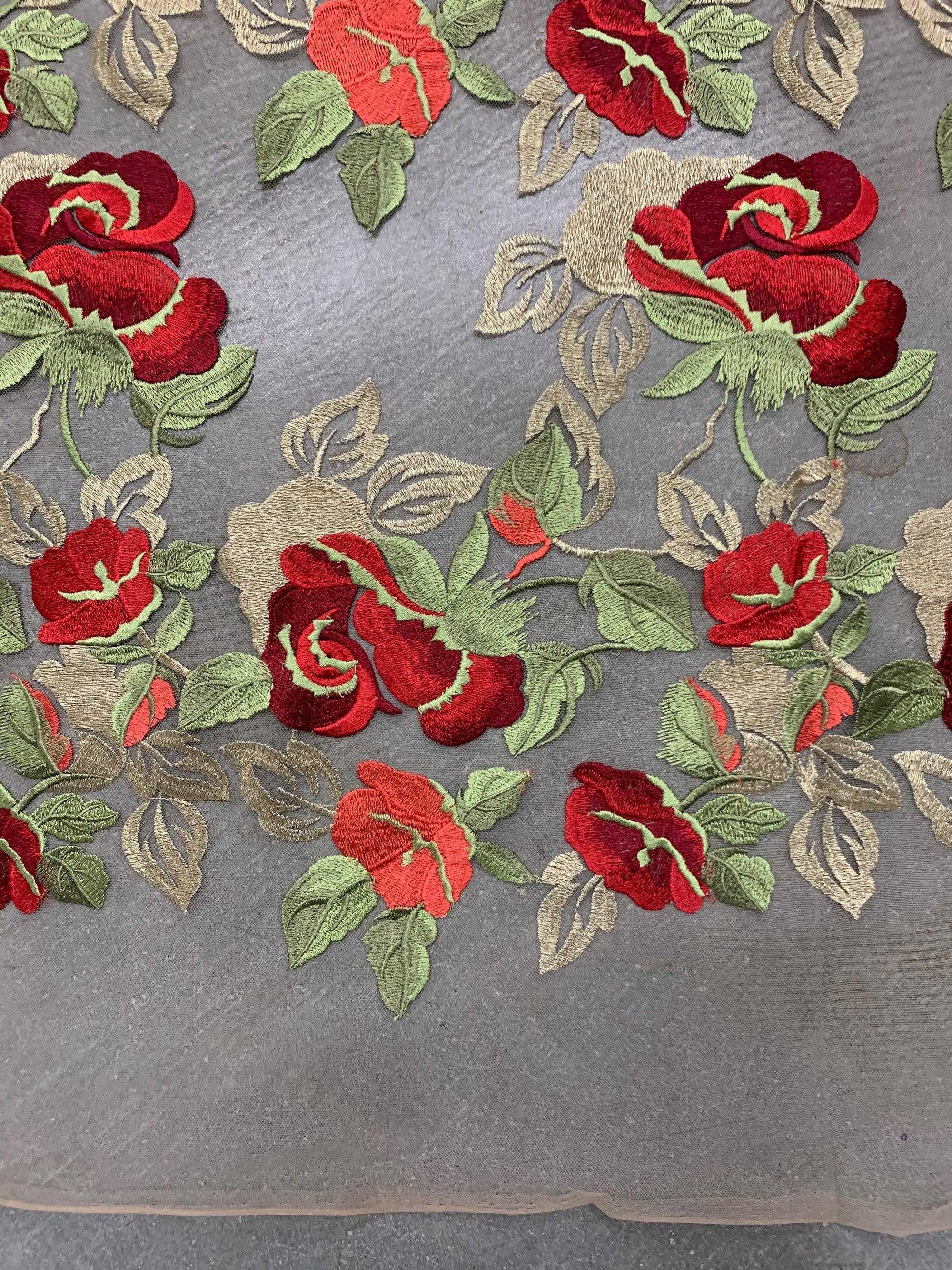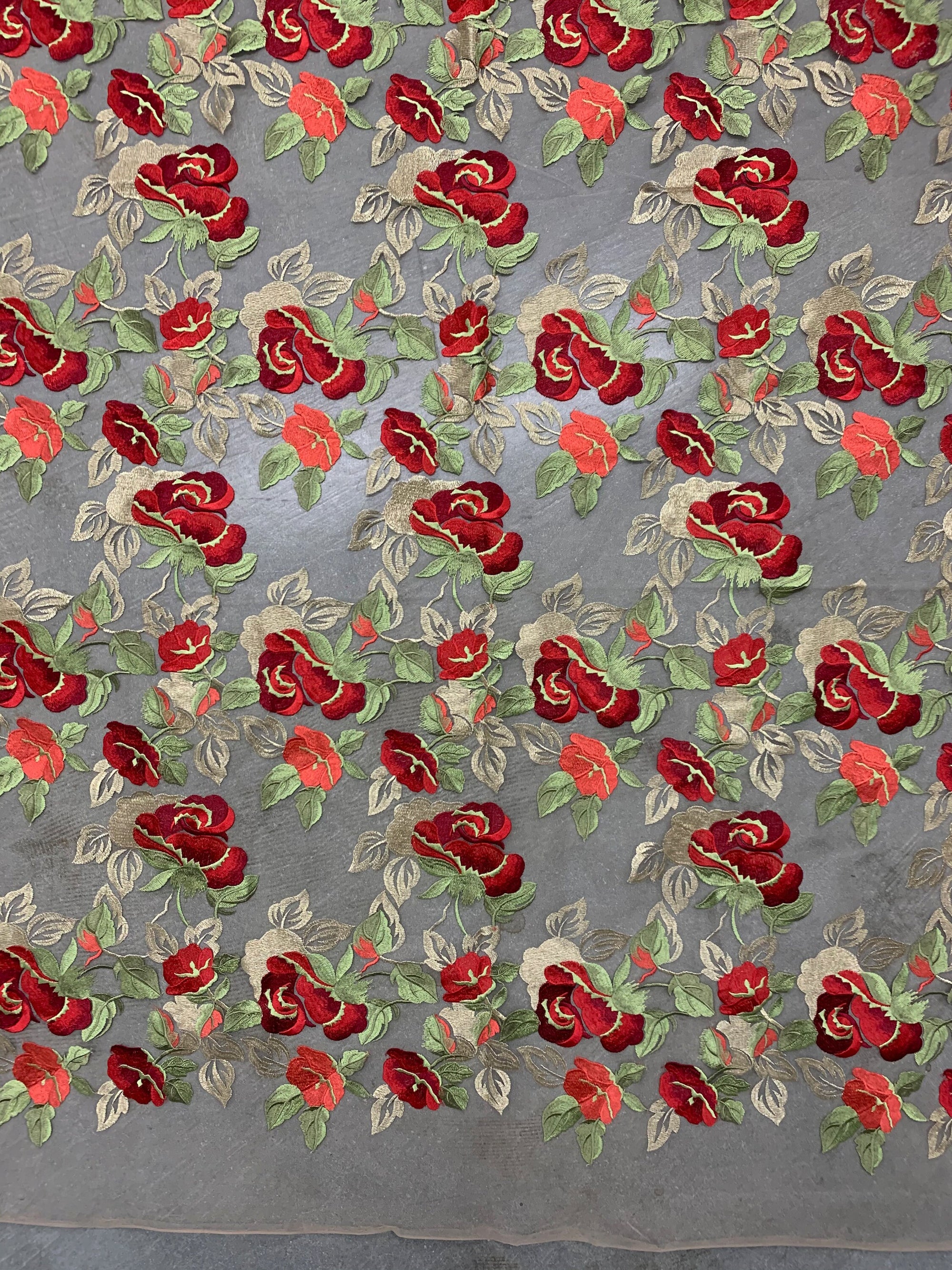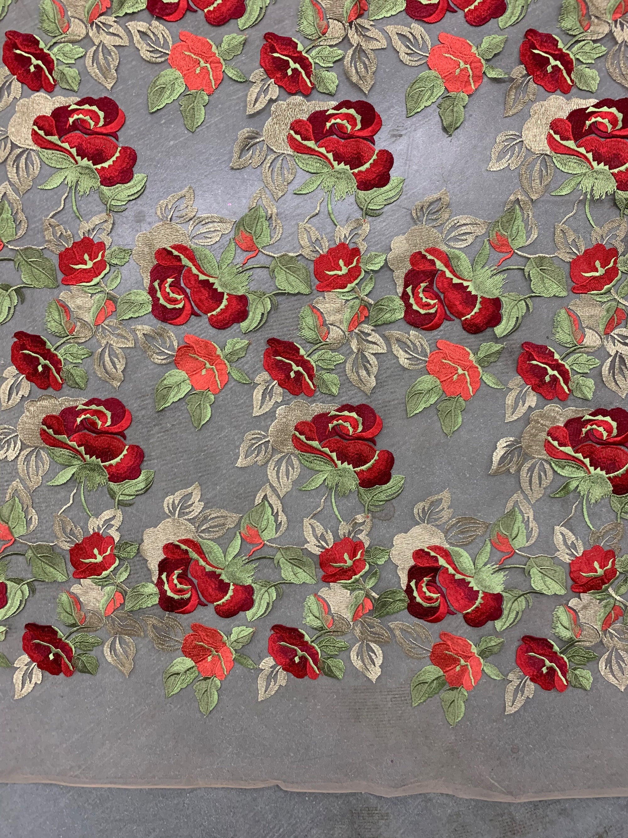 Priscilla RED GOLD Floral and Leaves Embroidery on Mesh Lace Fabric by the Yard - 10157