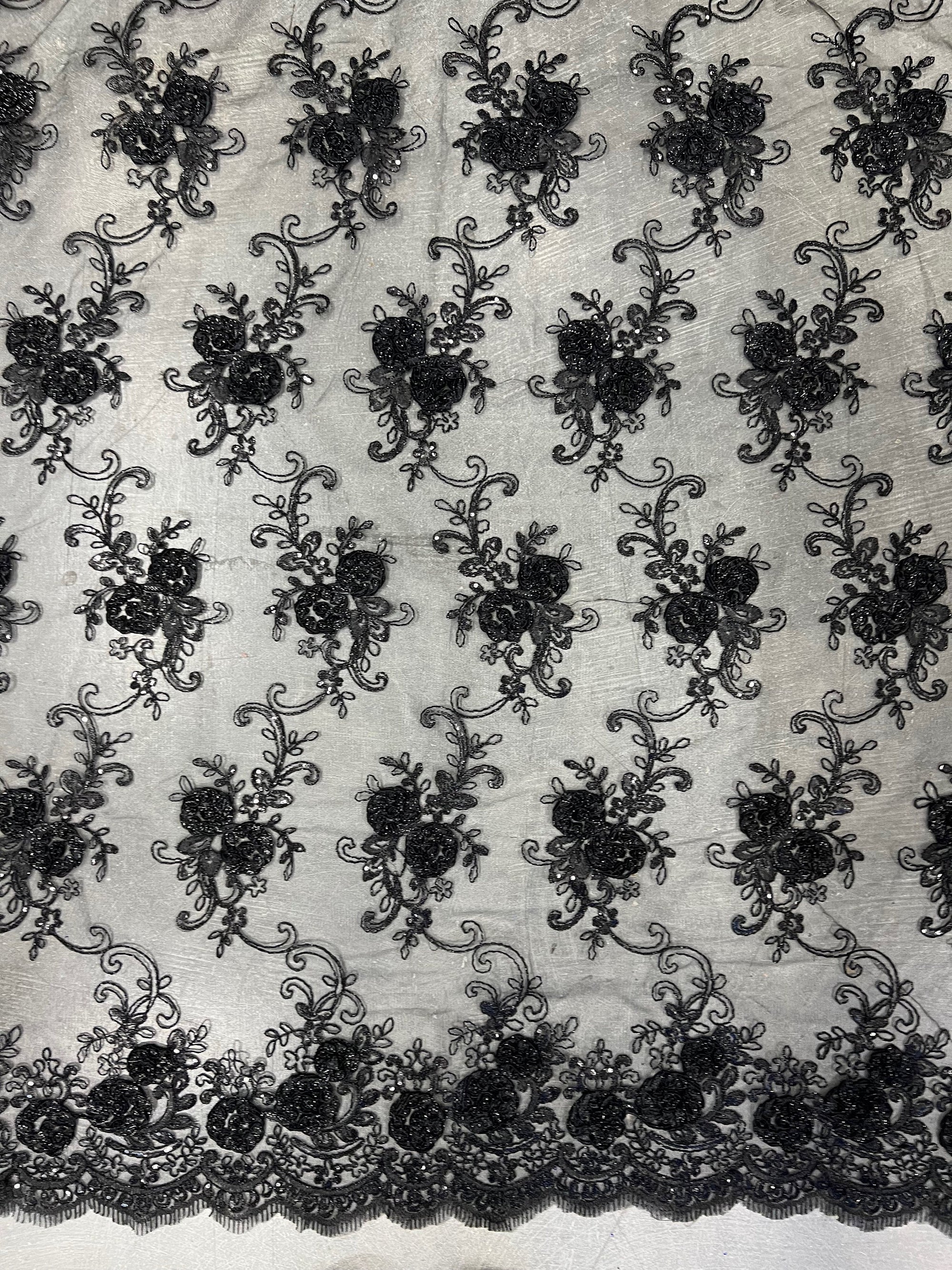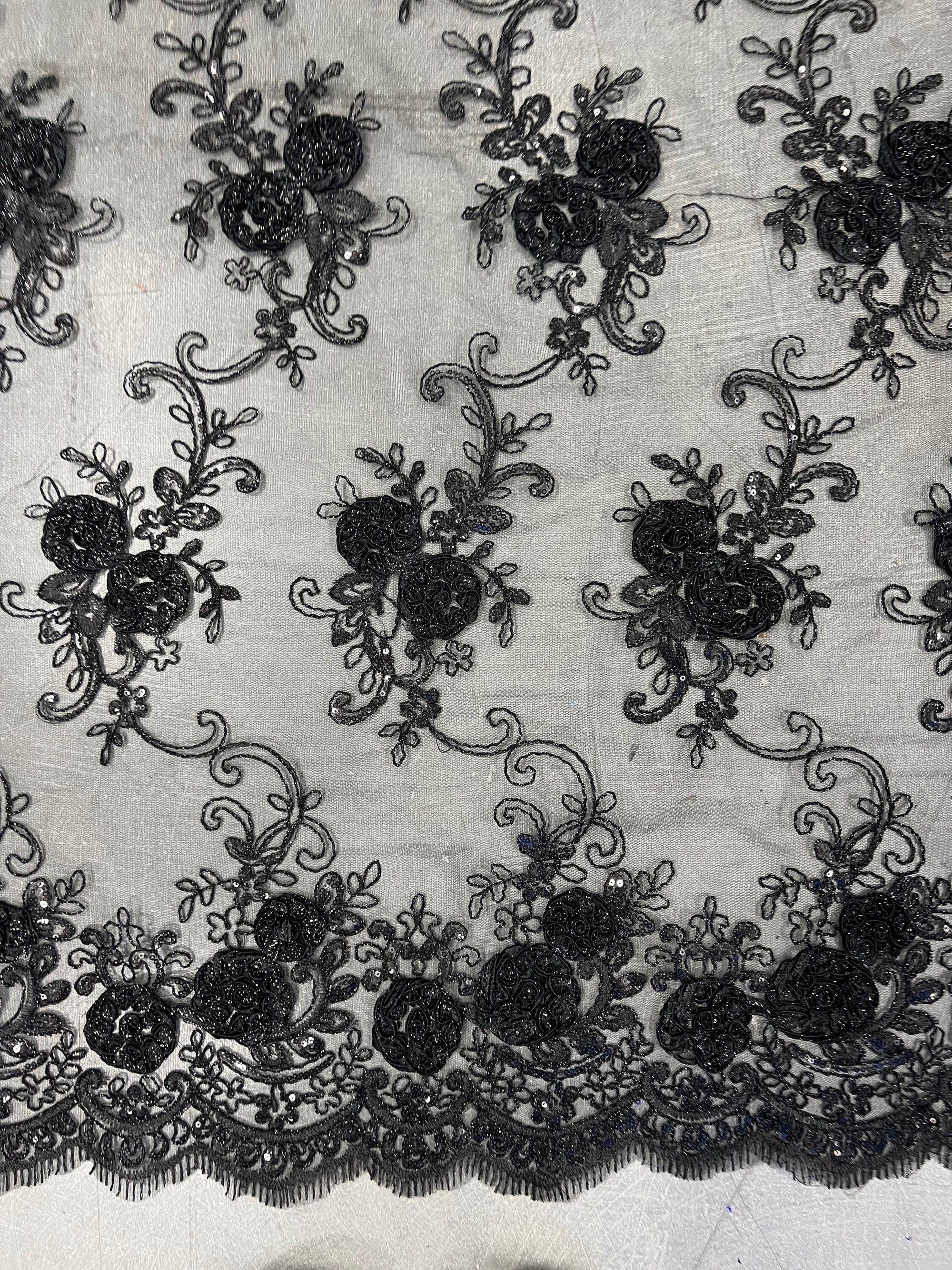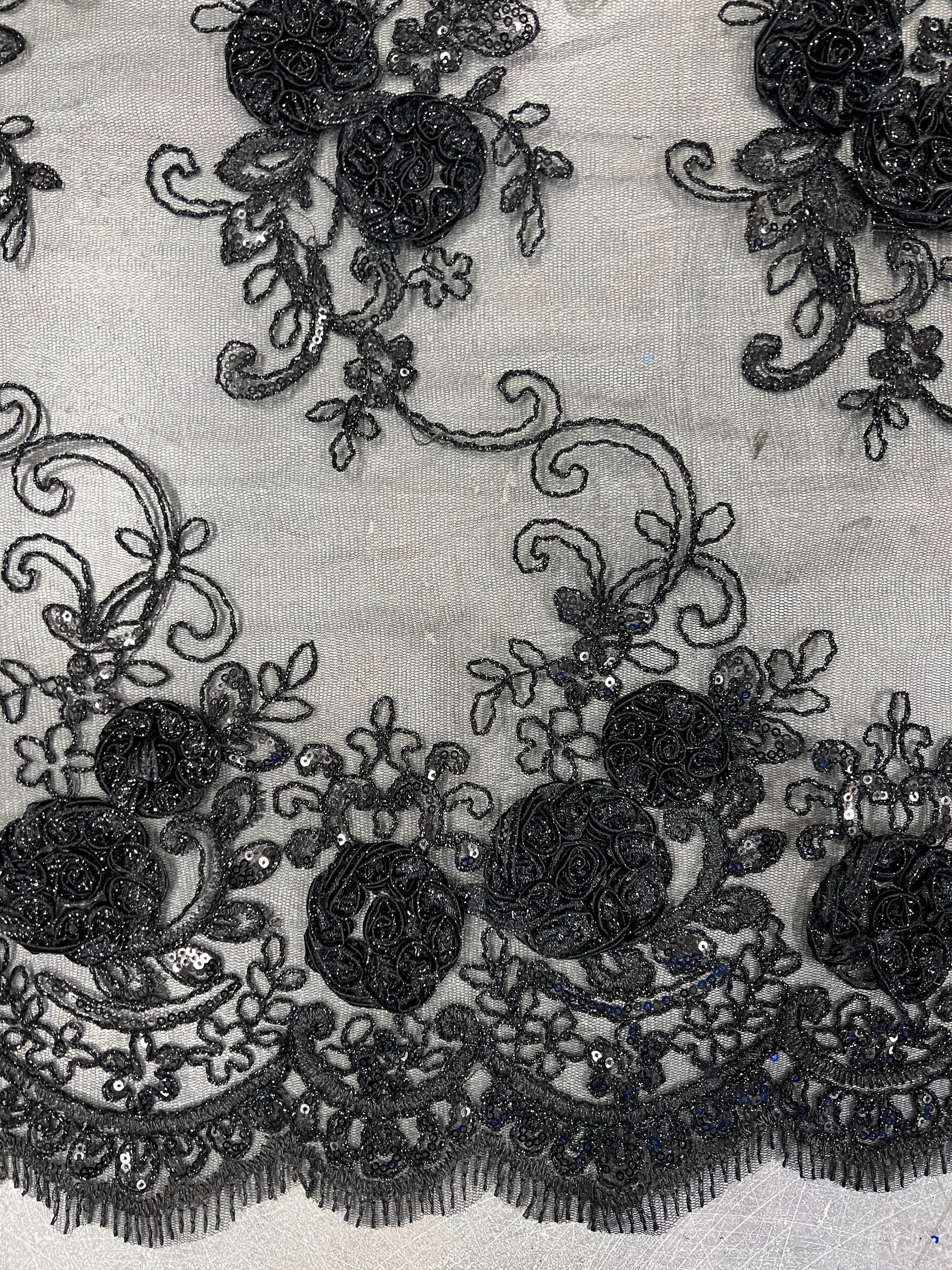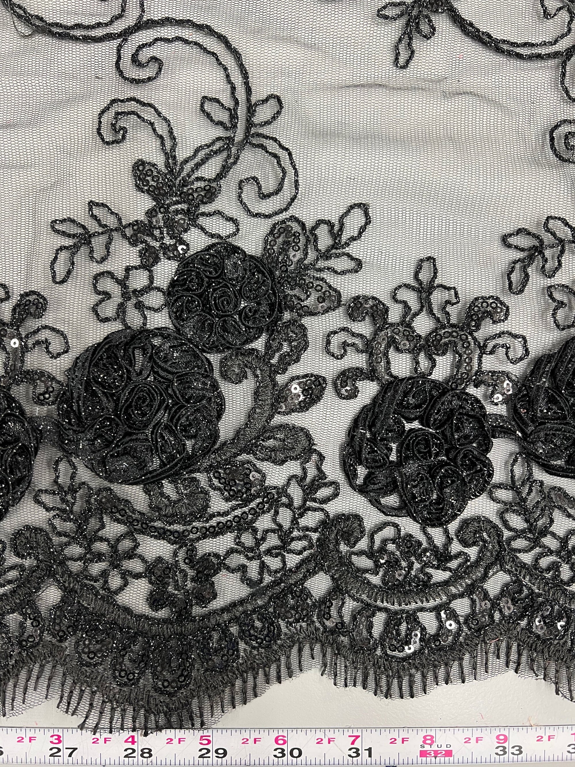 Ryleigh BLACK 3-D Floral Embroidery with Foil & Sequins on Mesh Lace Fabric by the Yard - 10010