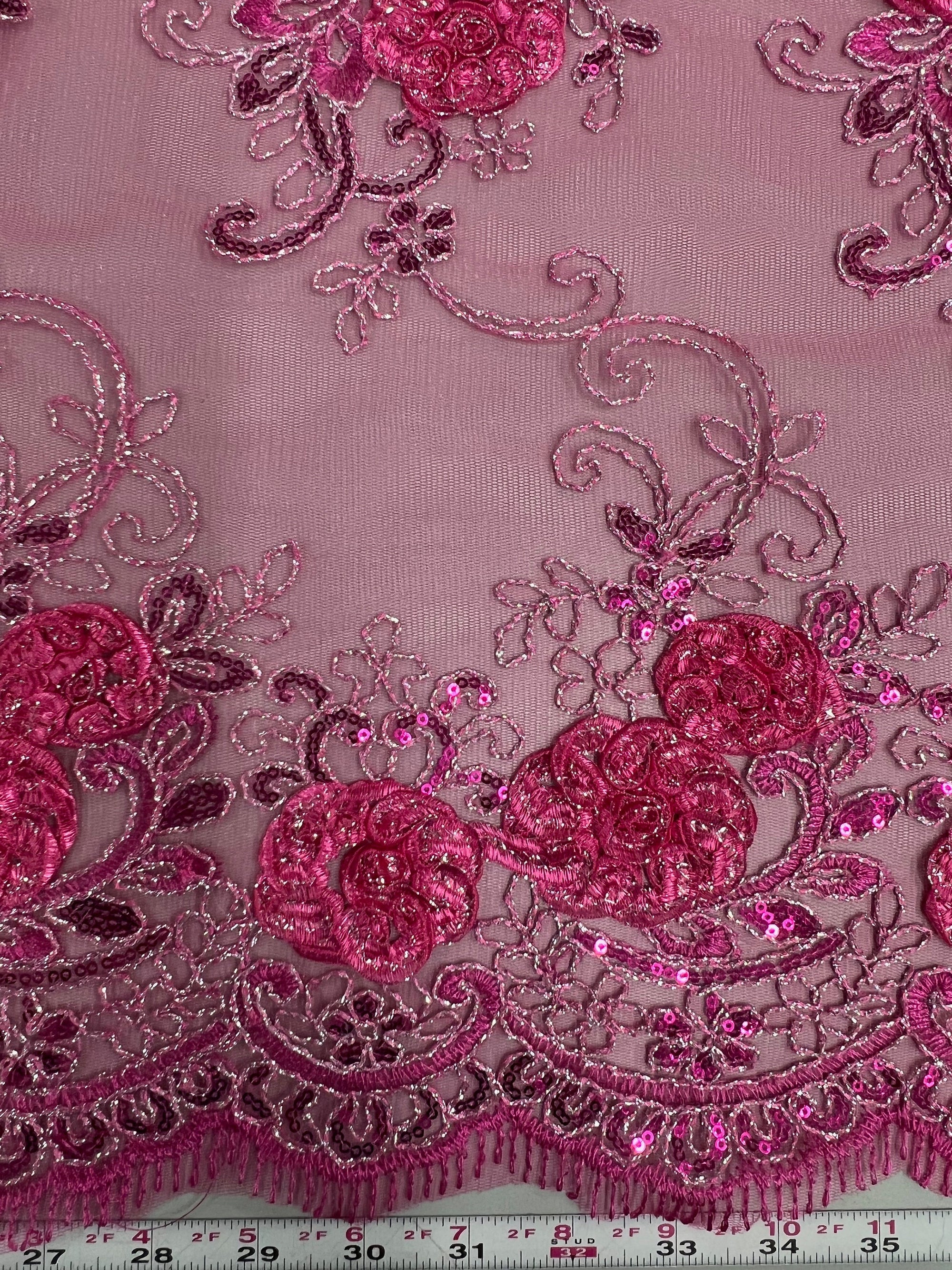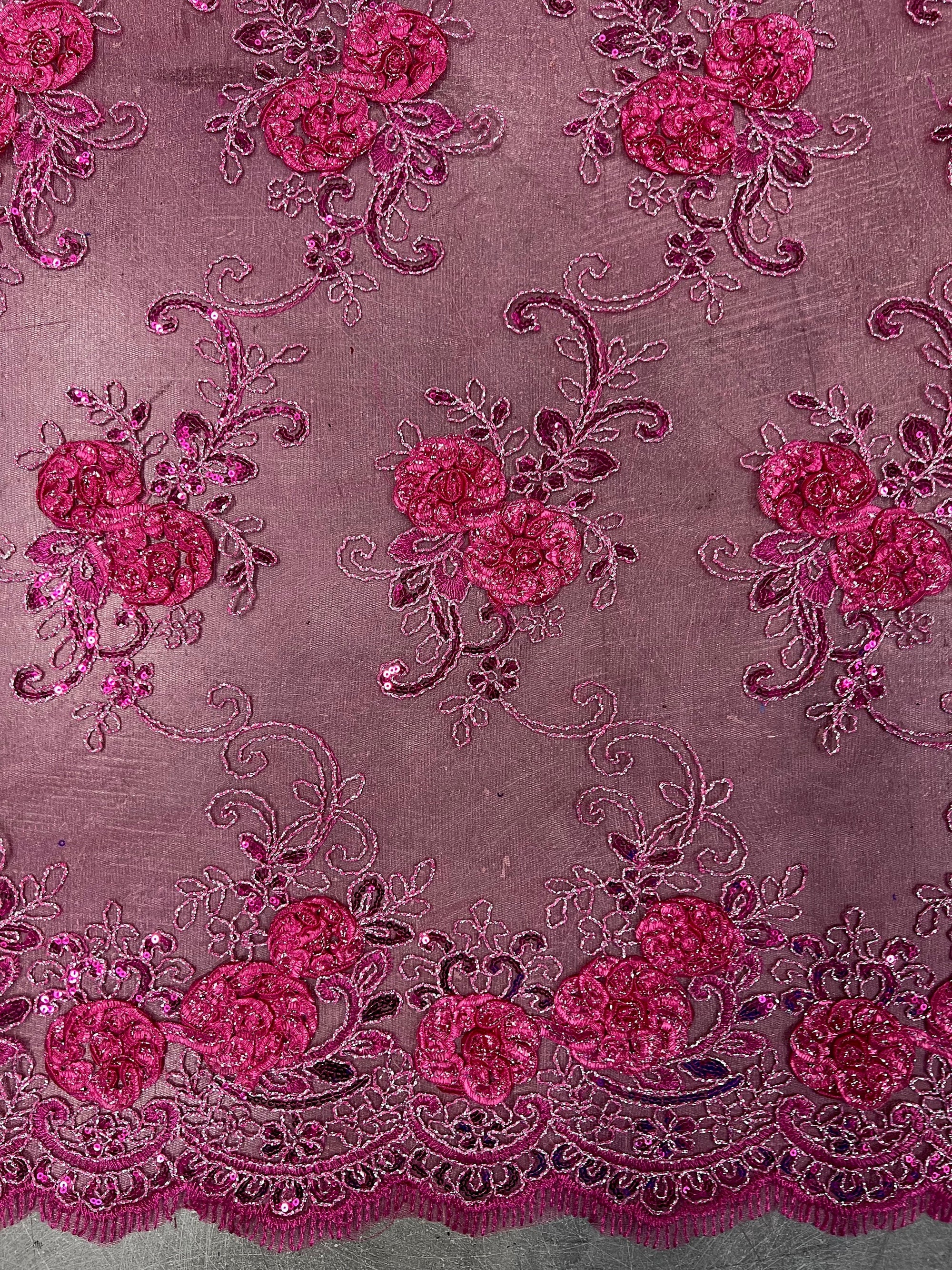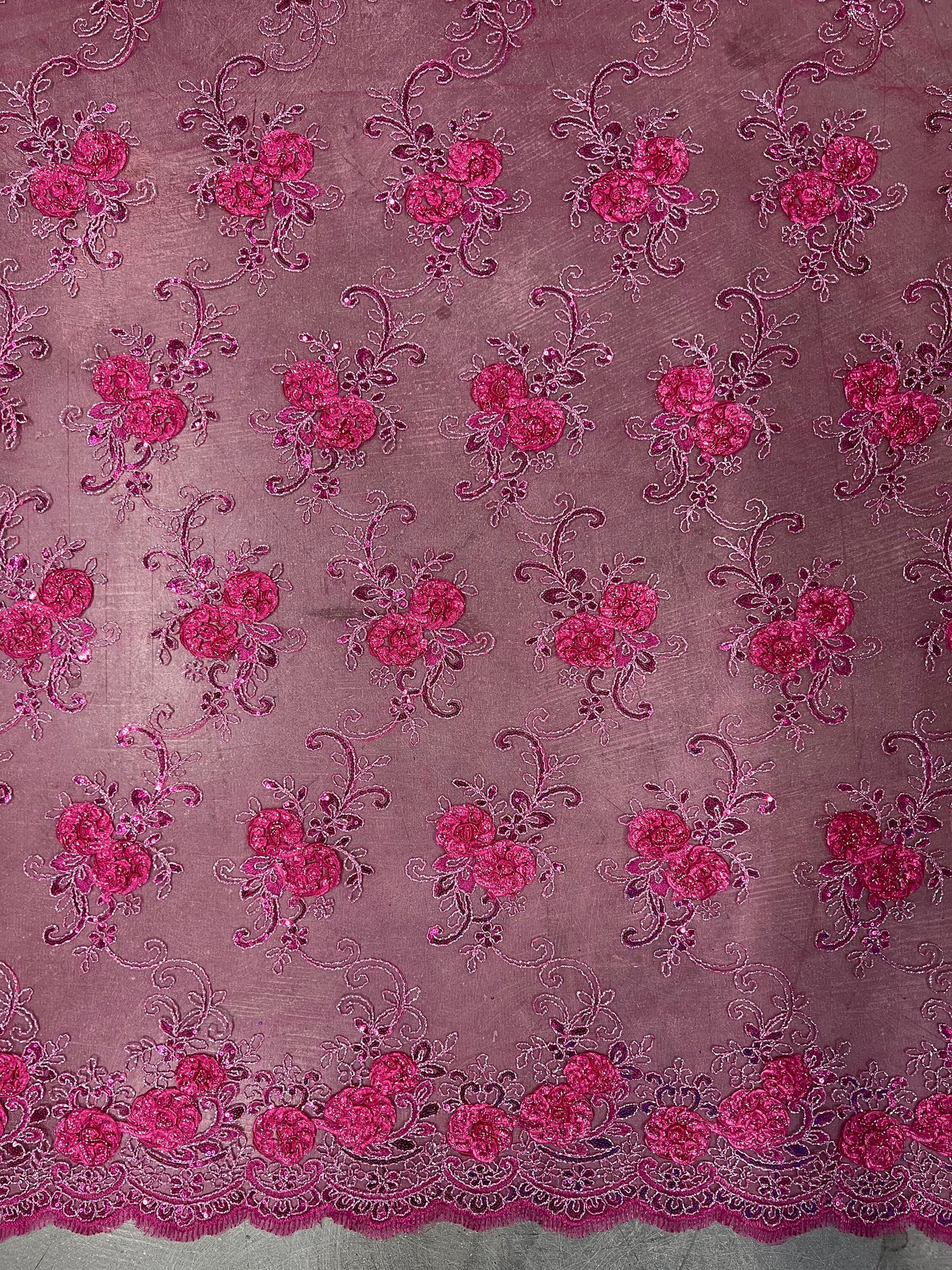 Ryleigh FUCHSIA 3-D Floral Embroidery with Foil & Sequins on Mesh Lace Fabric by the Yard - 10010
