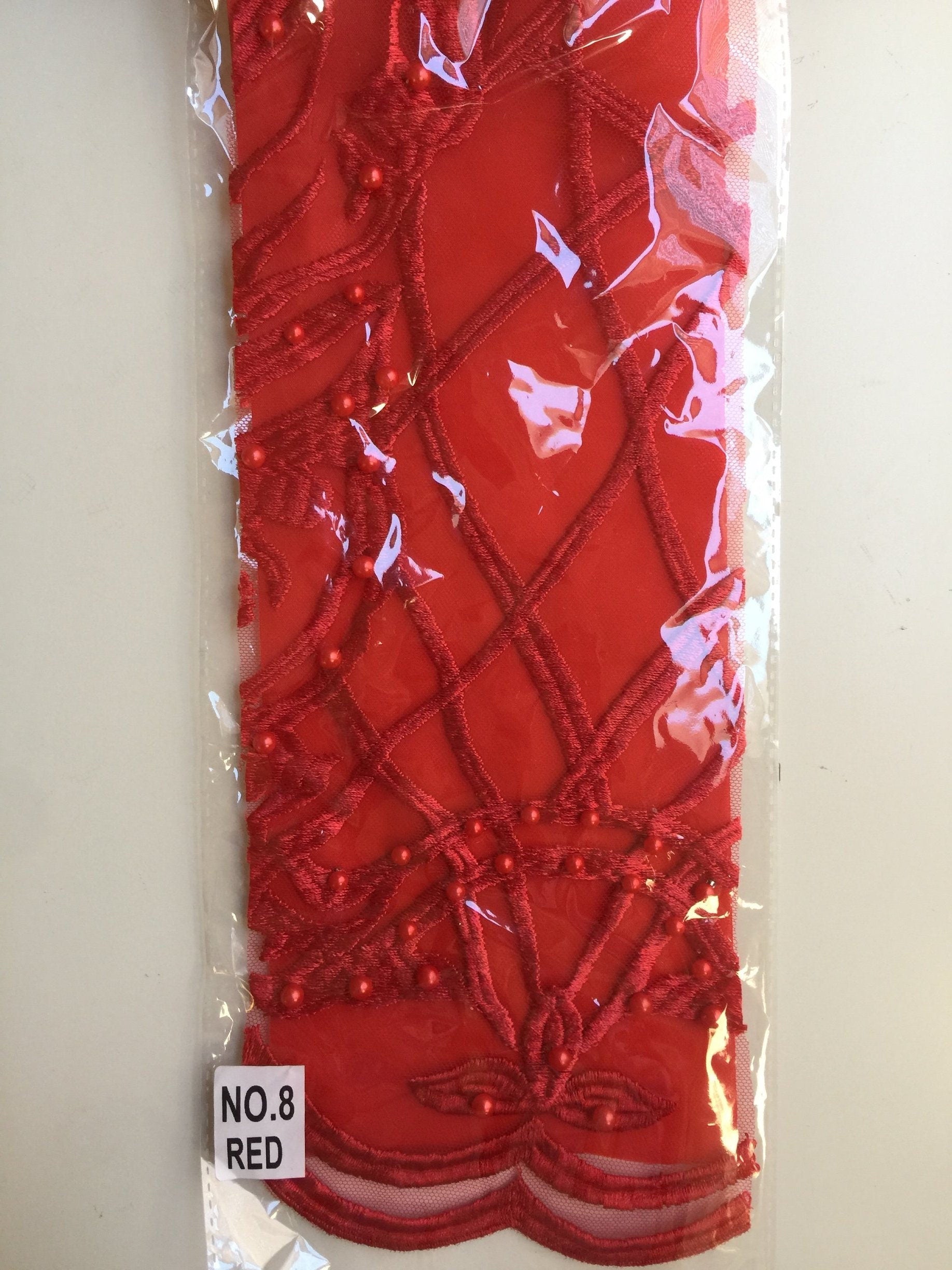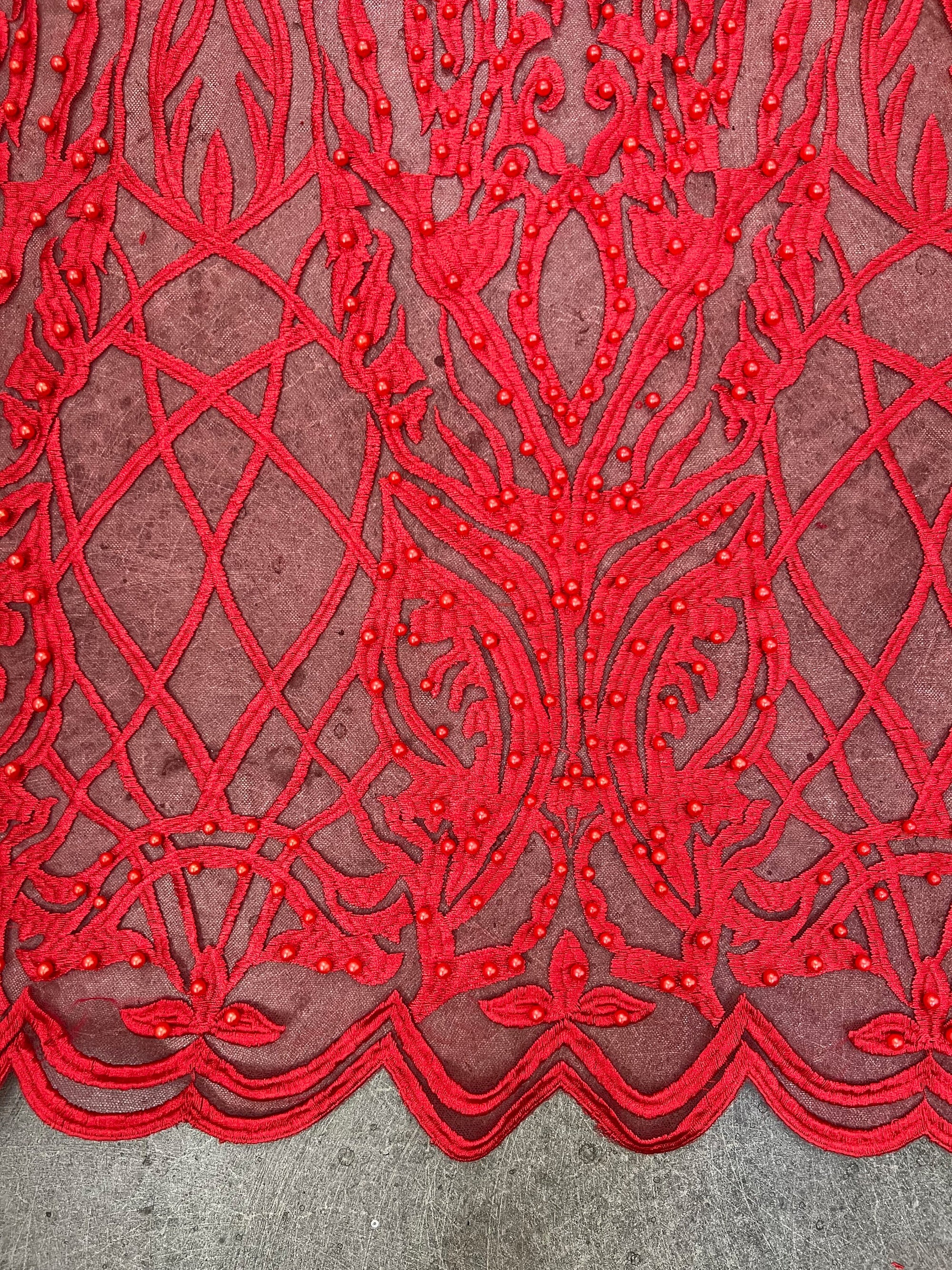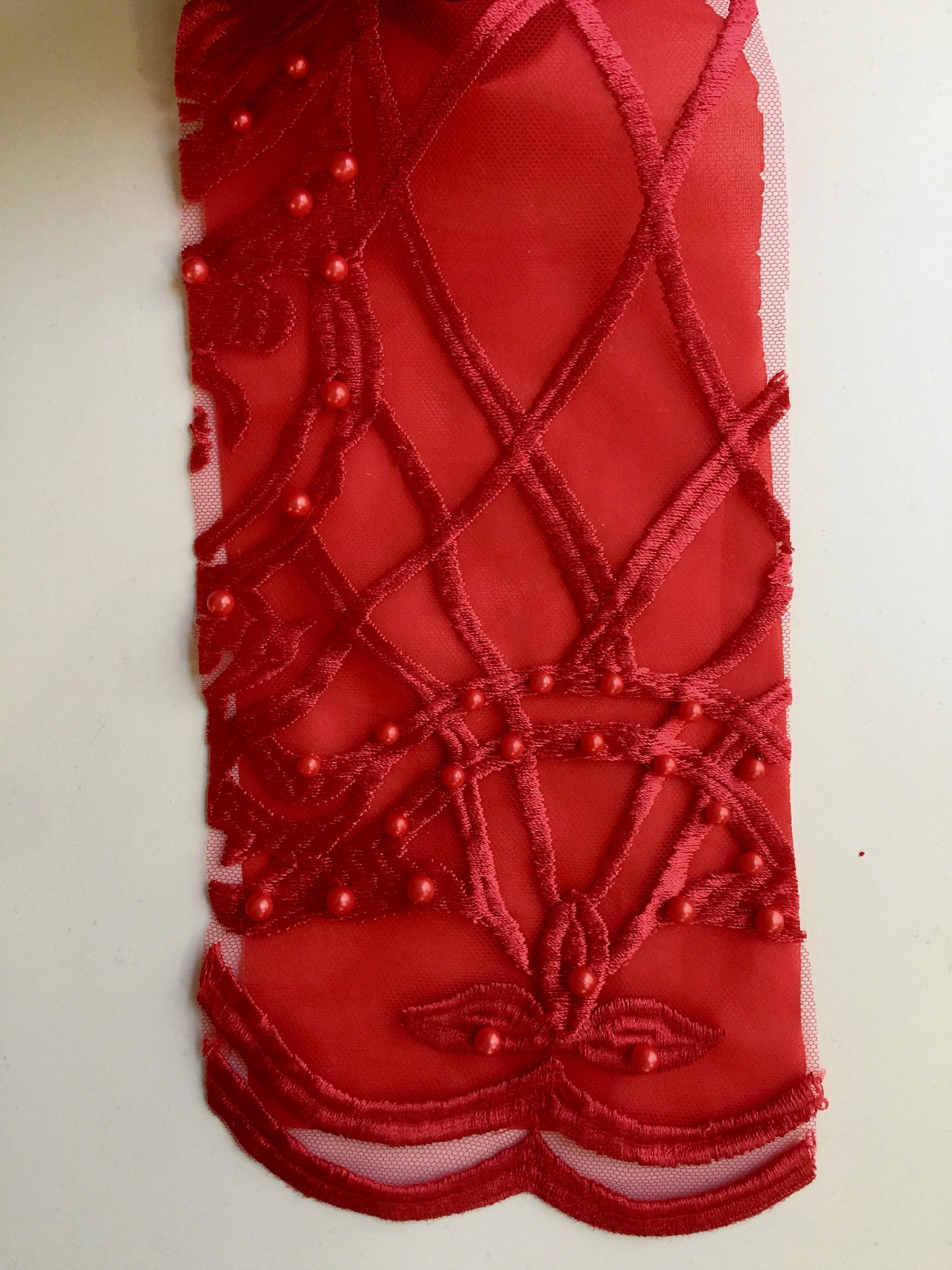 Sabrina RED Faux Pearls Beaded Lace Embroidery on Mesh Fabric by the Yard - 10098
