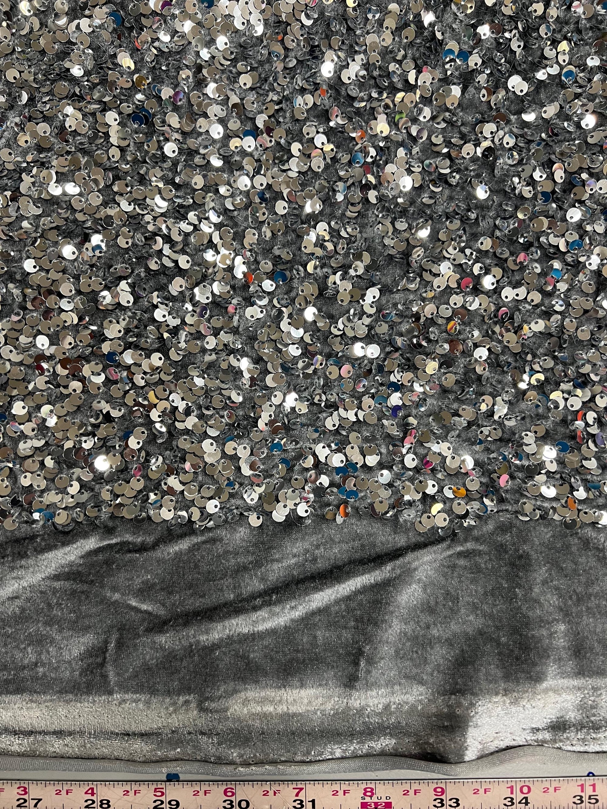 Stephanie SILVER Overlap Sequins on GREY Stretch Velvet Fabric by the Yard for Gowns, Dresses, Tops, Skirts, Costumes, Crafts - 10185