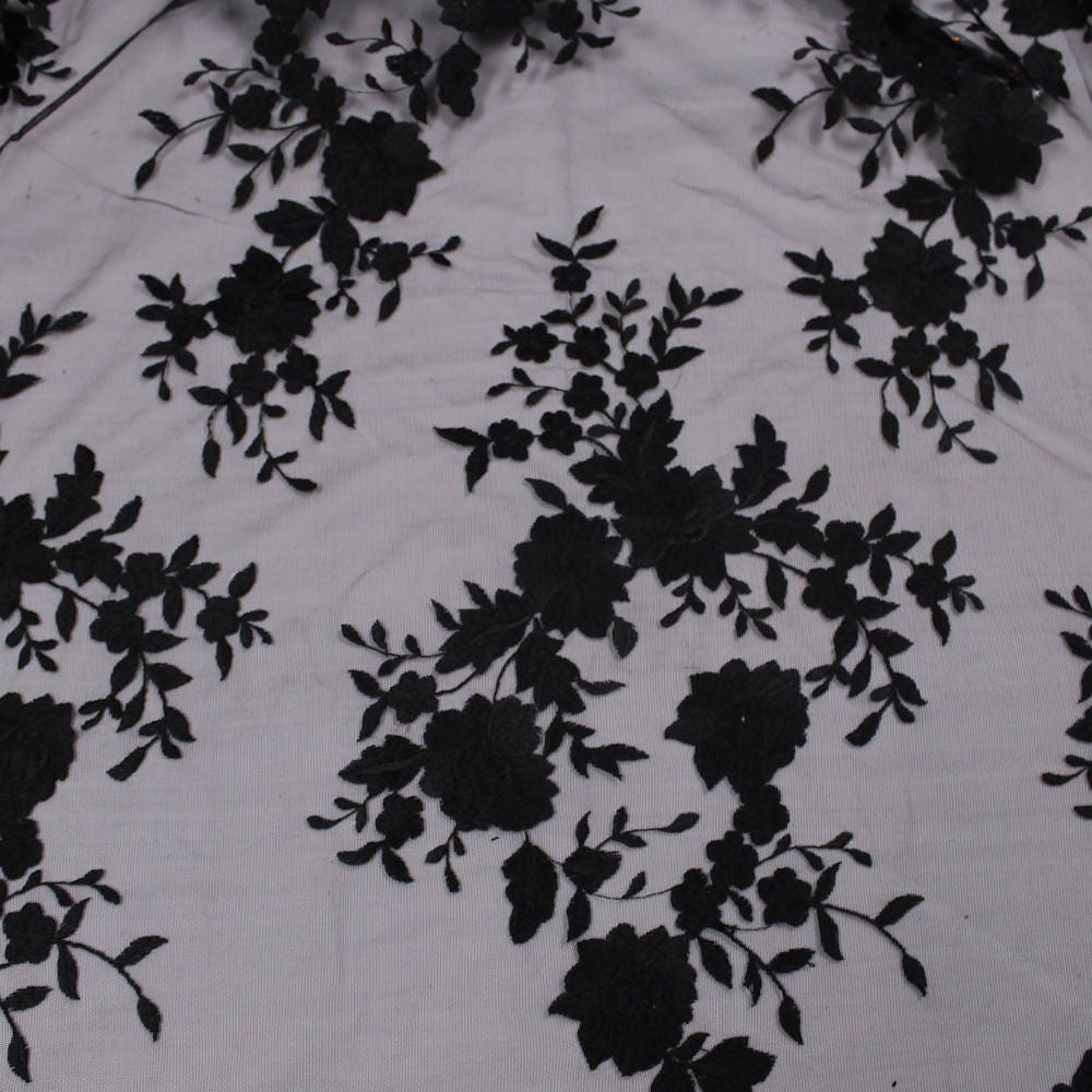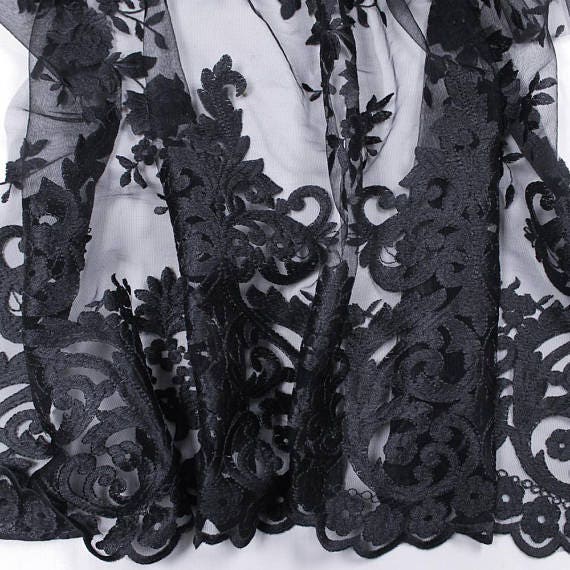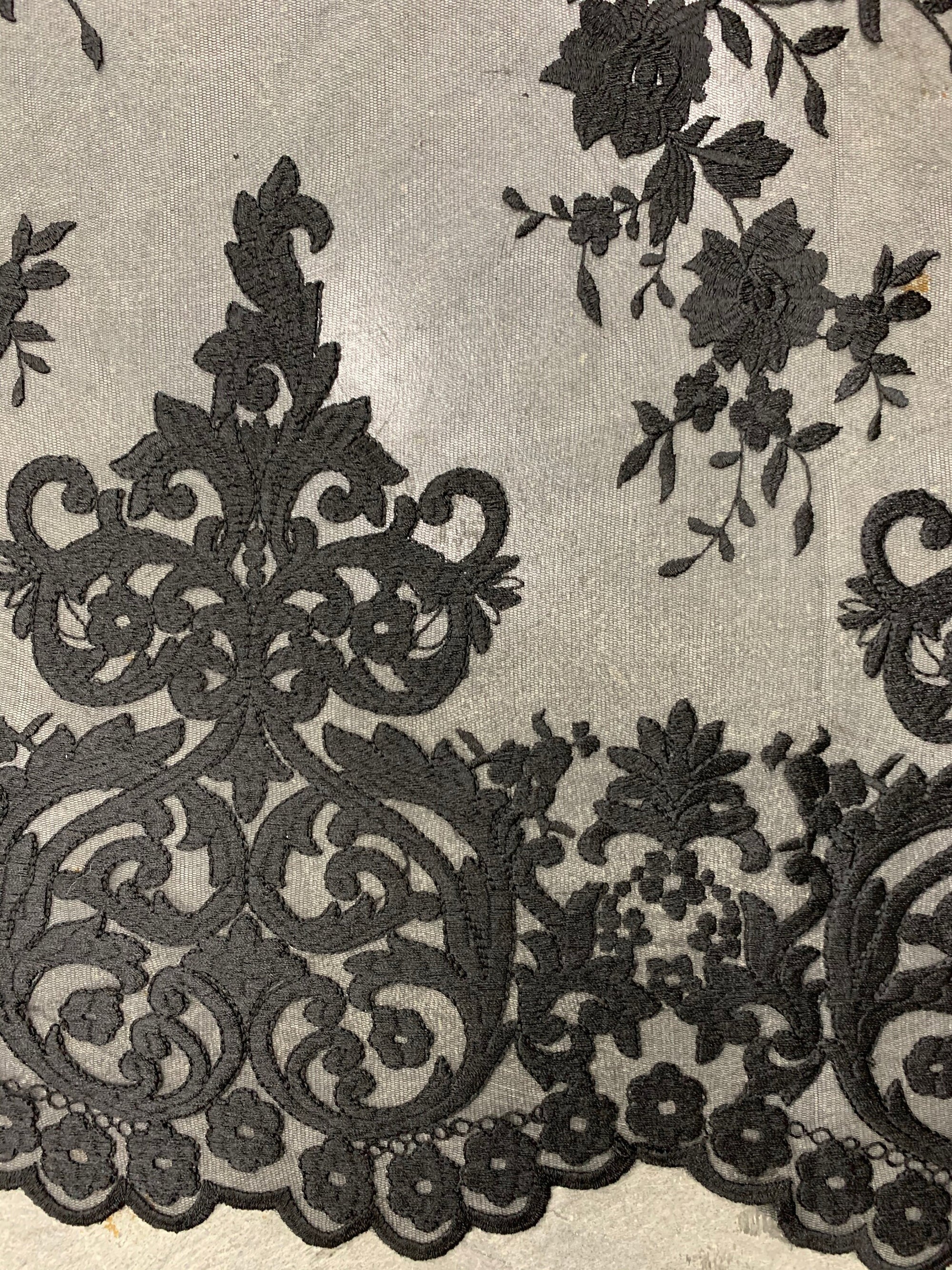 Teagan BLACK Damask Design Embroidered on Mesh Lace Fabric by the Yard - 10027