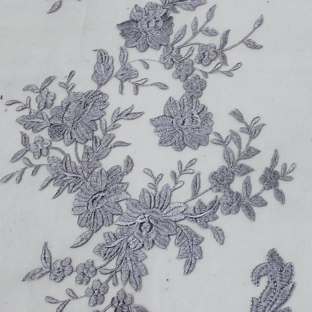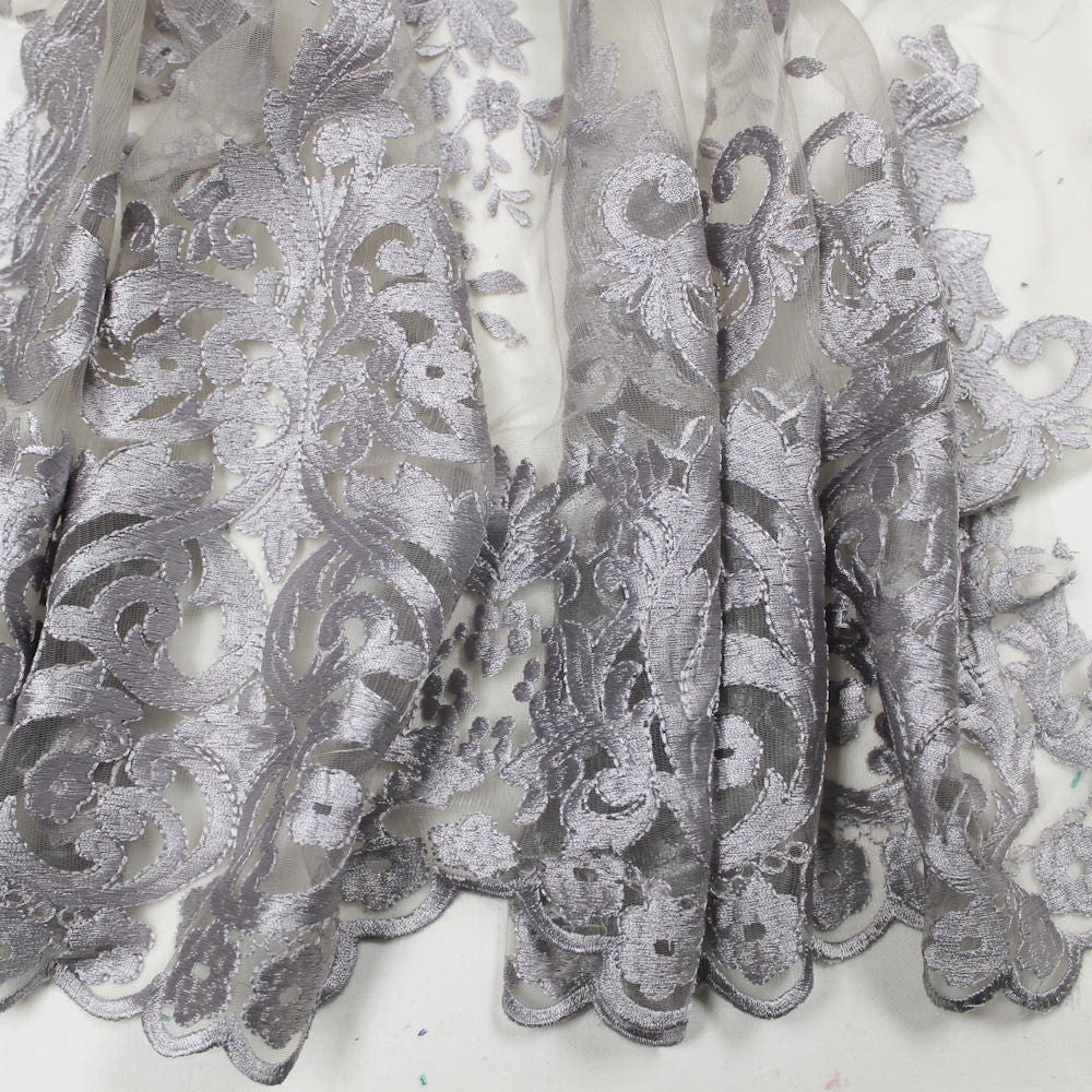 Teagan SILVER Damask Design Embroidered on Mesh Lace Fabric by the Yard - 10027