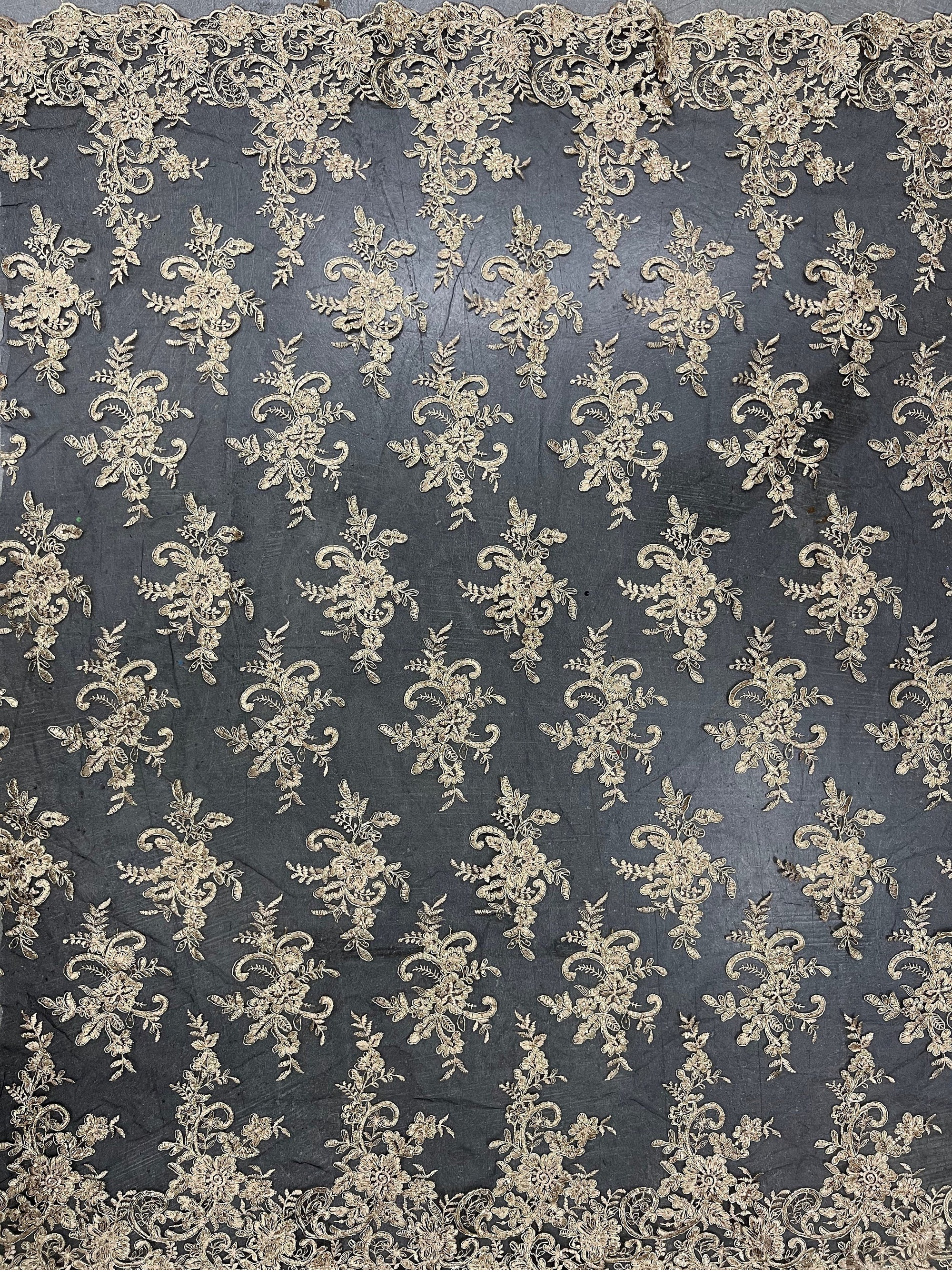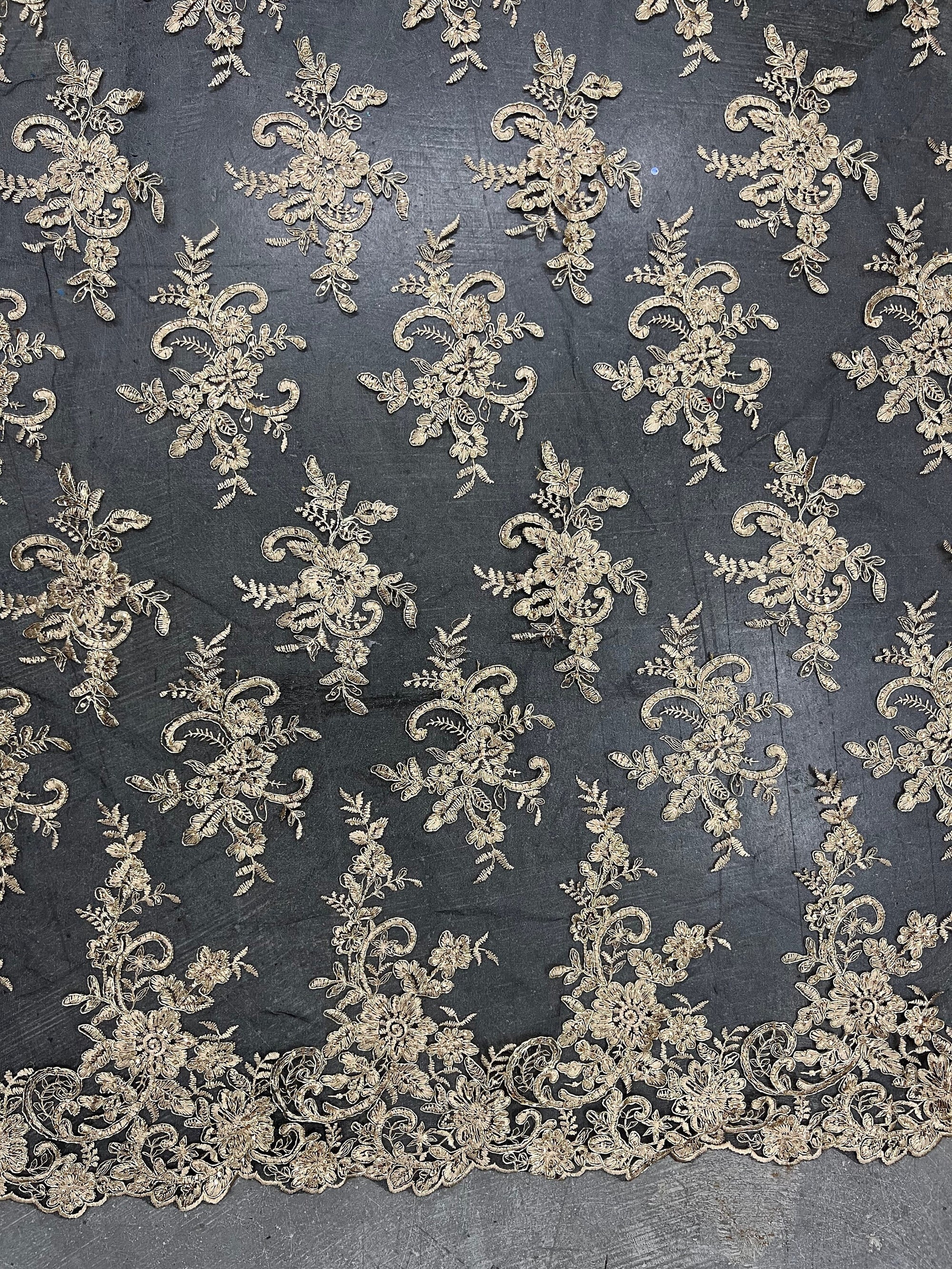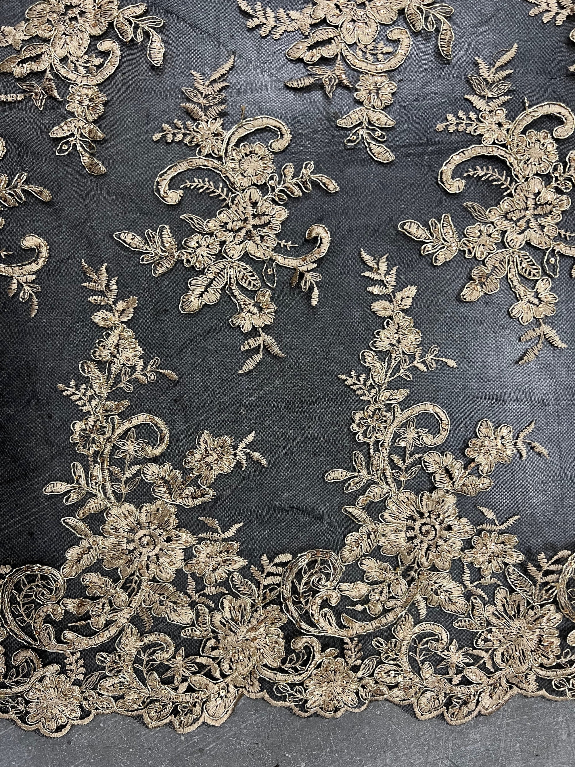 Tess GOLD Polyester Floral Embroidery with Sequins on BLACK Mesh Lace Fabric by the Yard - 10216