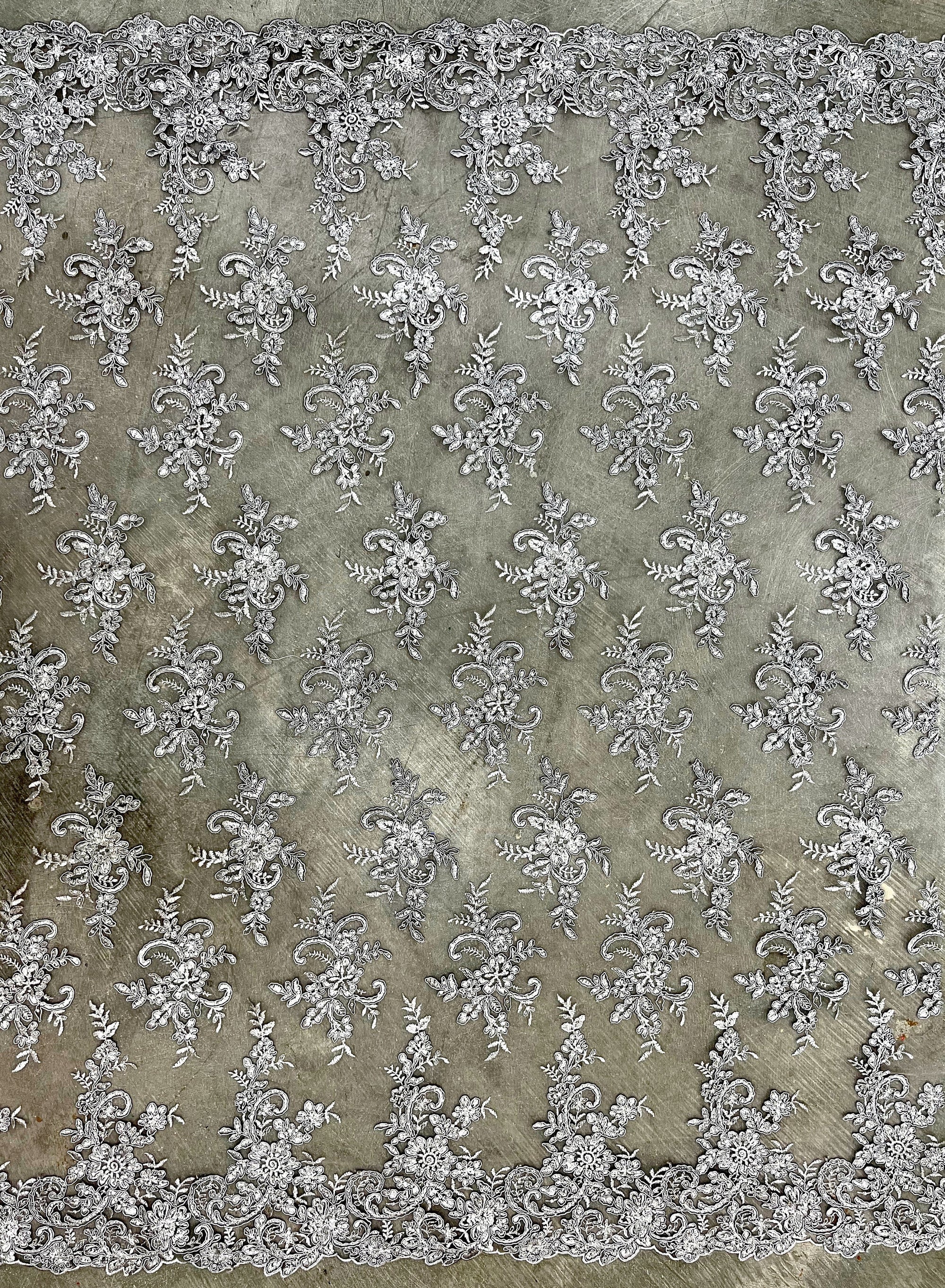 Content: 100% polyester Stretch: Minimal to none Width: 50 to 52 inches Edge: Scalloped on both edges Uses: Wedding dress, evening gown, formal wear, tops, skirts, costumes, crafts, etc.