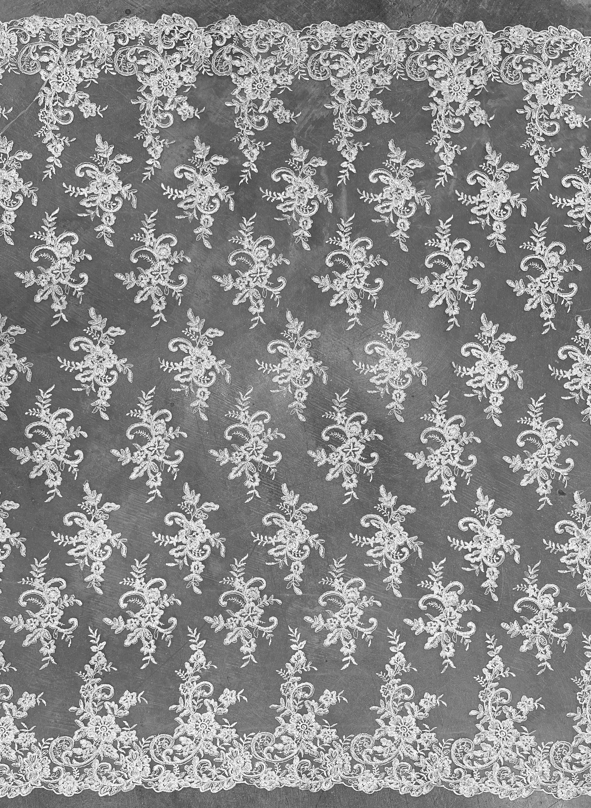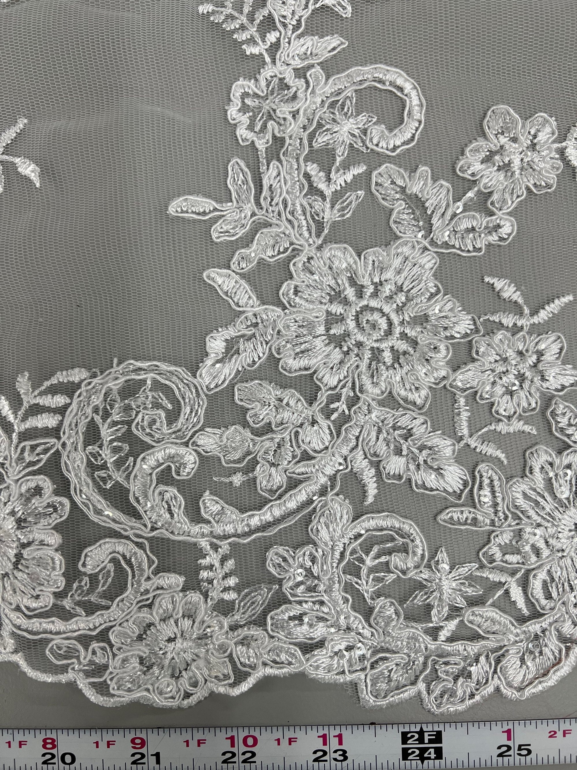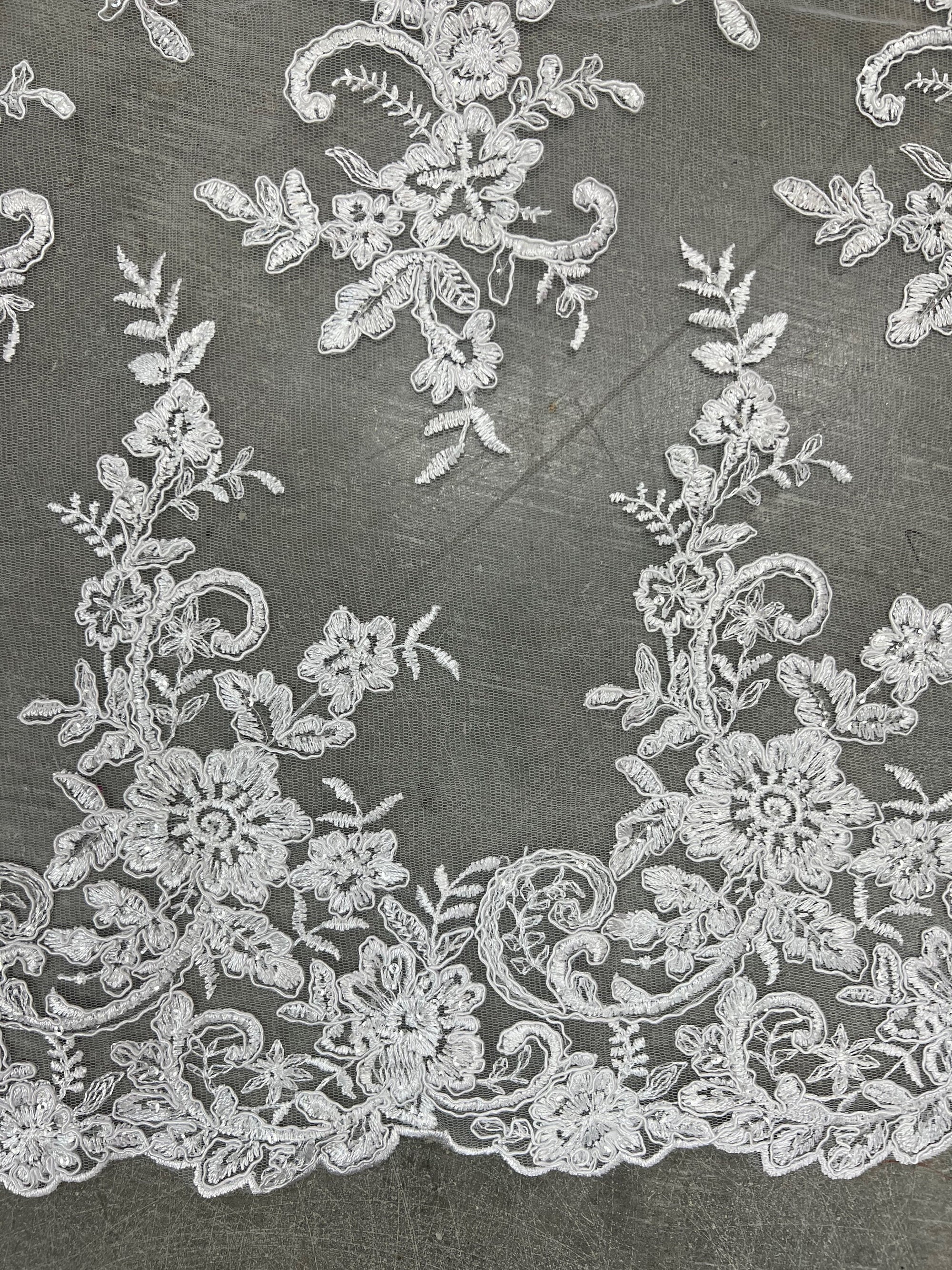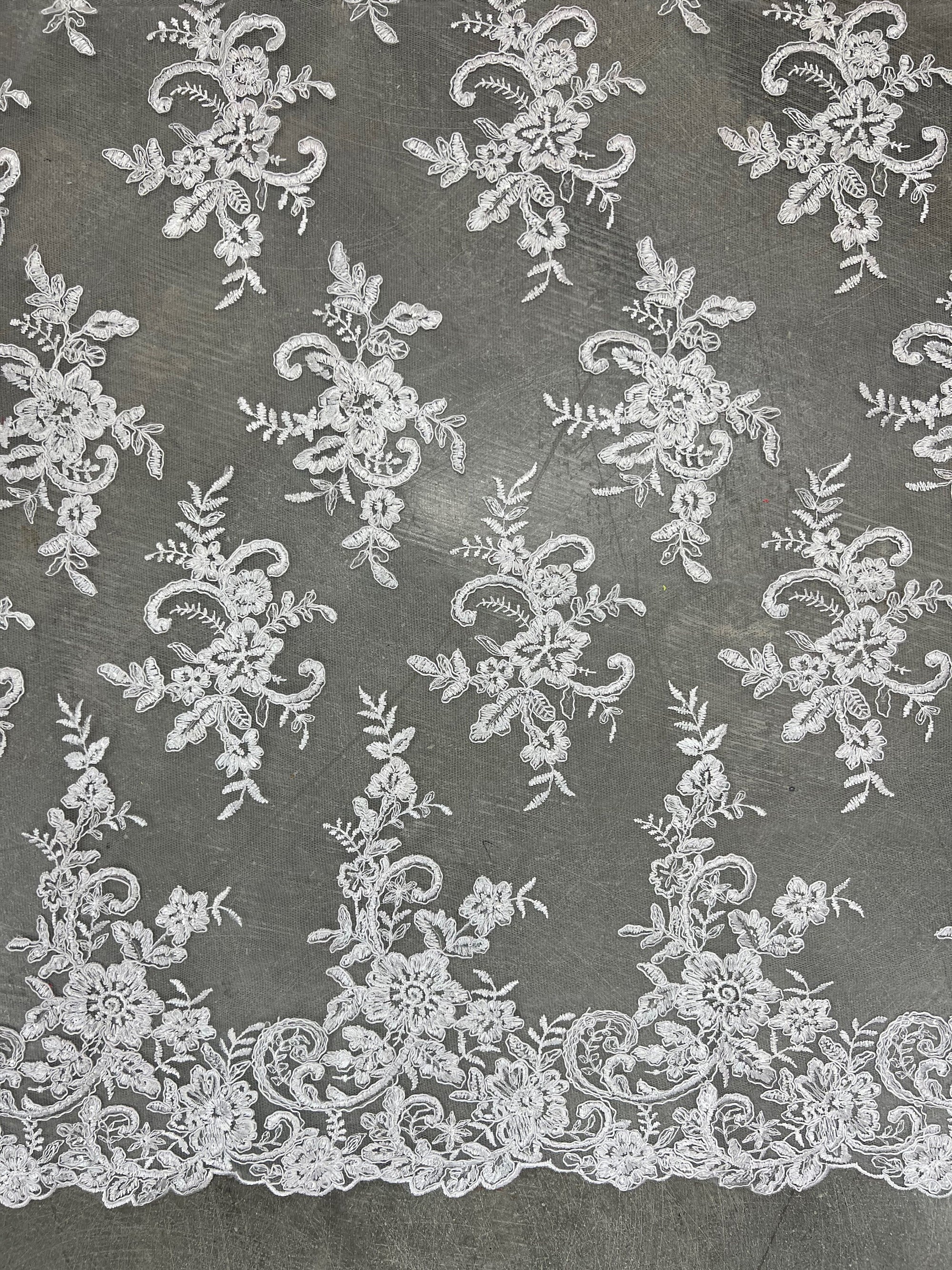 Content: 100% polyester Stretch: Minimal to none Width: 50 to 52 inches Edge: Scalloped on both edges Uses: Wedding dress, evening gown, formal wear, tops, skirts, costumes, crafts, etc.