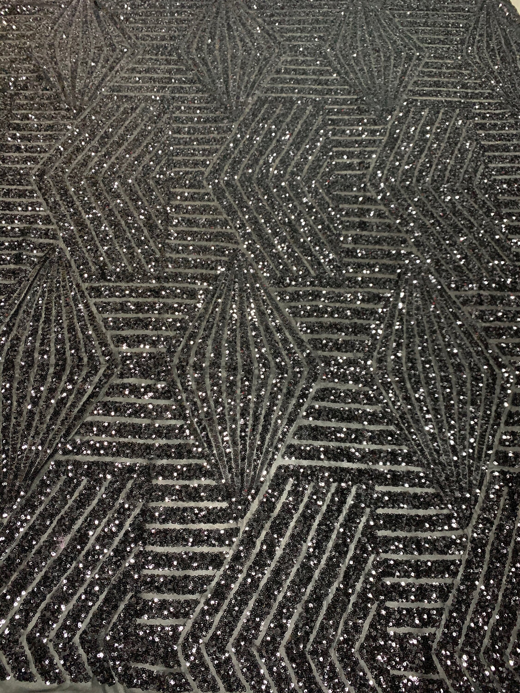 Thea BLACK Geometric Sequins Diamond & Stripes on Mesh Lace Fabric by the Yard - 10026
