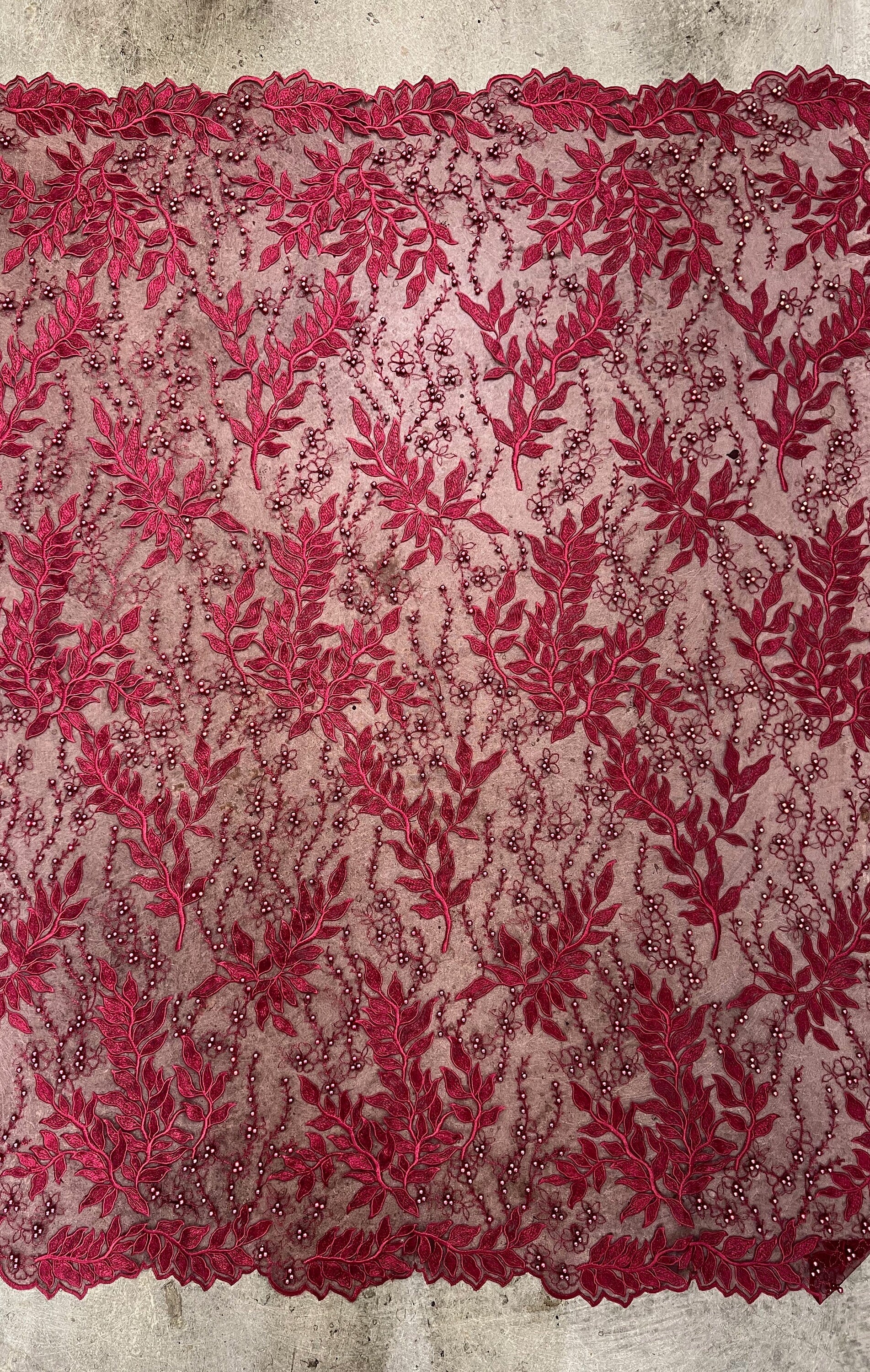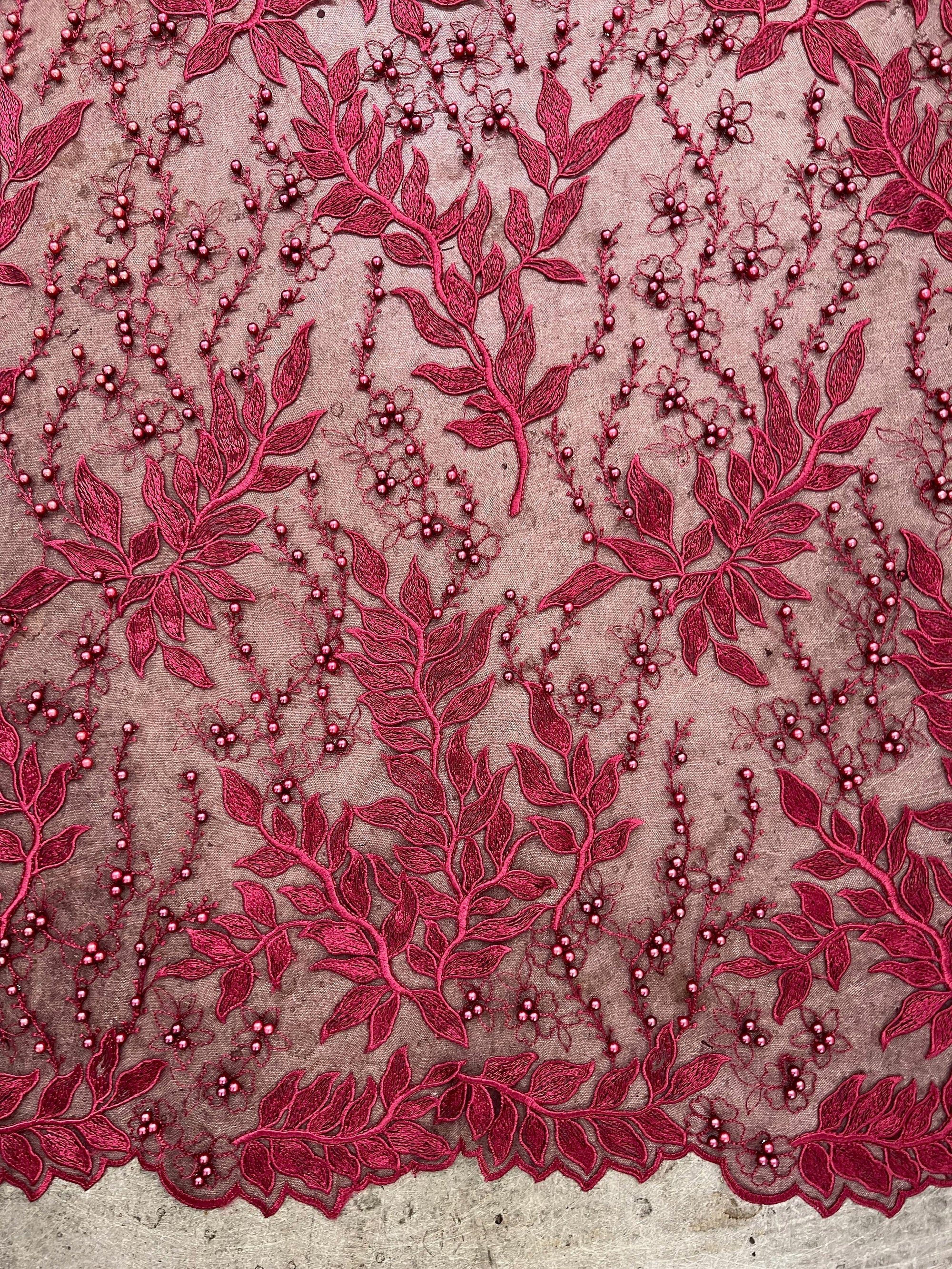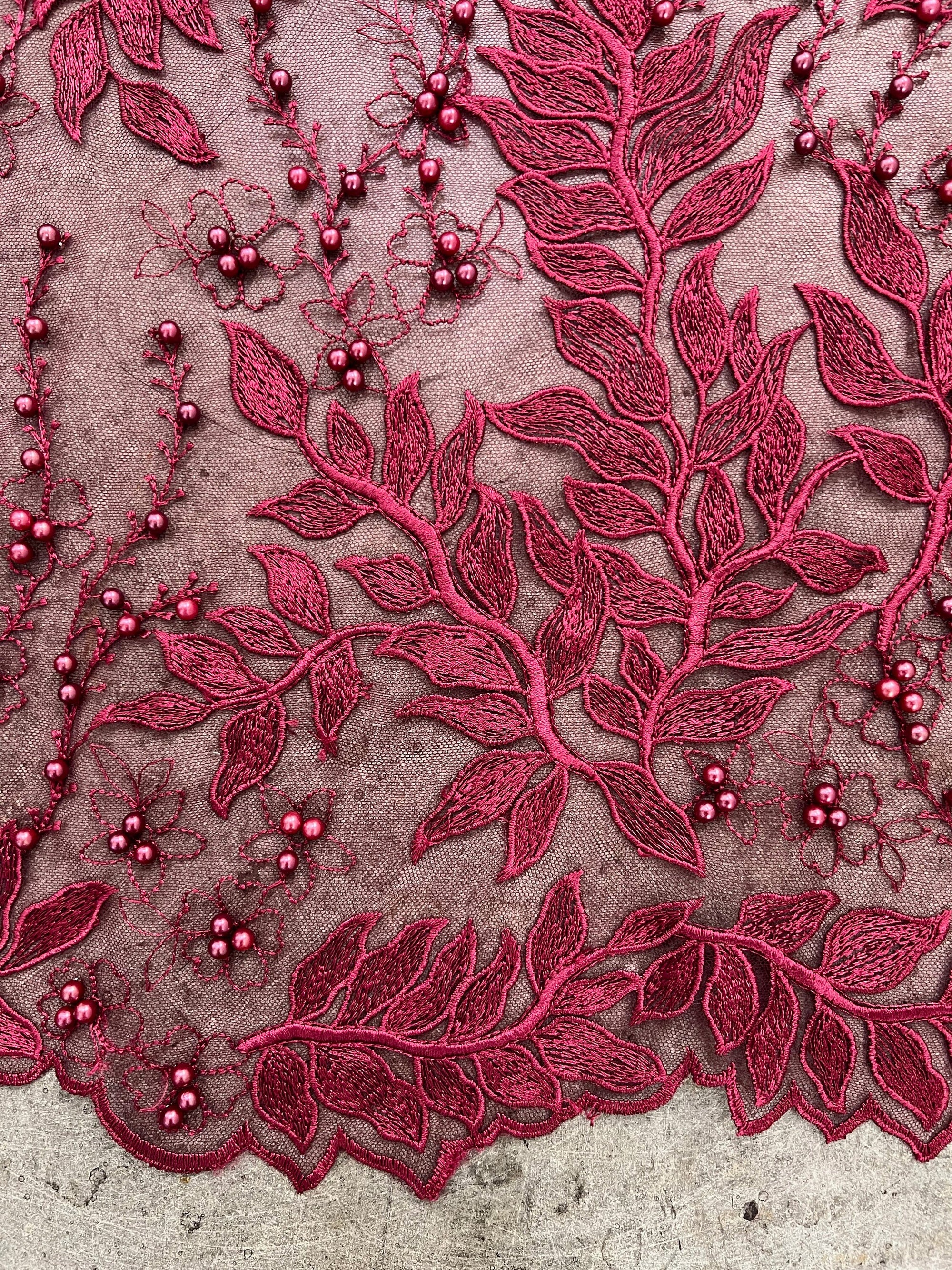 Veronica BURGUNDY Faux Pearls Beaded Flowers and Leaves Lace Embroidery on Mesh Fabric by the Yard - 10100