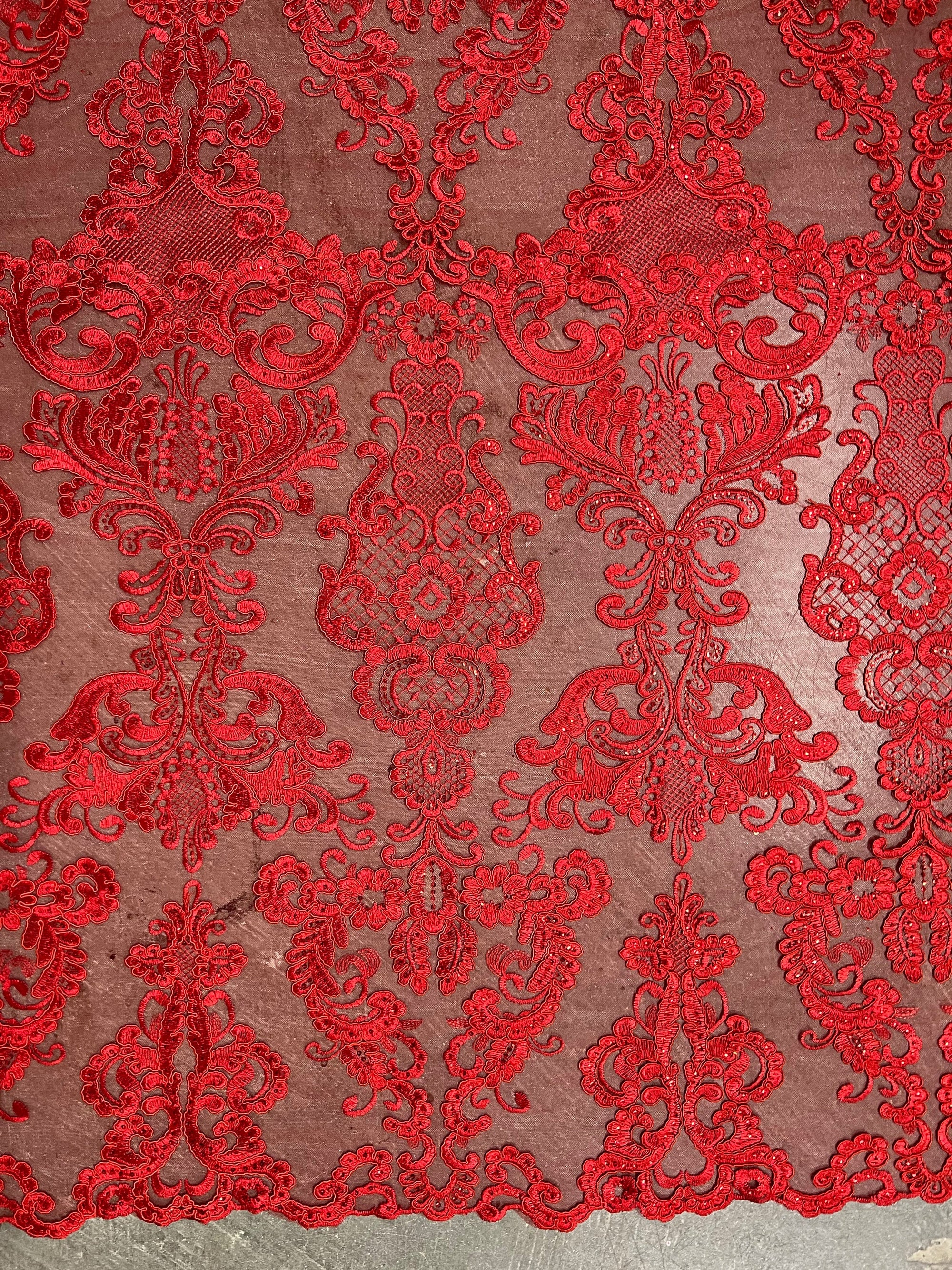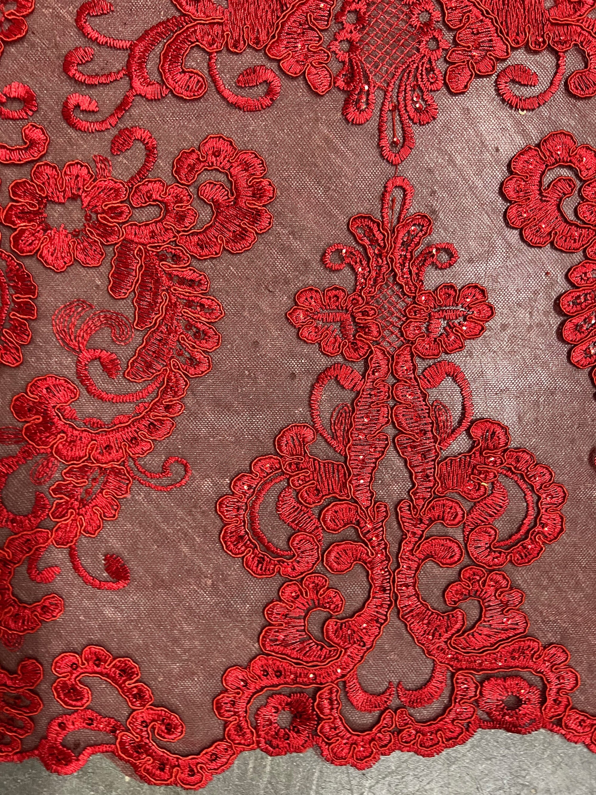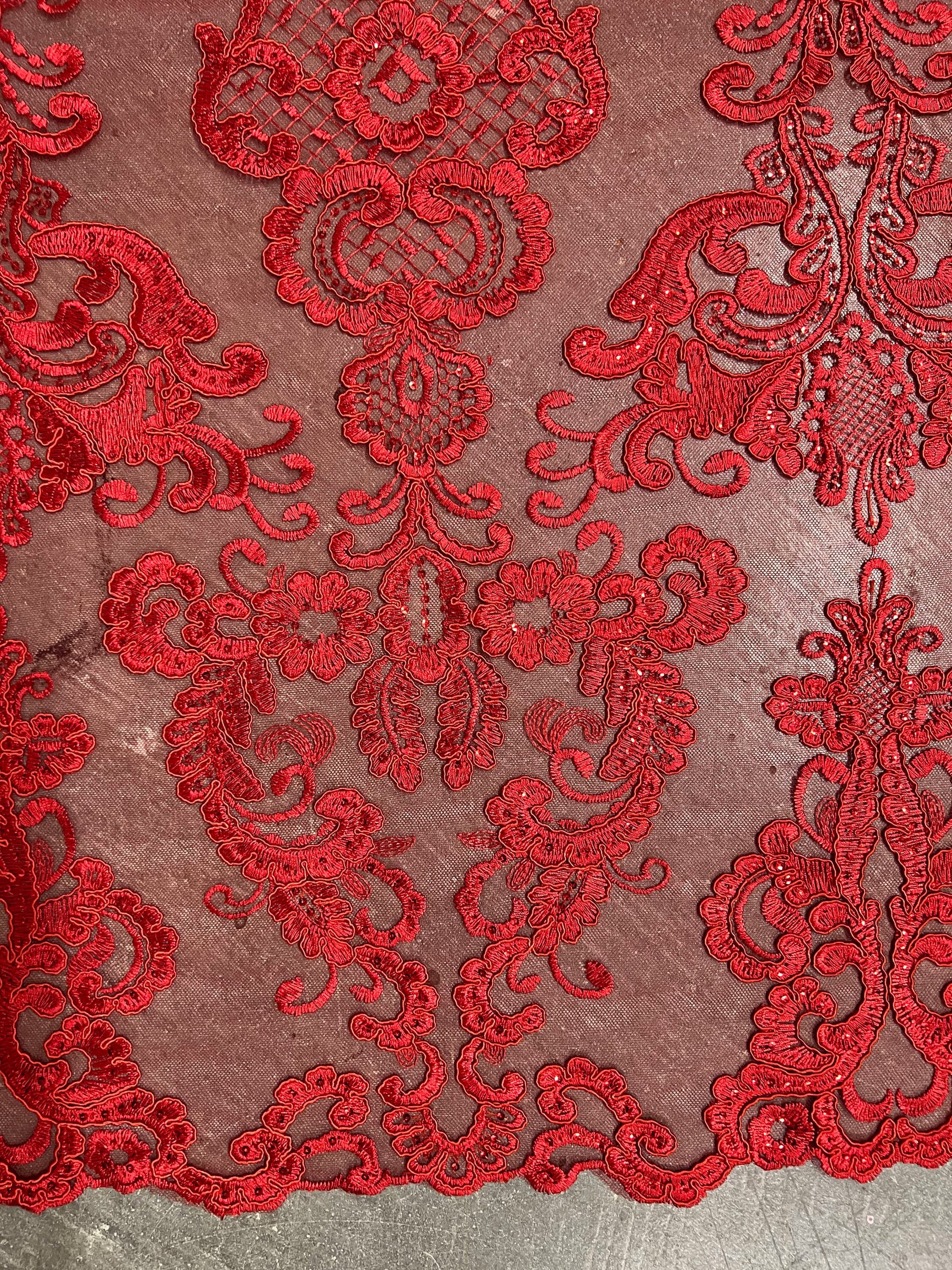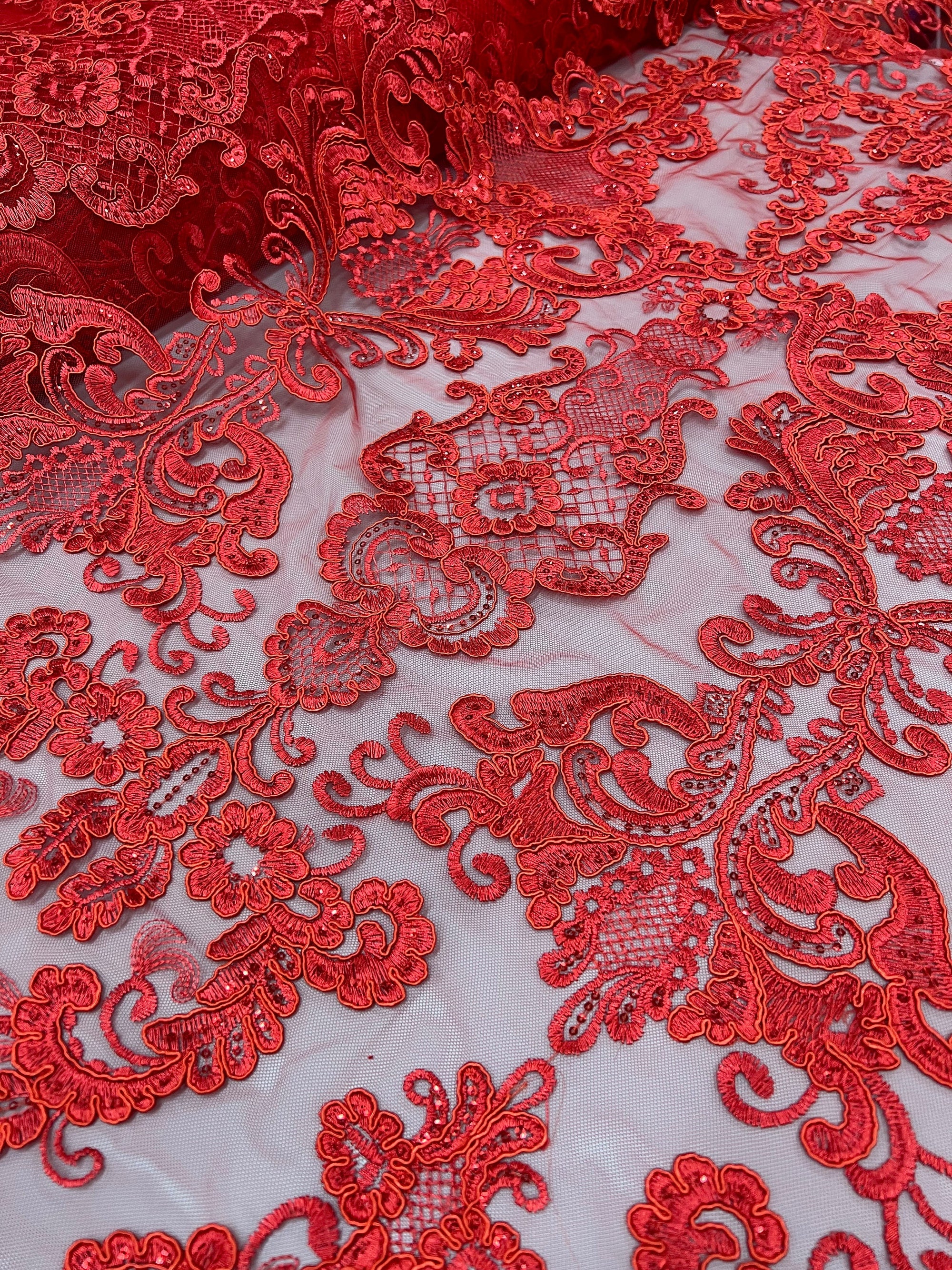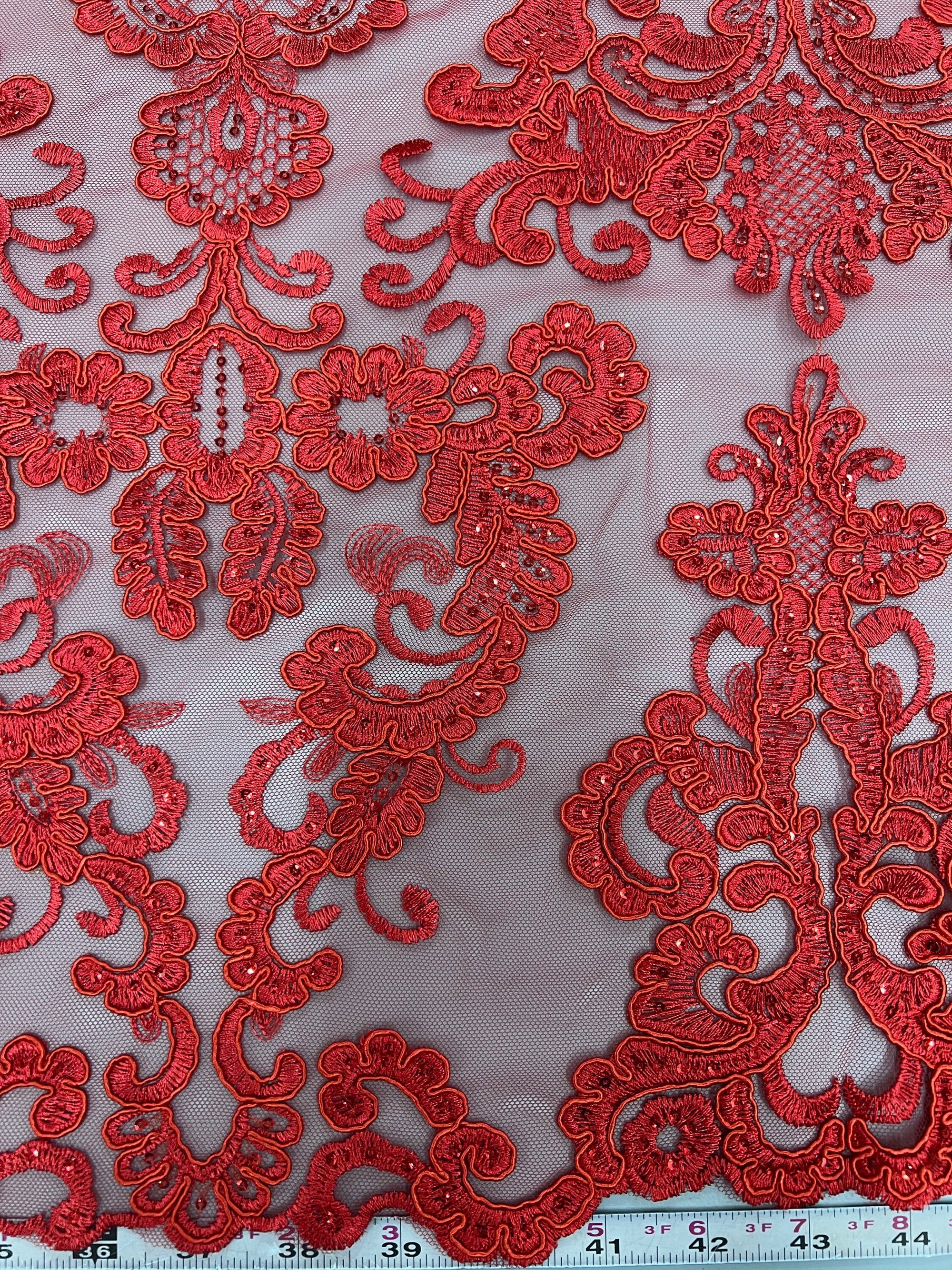 Vivian RED Polyester Embroidery with Sequins on Mesh Lace Fabric by the Yard for Gown, Wedding, Bridesmaid, Prom - 10003